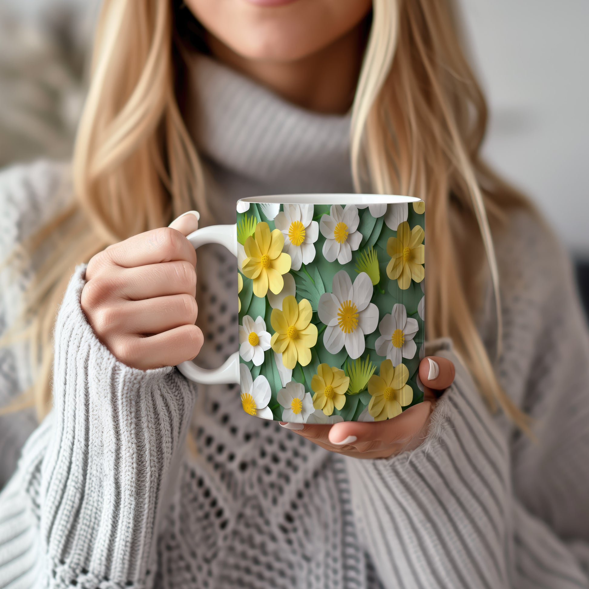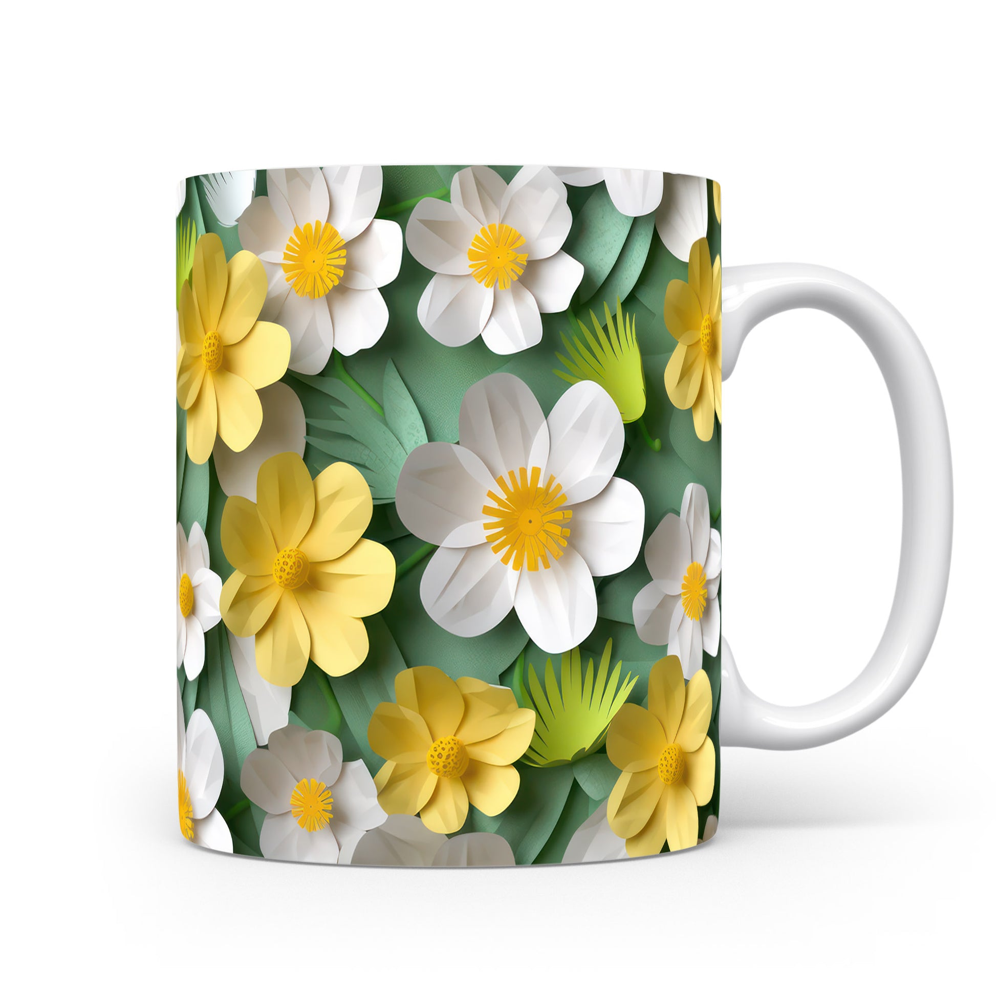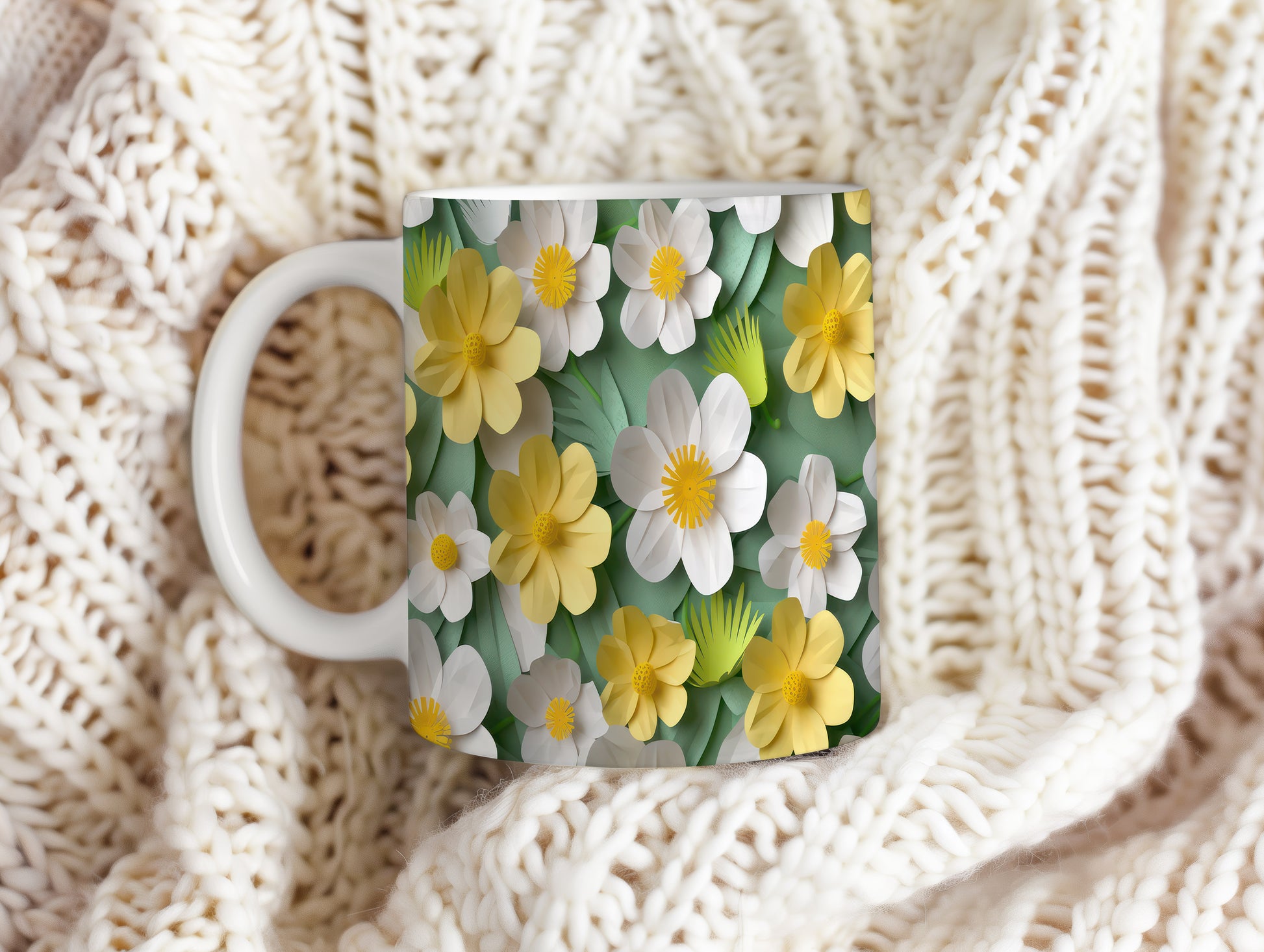 Hrnek s veselými květinami v bílých a žlutých tónech