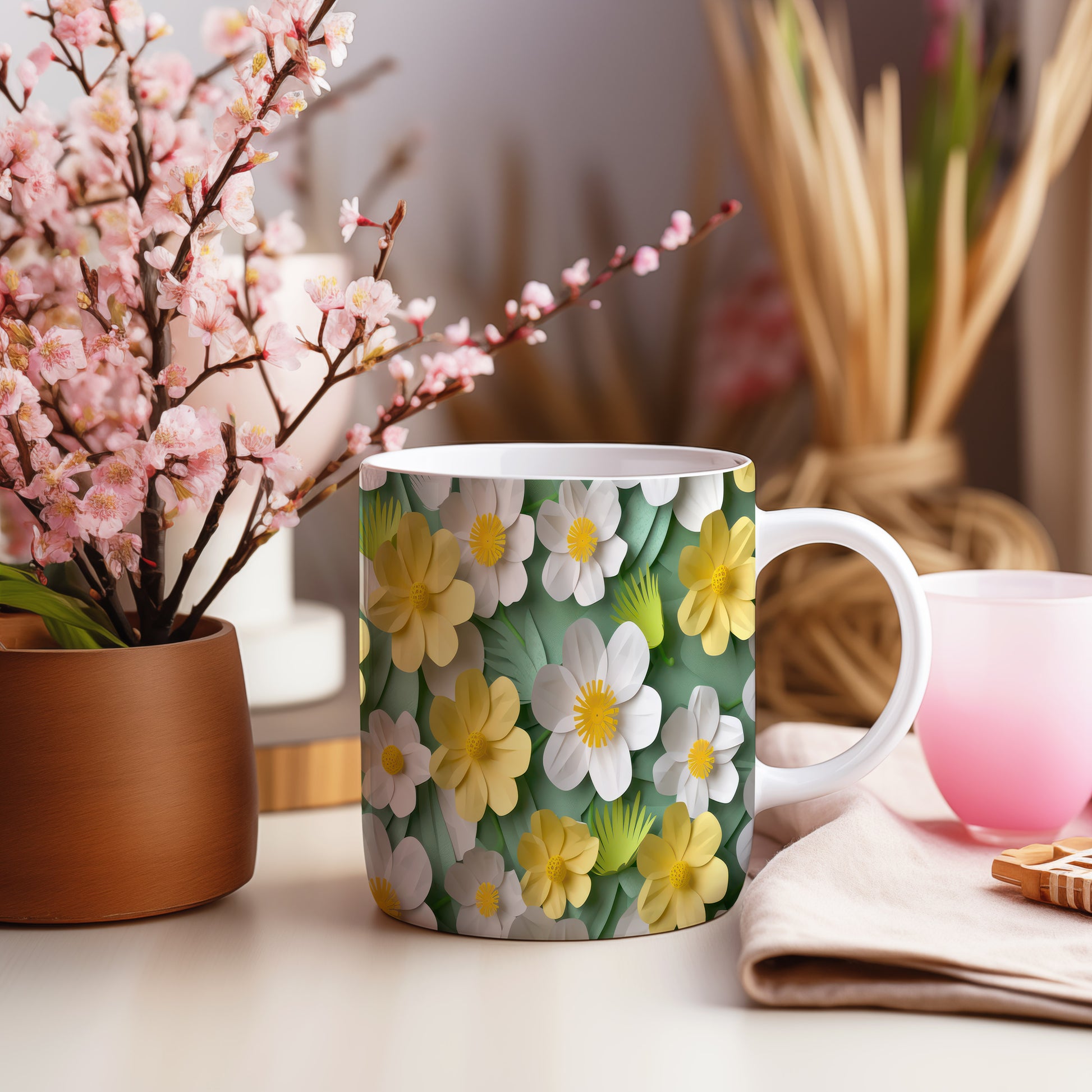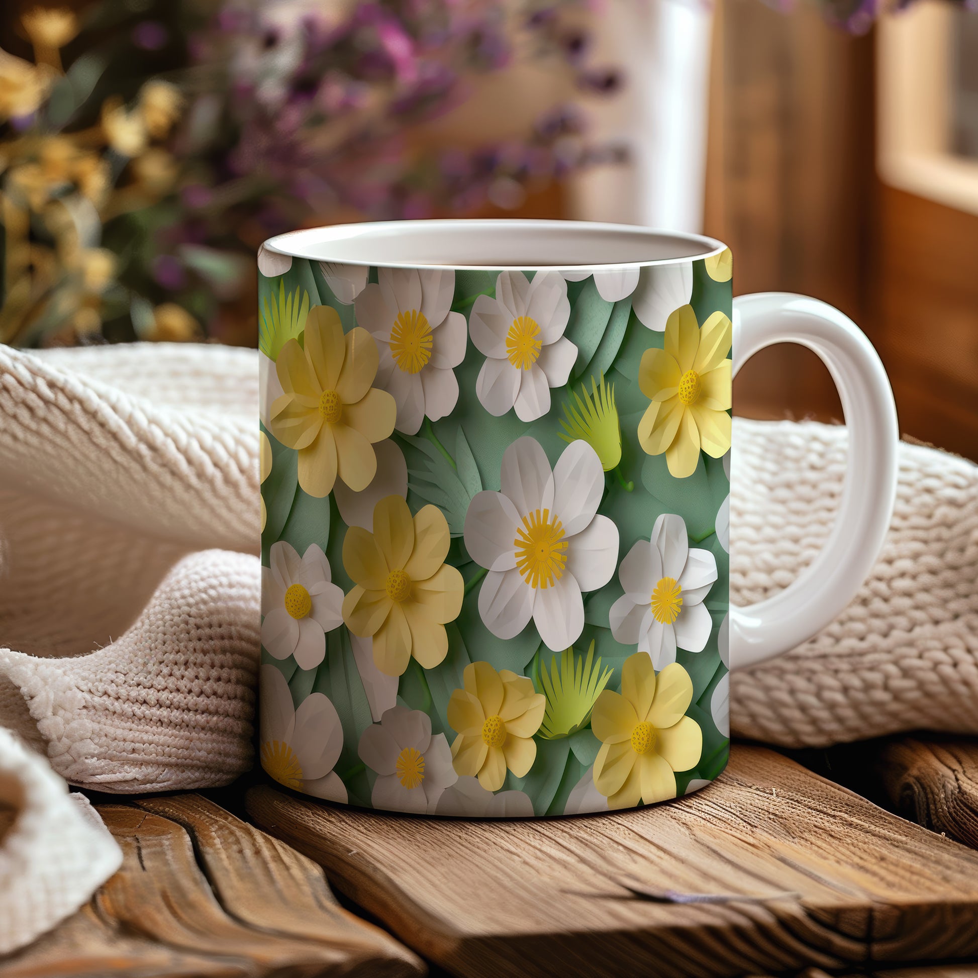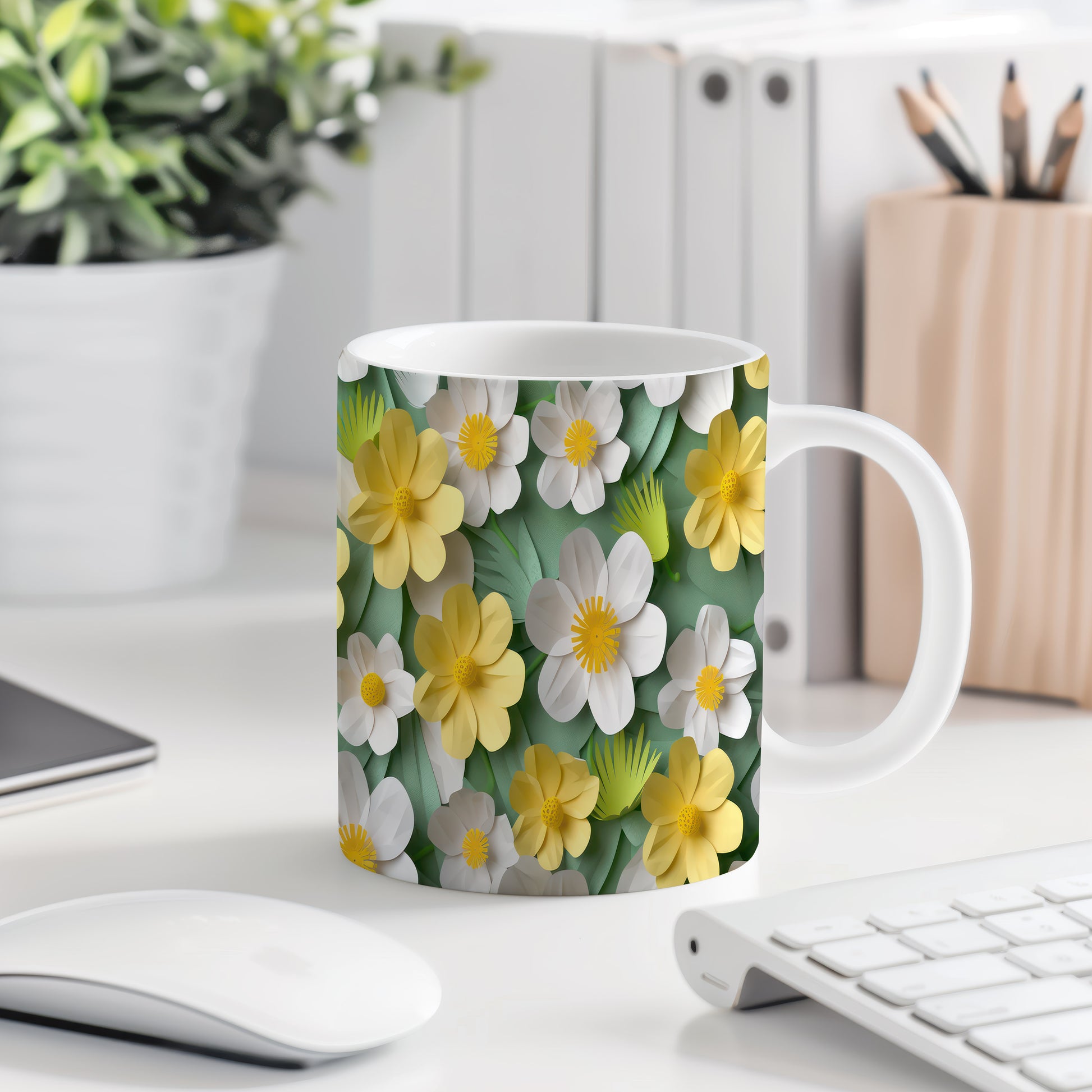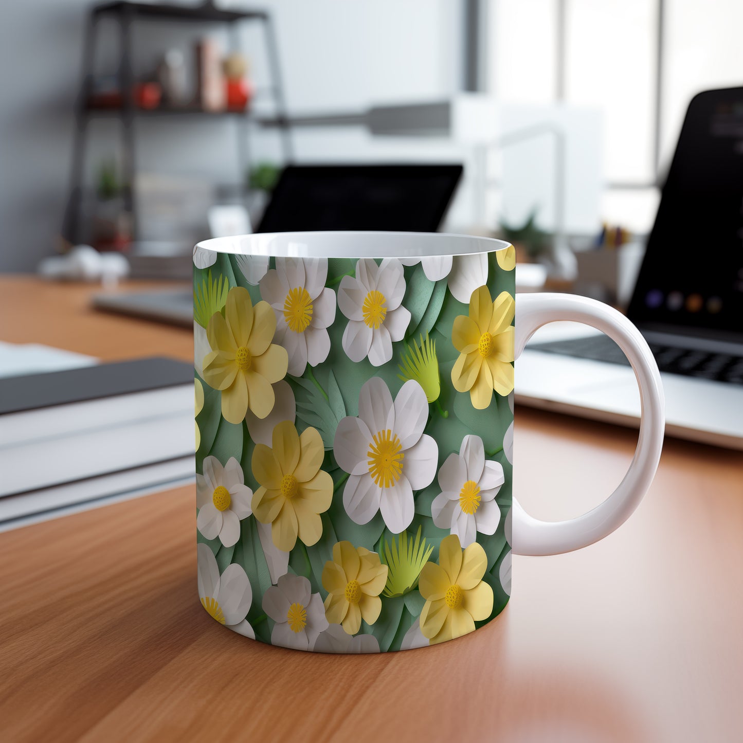 Hrnek s veselými květinami v bílých a žlutých tónech