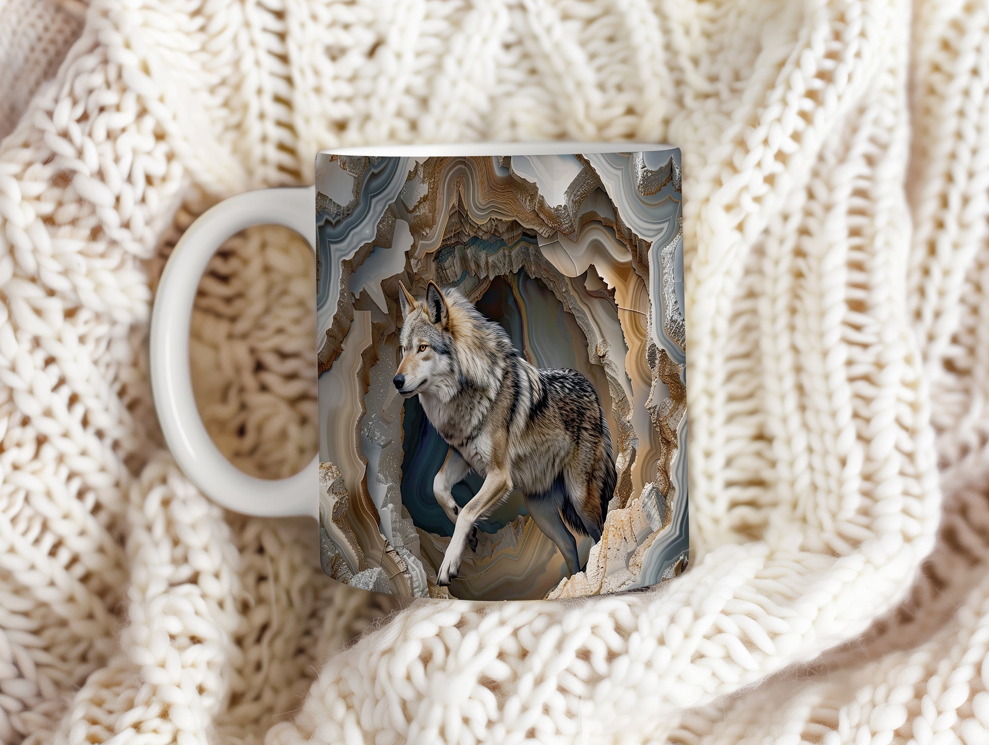 Hrnek s vlkem v jeskyni – černobílým motivem