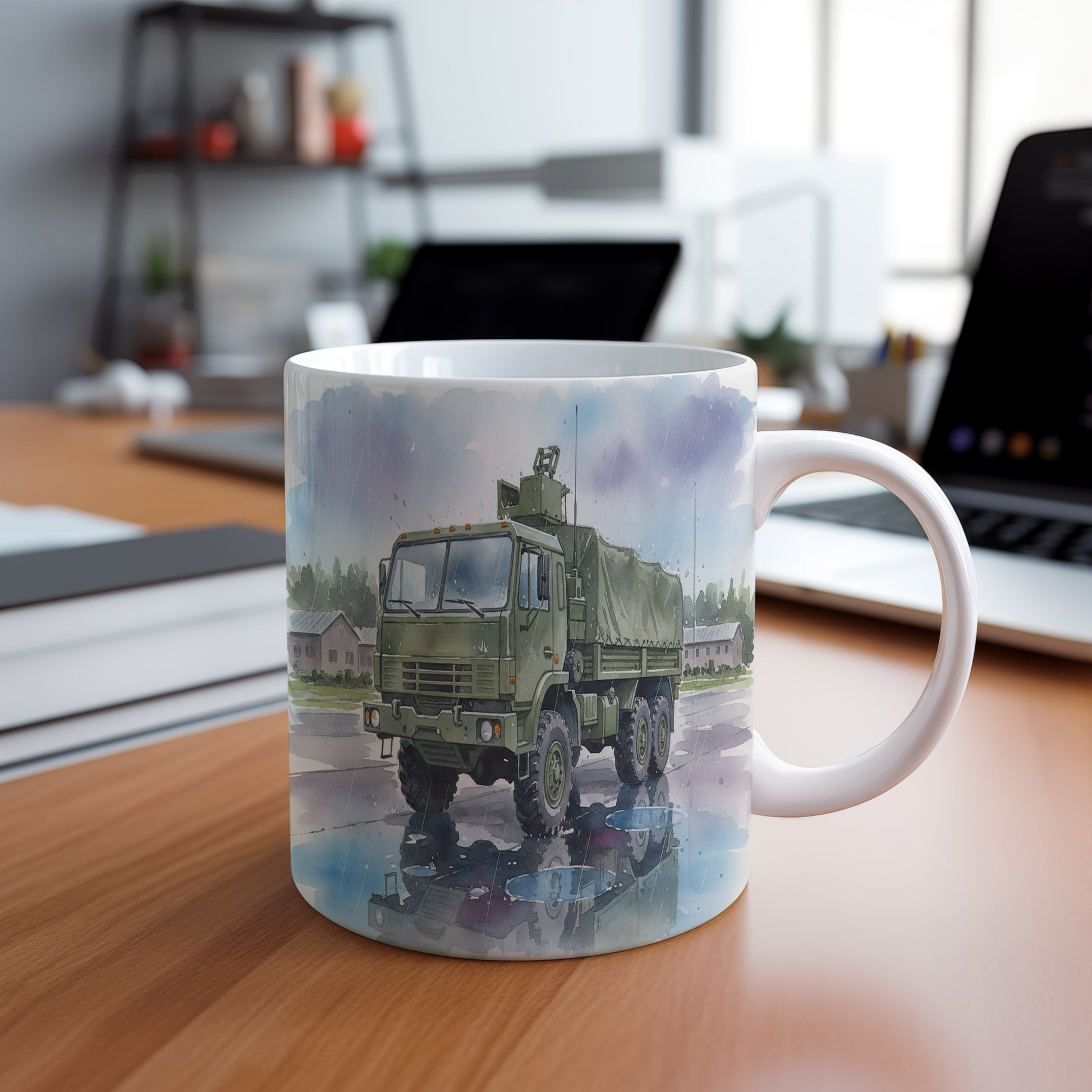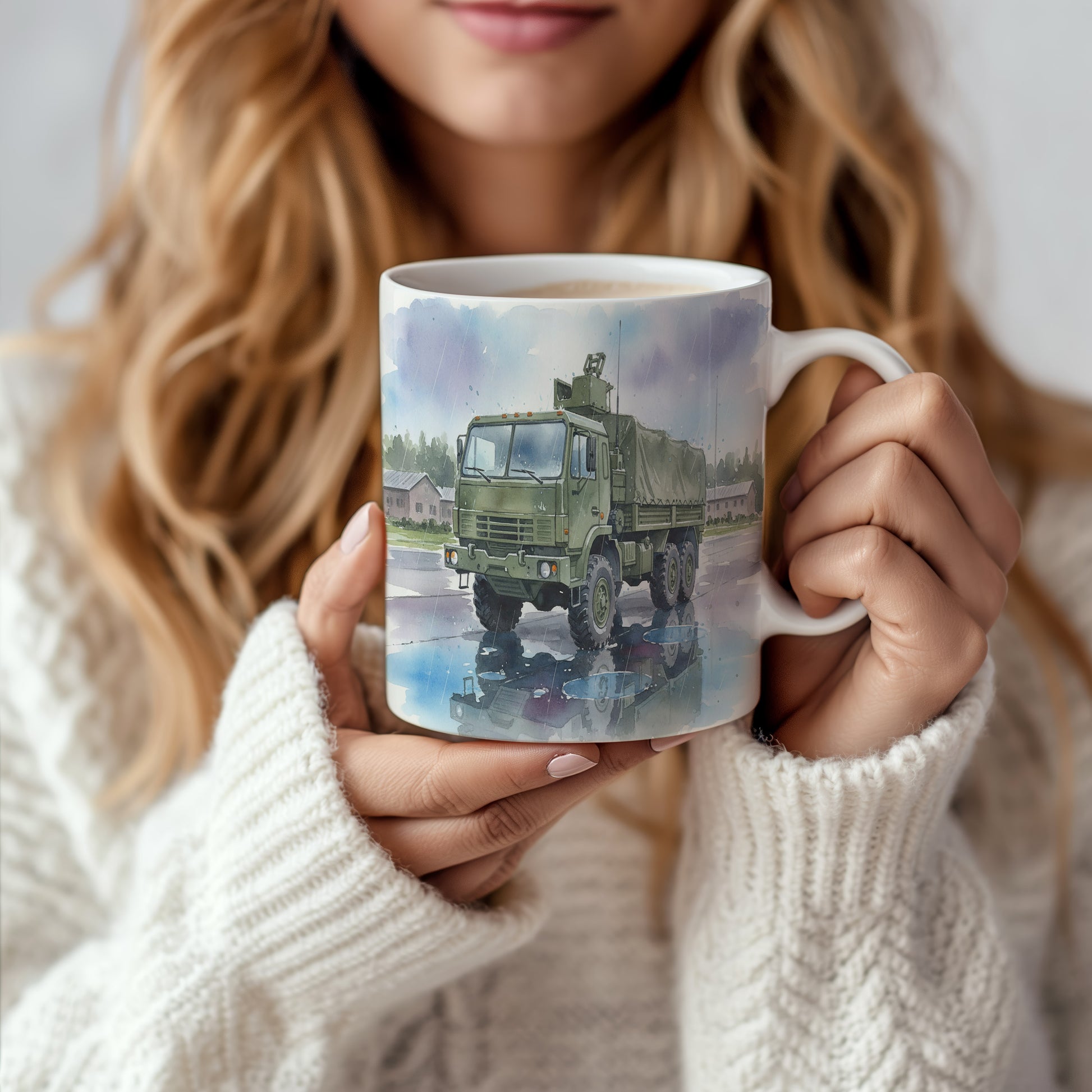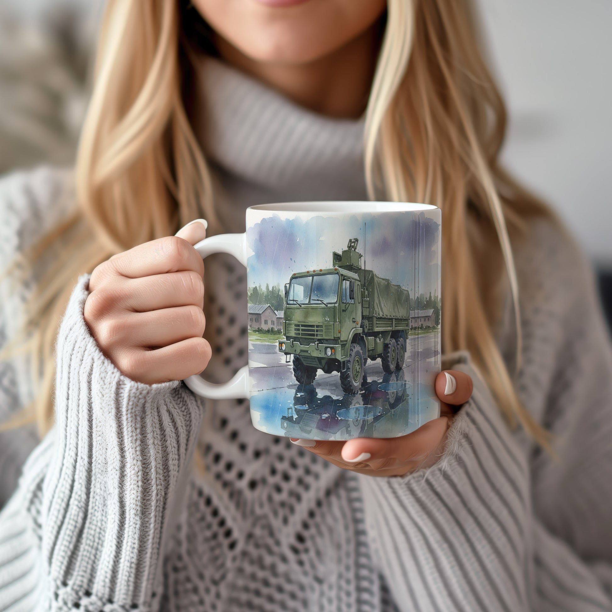 Unikátní hrnek s akvarelovým motivem vojenského vozu zachyceného v dešti. Skvělý pro milovníky techniky a umění. Hrnek 330 ml – vhodný do myčky i mikrovlnky.
