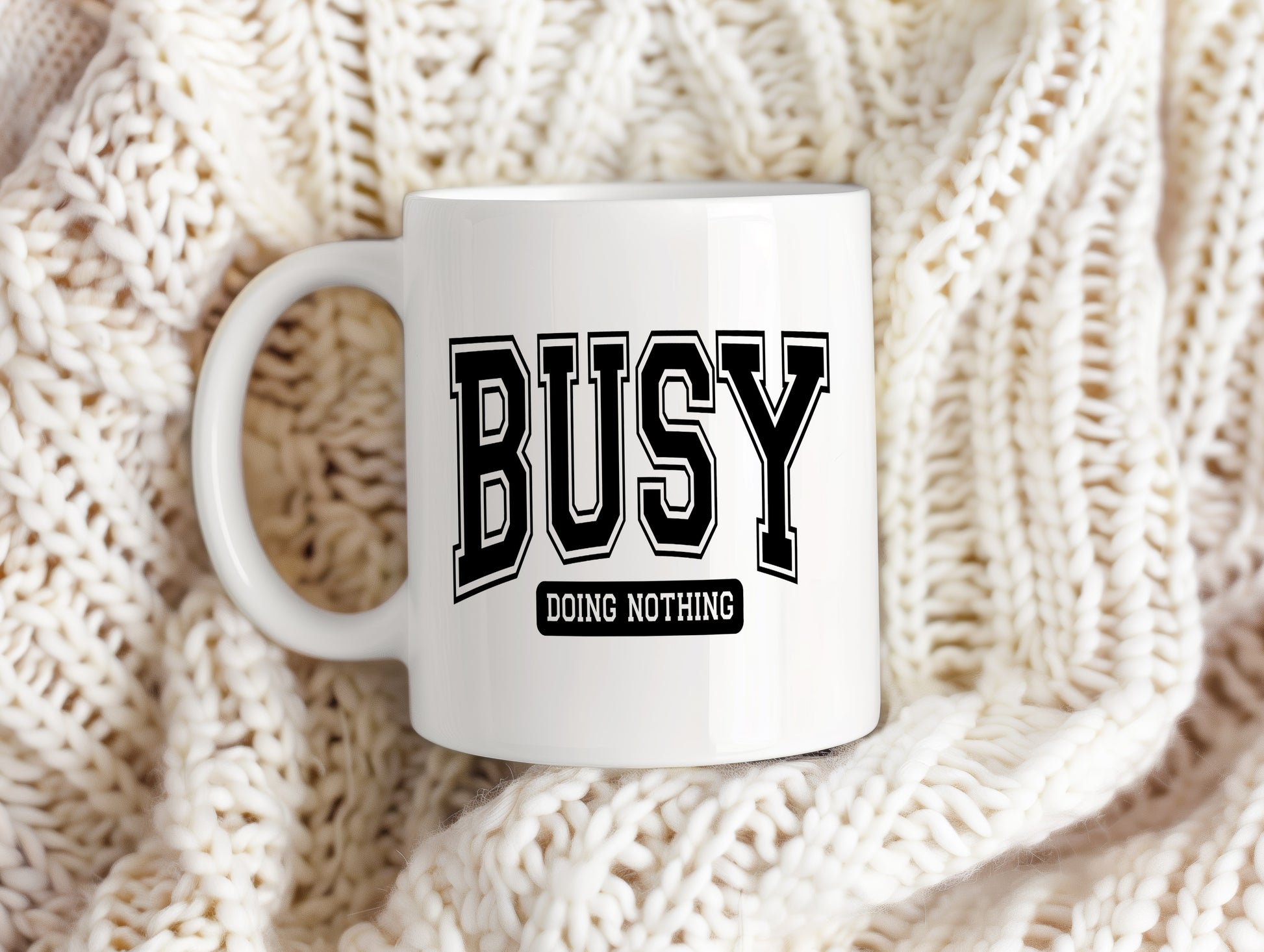 Bílý hrnek s vtipným nápisem 'BUSY DOING NOTHING' je ideální pro ty, kteří si umí užívat klidné chvíle.