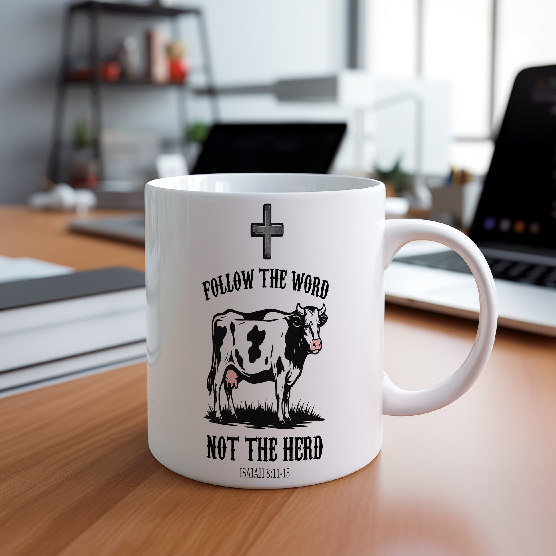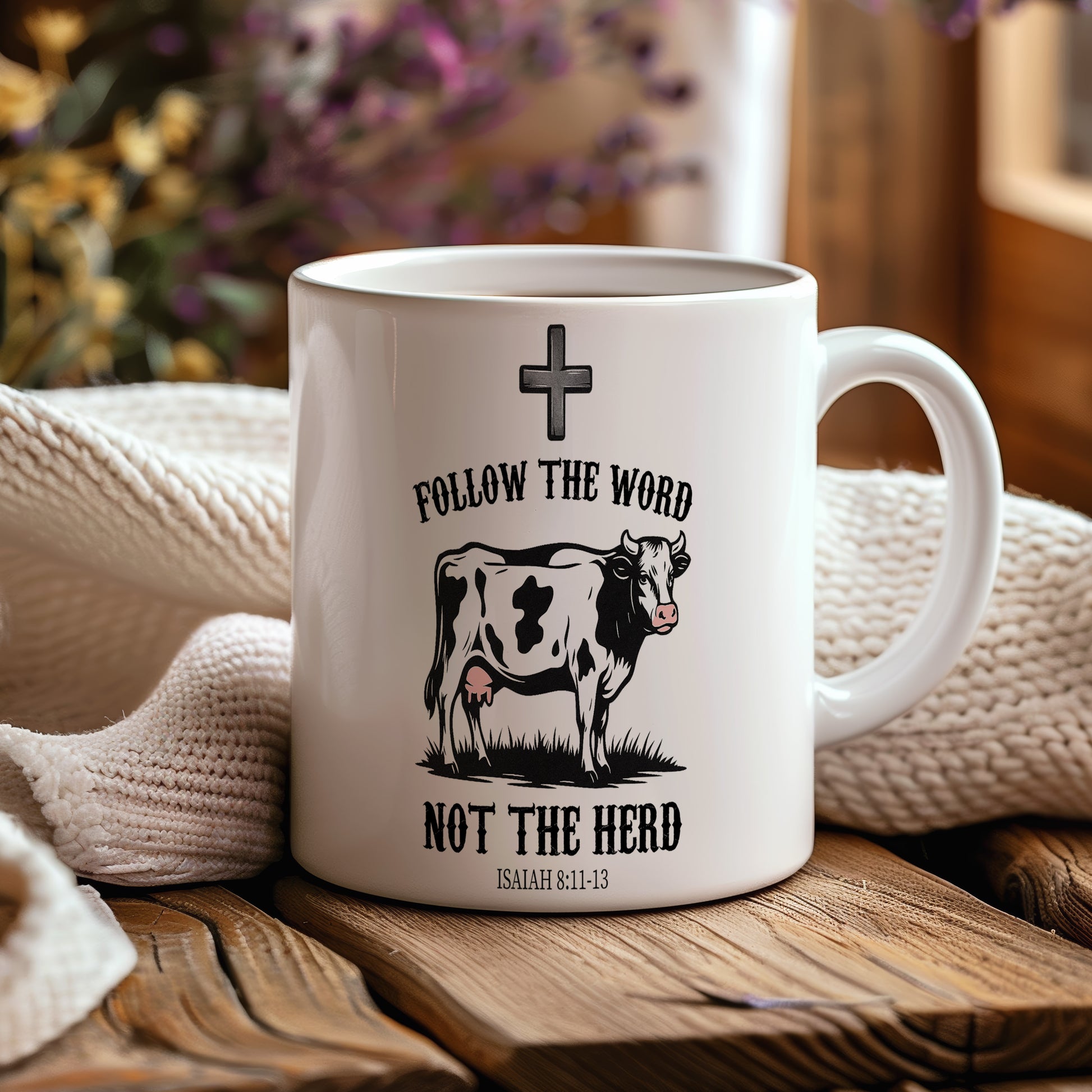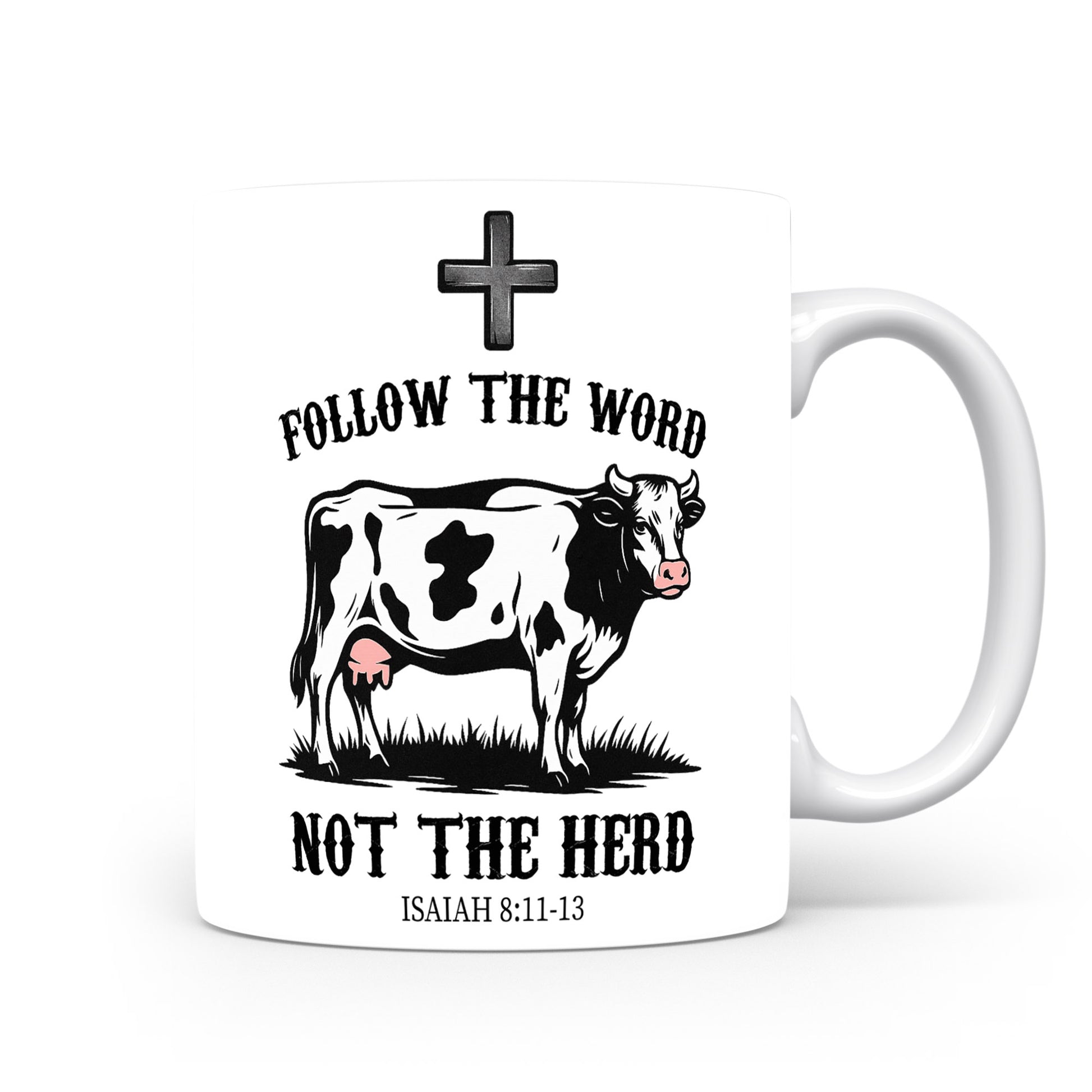 Bílý hrnek s nápisem 'FOLLOW THE WORD NOT THE HERD' a obrázkem krávy. Ideální pro ty, kteří chtějí vyjádřit svou individualitu.