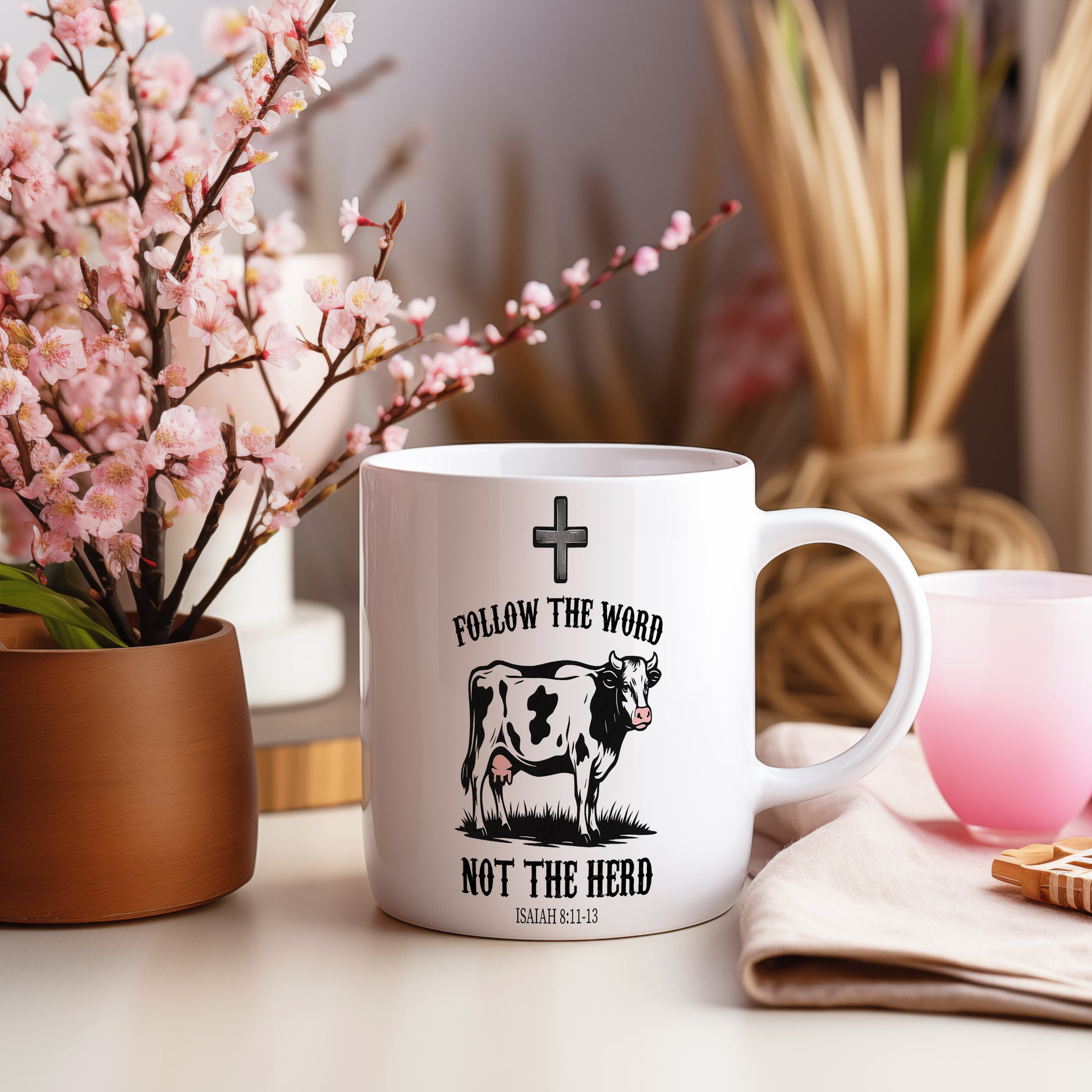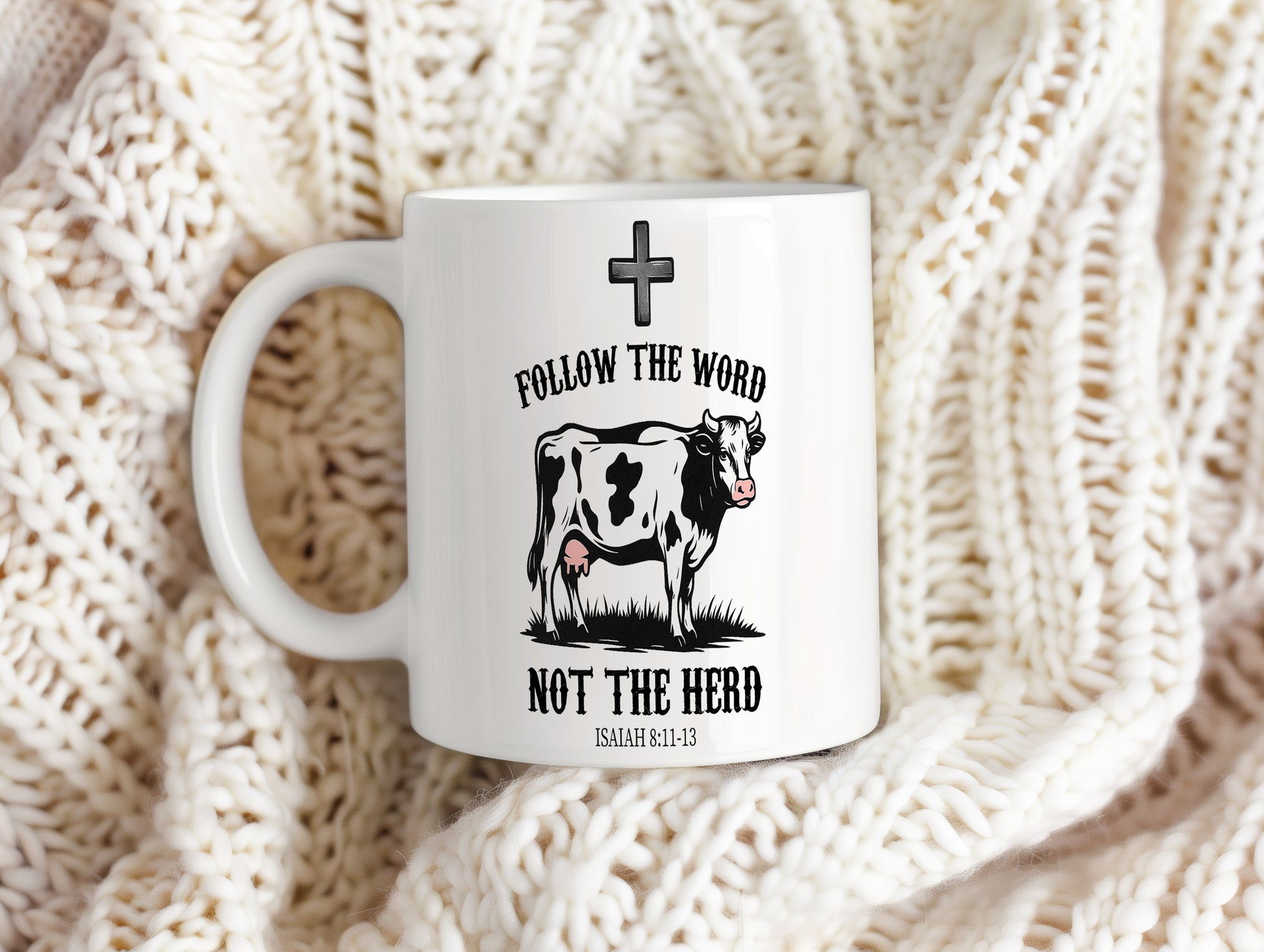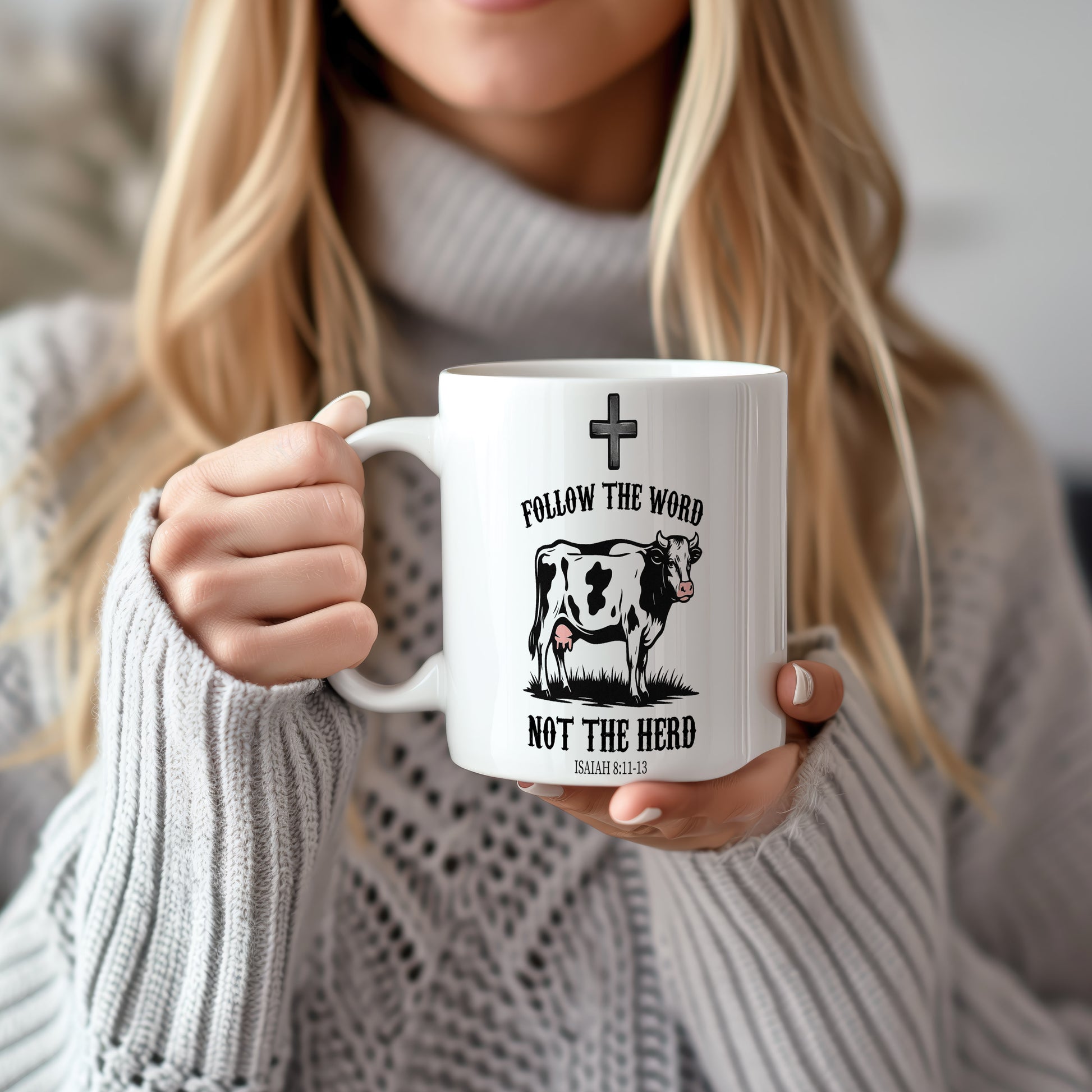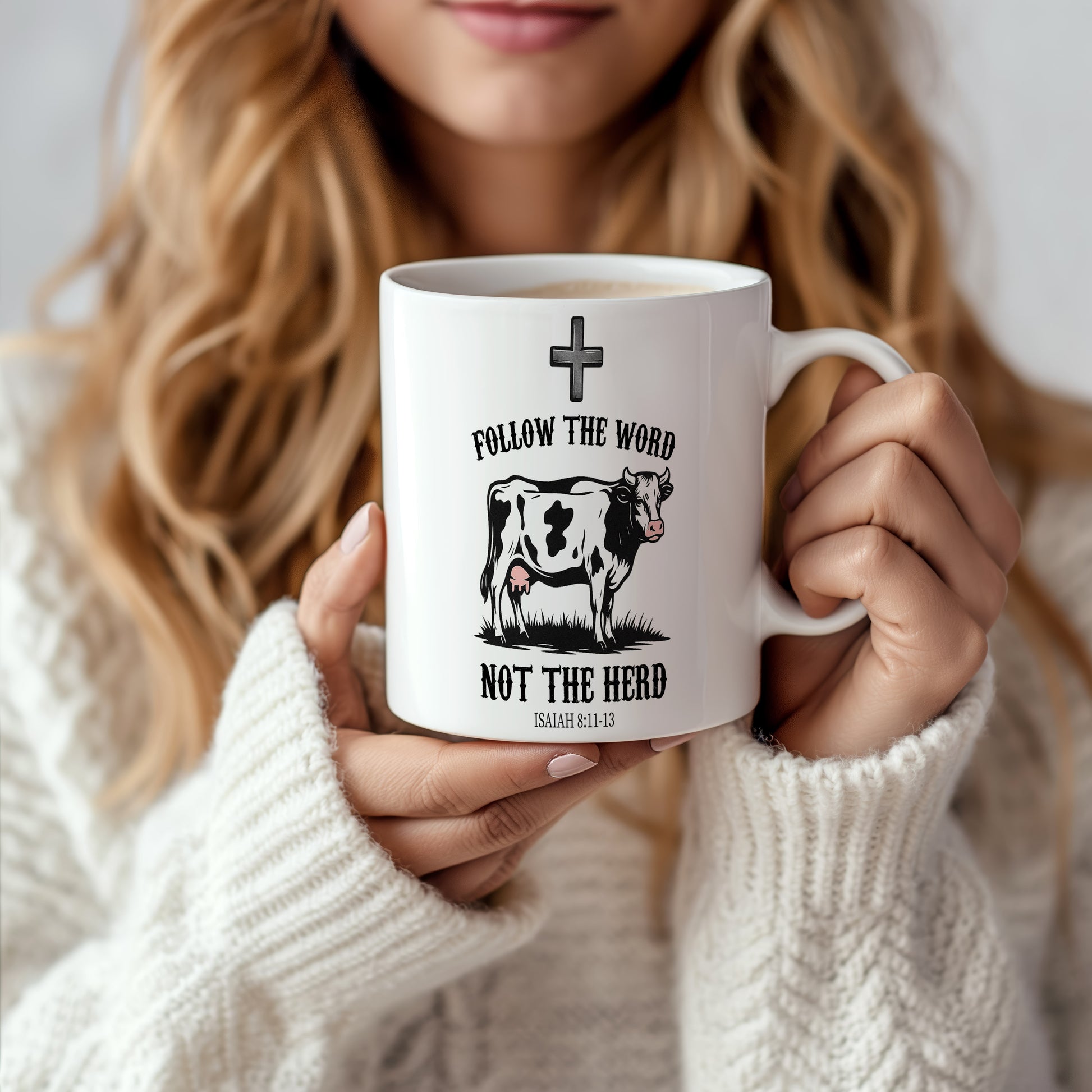 Bílý hrnek s nápisem 'FOLLOW THE WORD NOT THE HERD' a obrázkem krávy. Ideální pro ty, kteří chtějí vyjádřit svou individualitu.