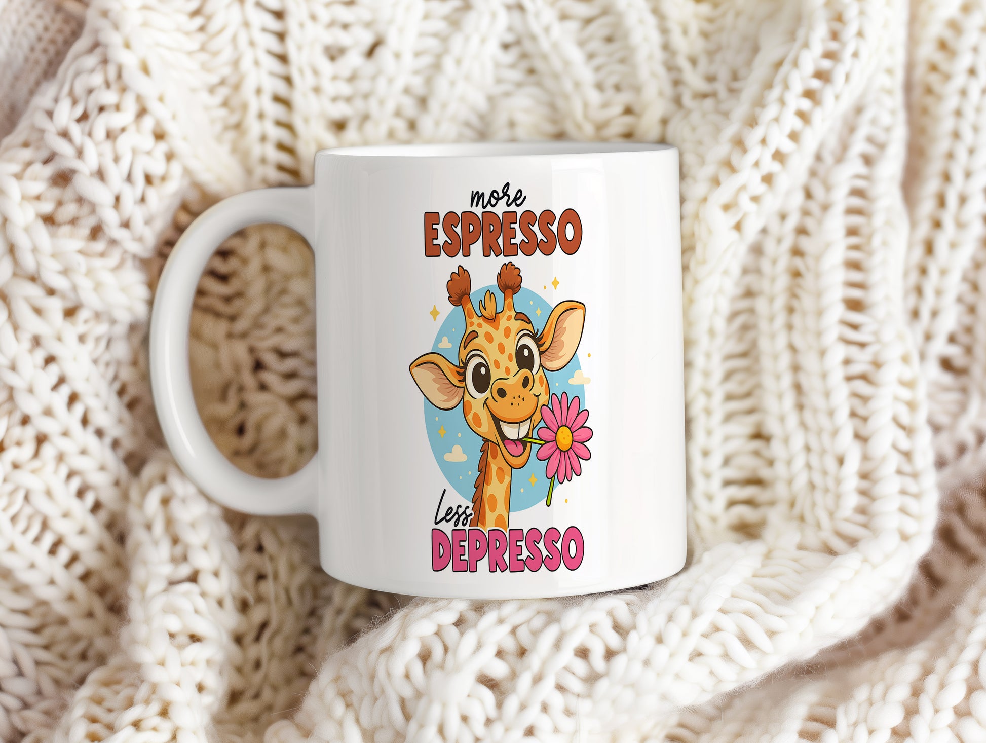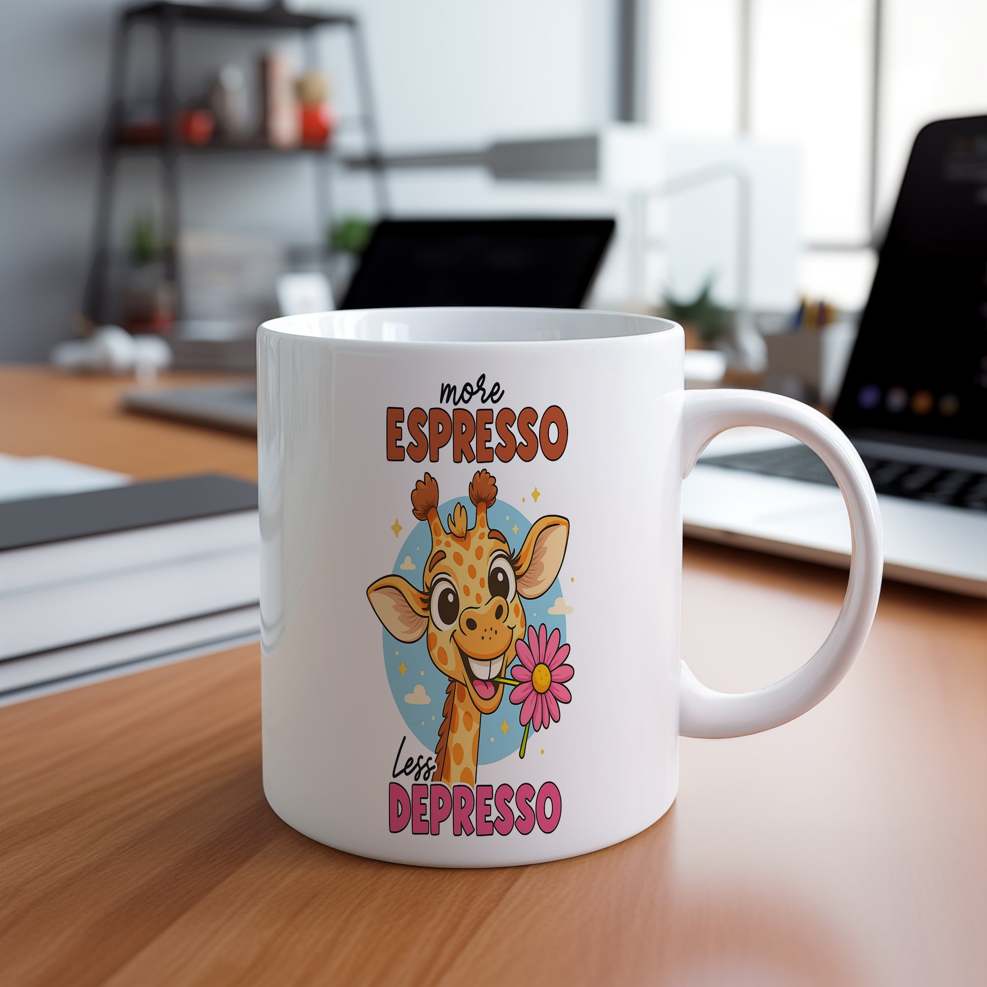 Tento hrnek s veselým motivem žirafy a nápisem 'more ESPRESSO less DEPRESSO' je ideální pro milovníky kávy. Přineste si úsměv na tvář každé ráno.