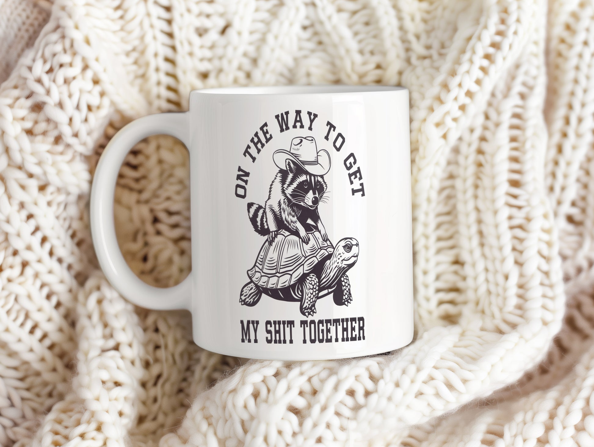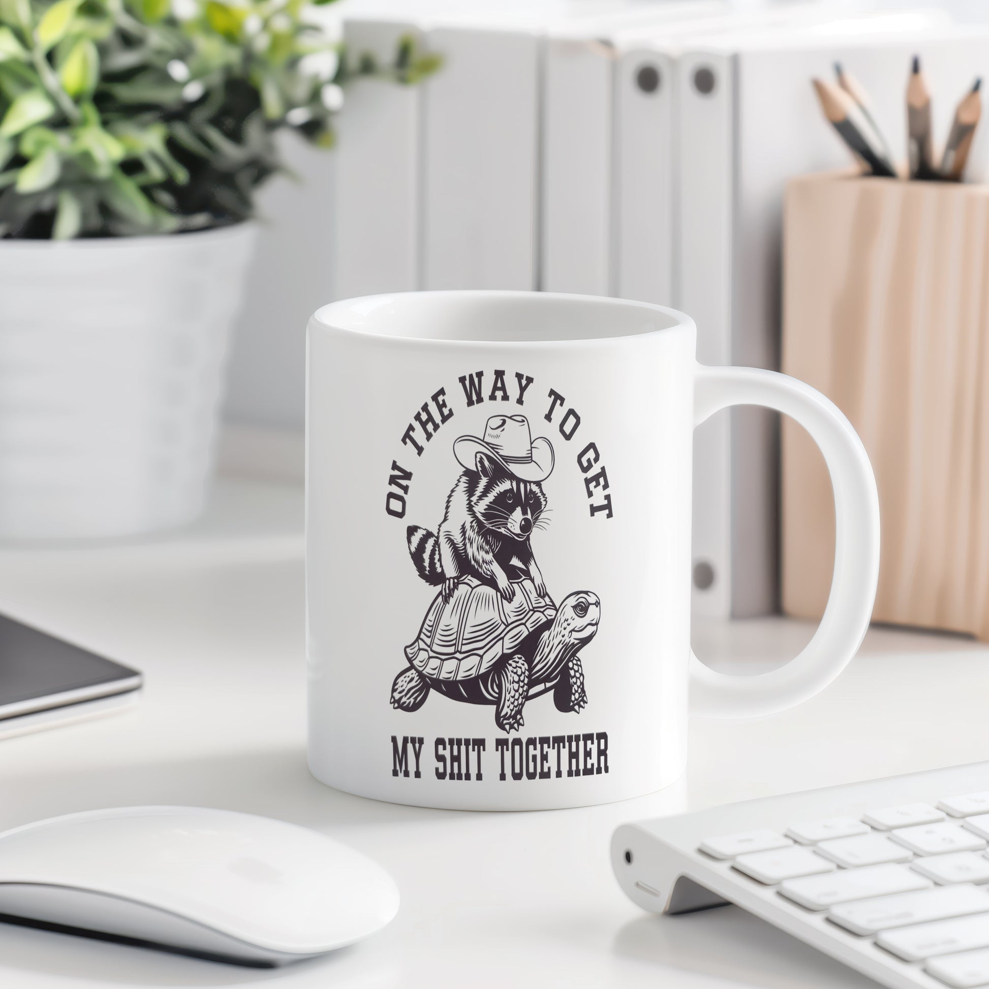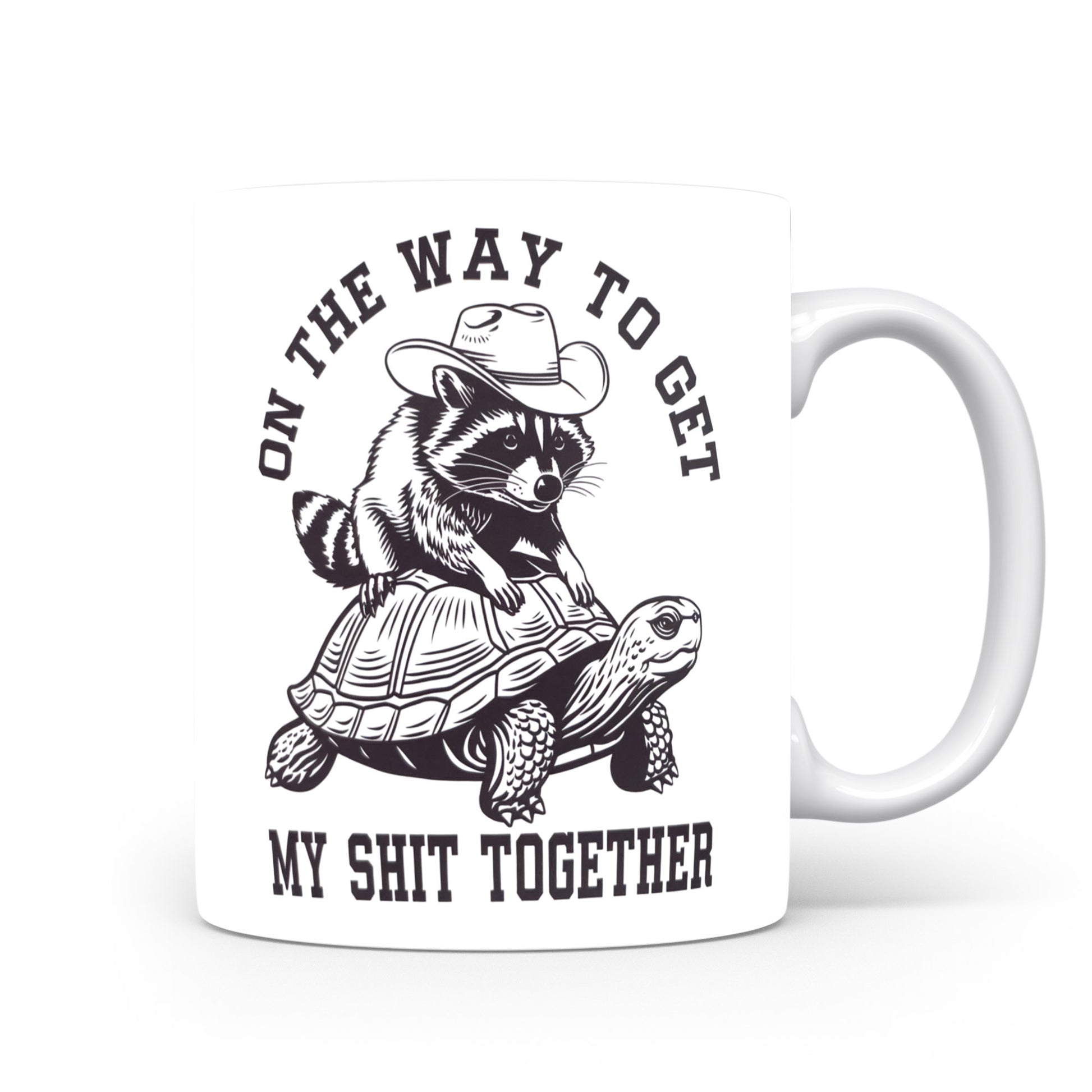 Tento hrnek s vtipným nápisem a ilustrací mývala na želvě je ideální pro ty, kteří si dělají legraci ze svého životního tempa.