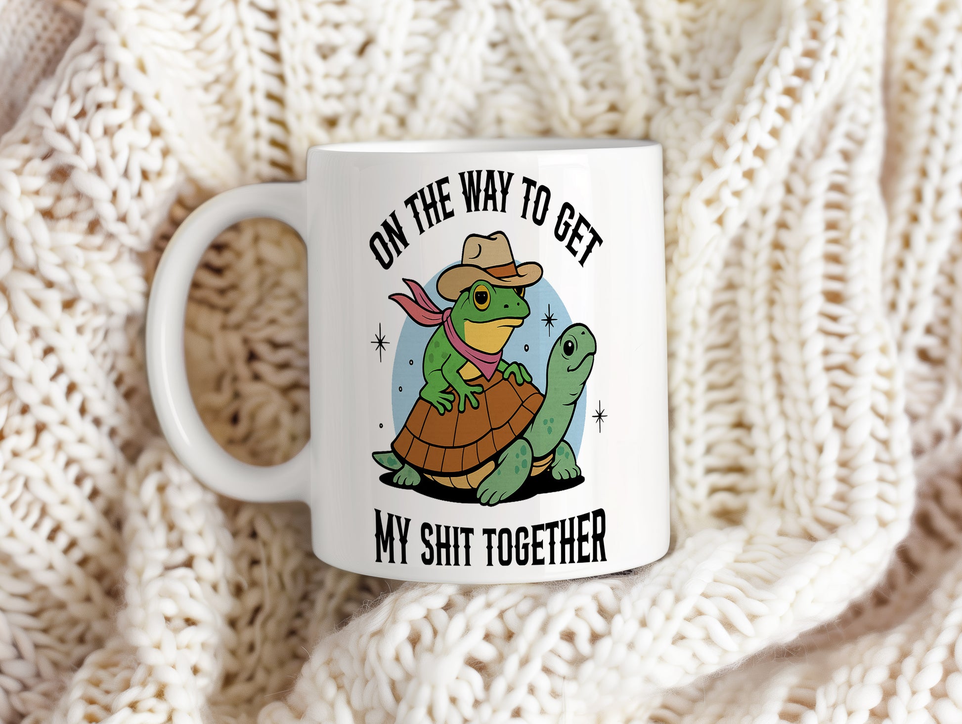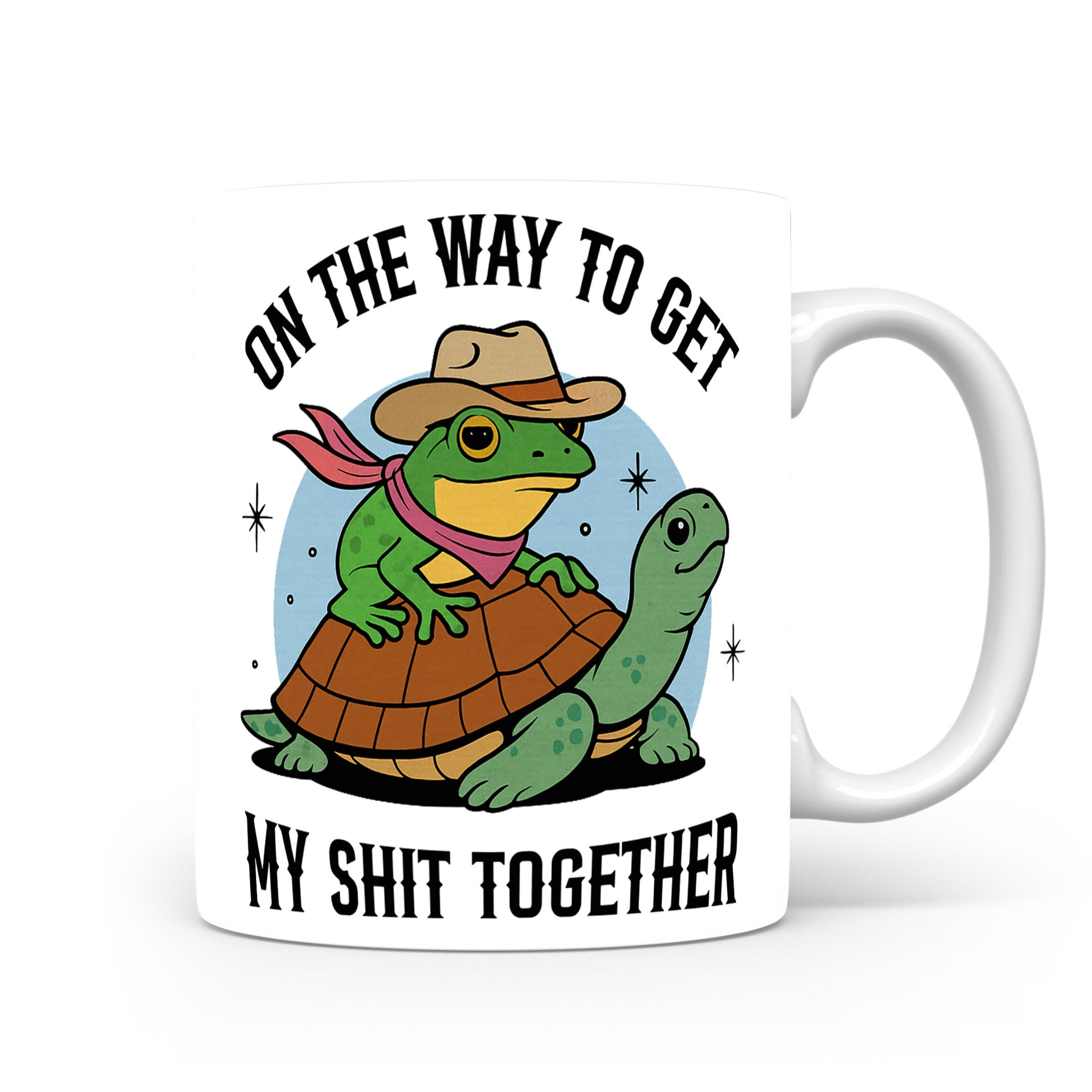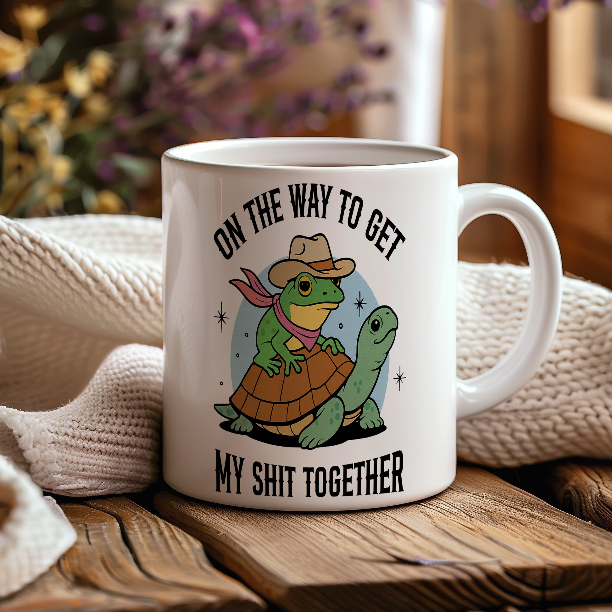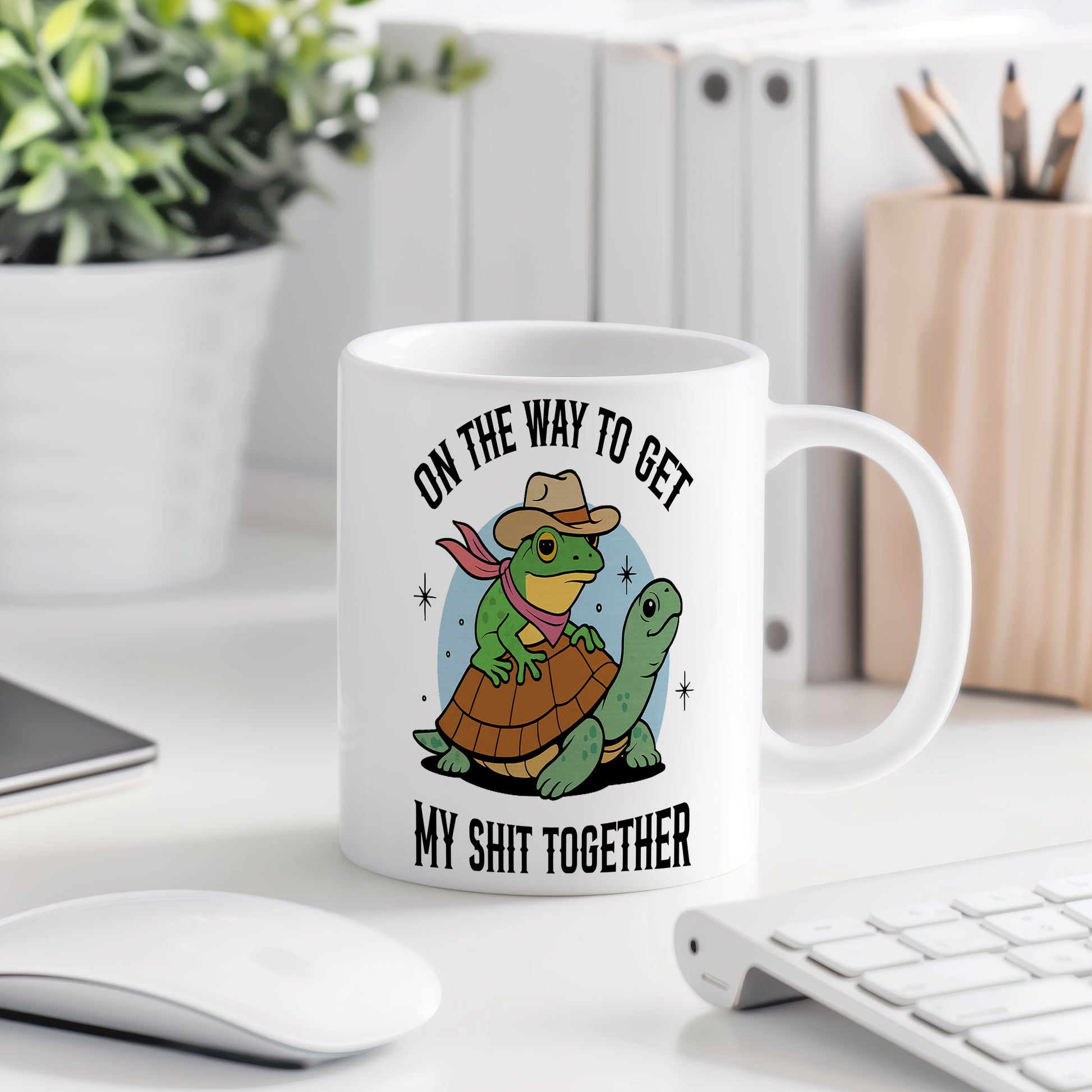 Vtipný hrnek s motivem žáby na želvě a nápisem, který pobaví každého. Ideální dárek pro ty, kteří si umí udělat legraci sami ze sebe.