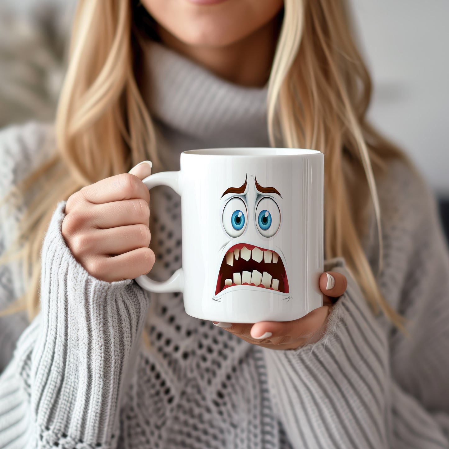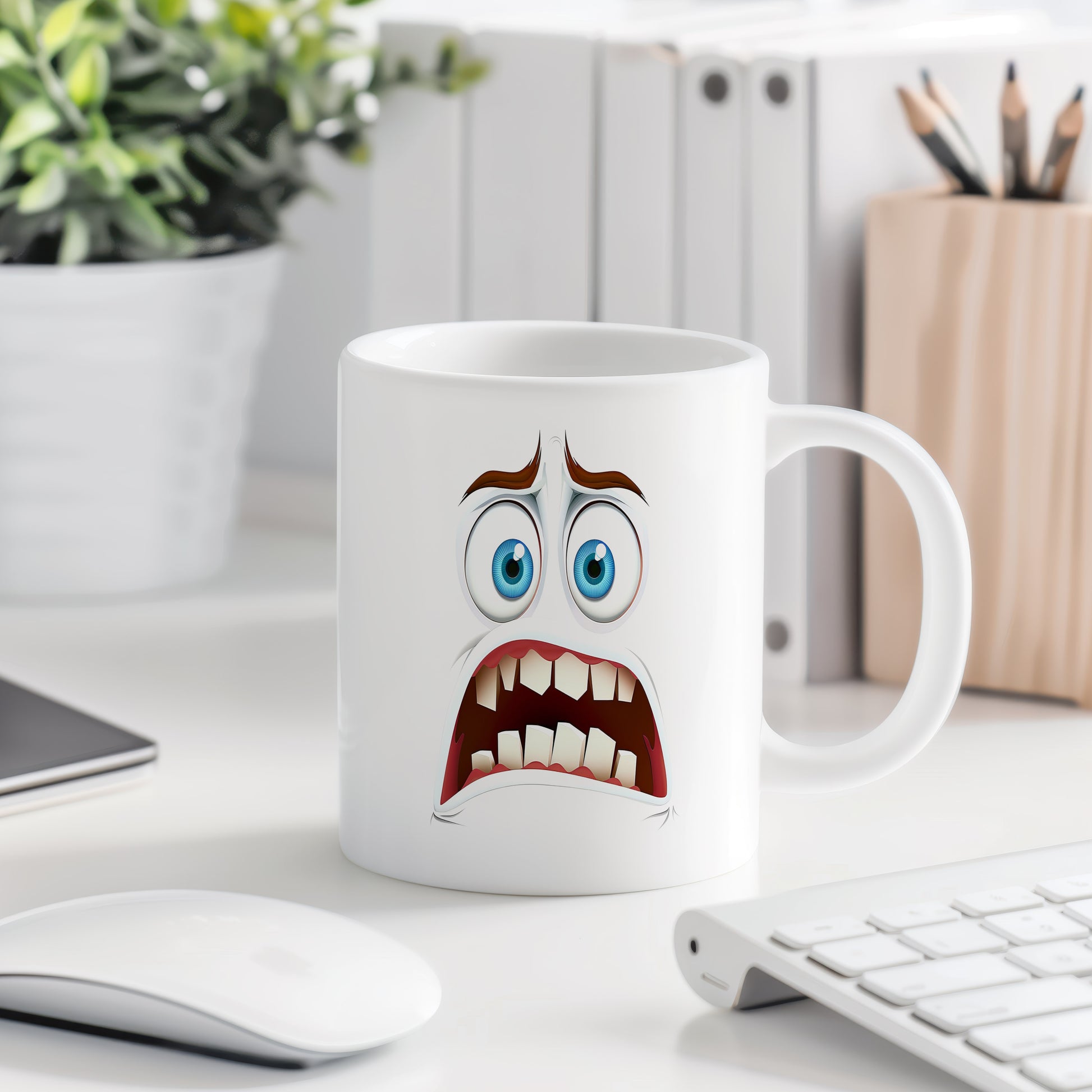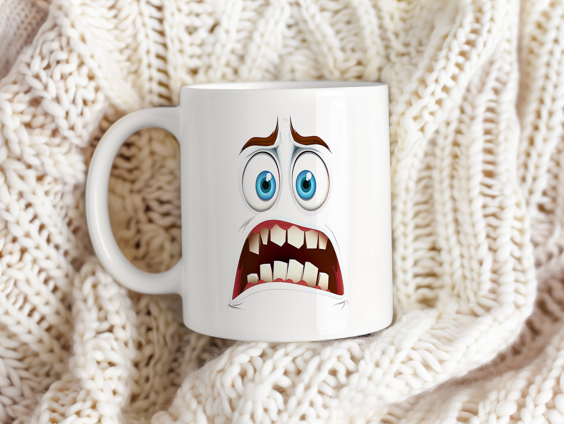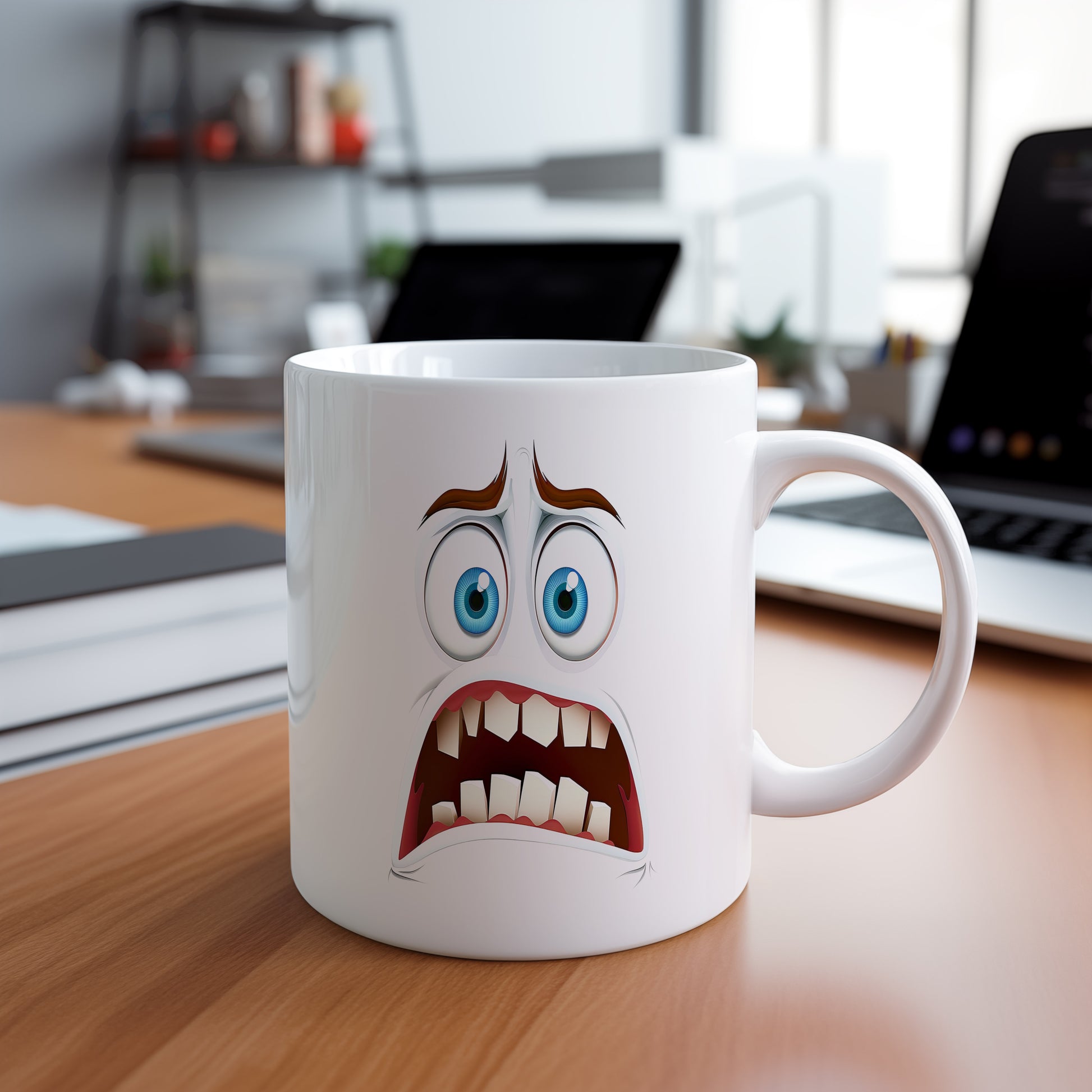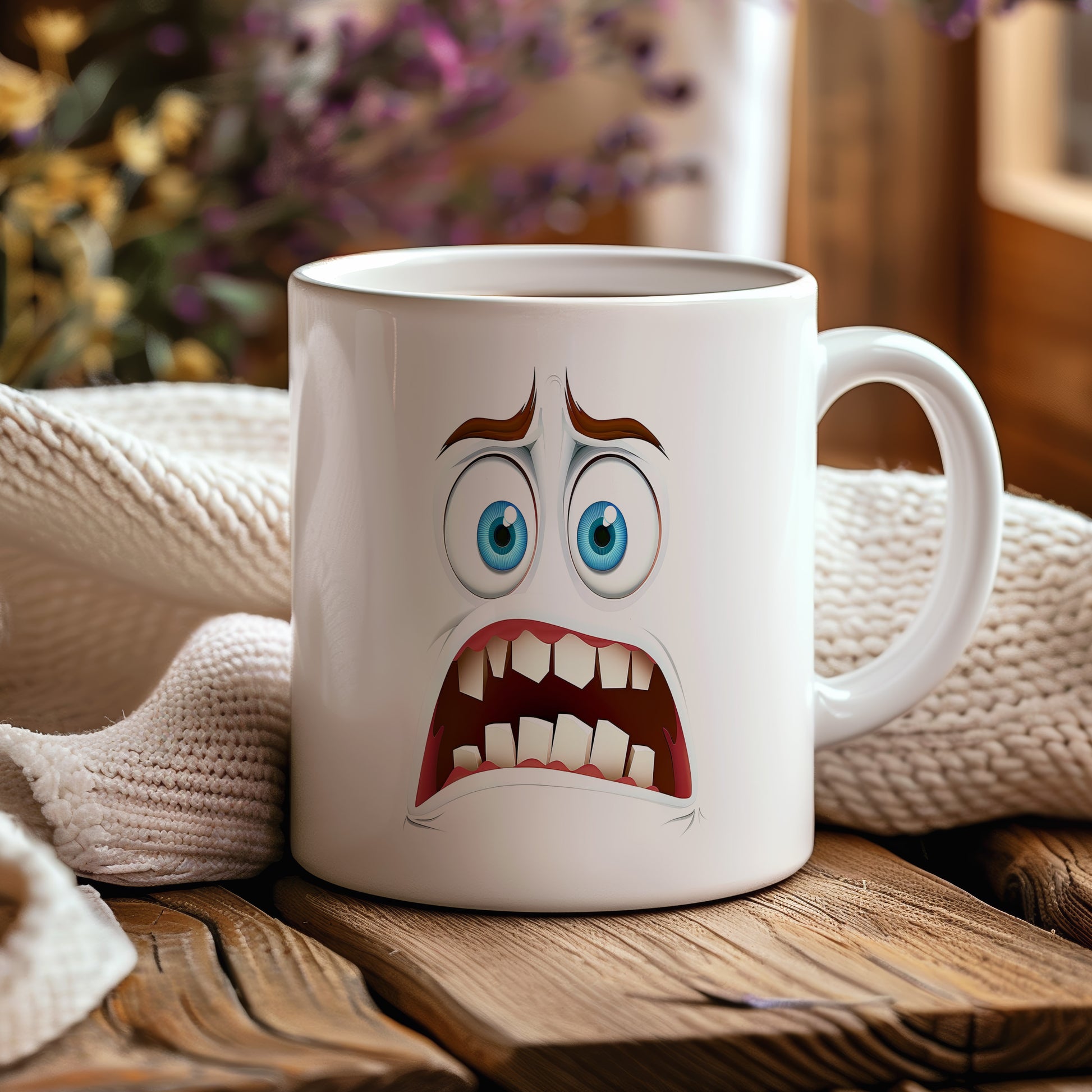 Hrnek s vtipným obličejem – děs a hrůza. Skvělý parťák pro ranní kávu i odpolední čaj.