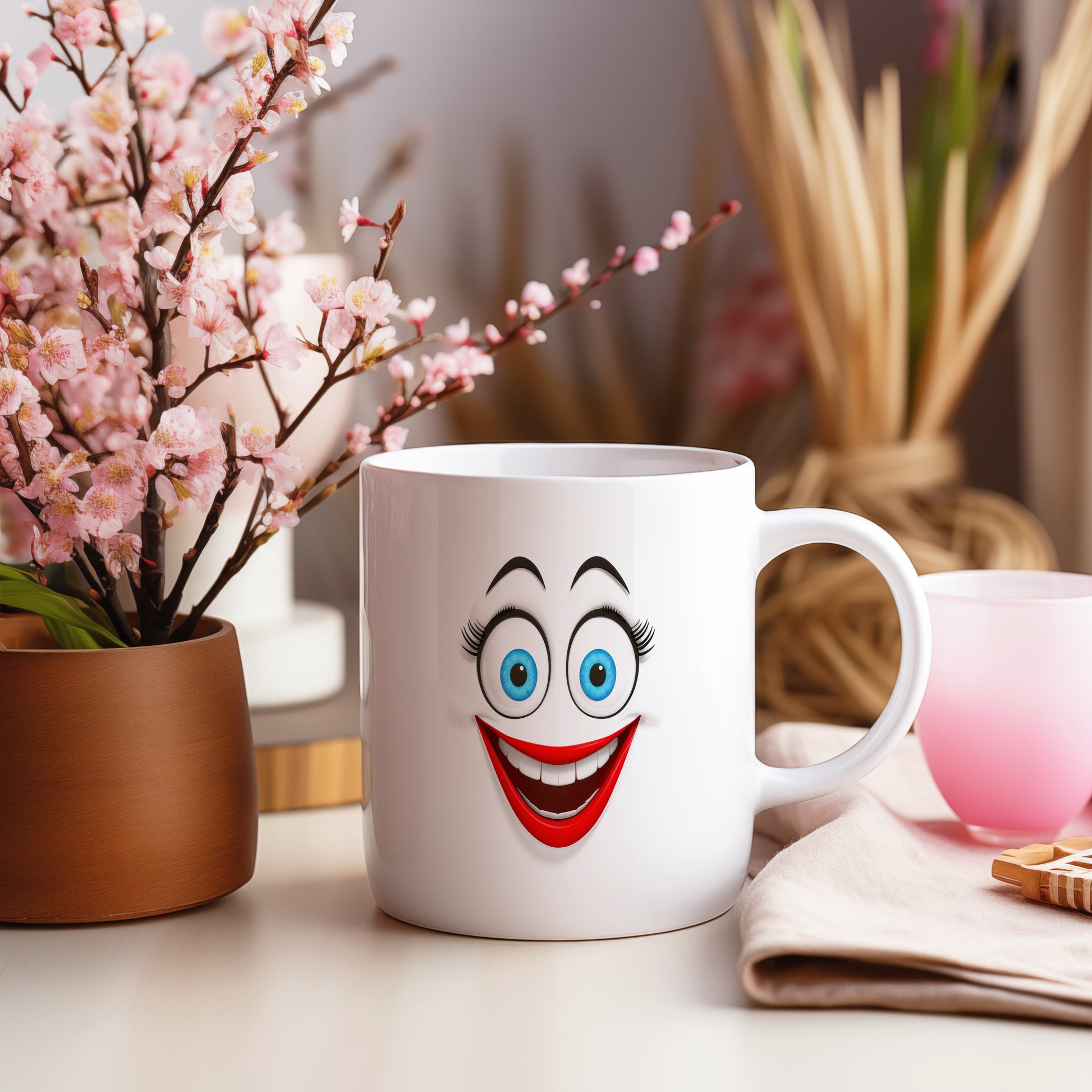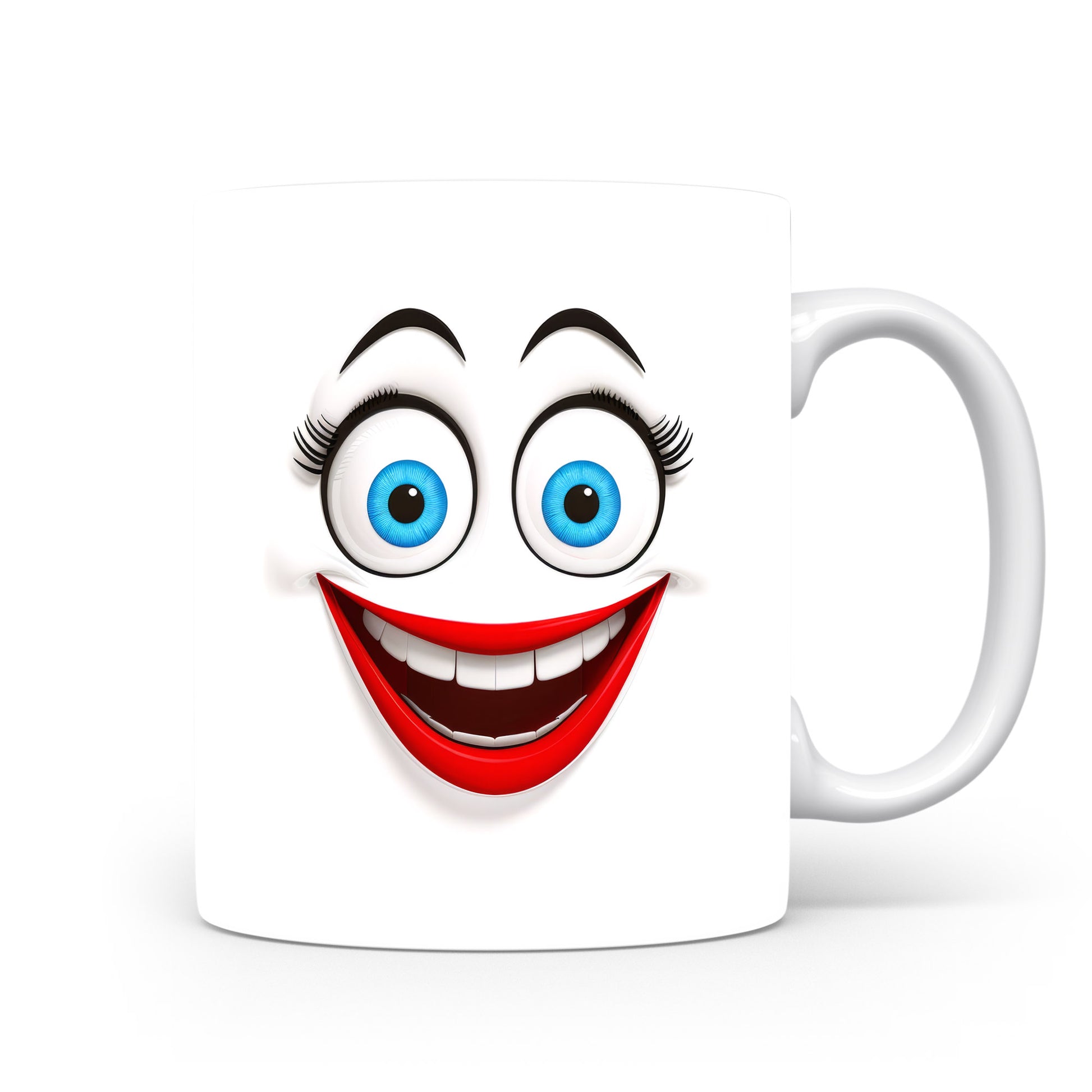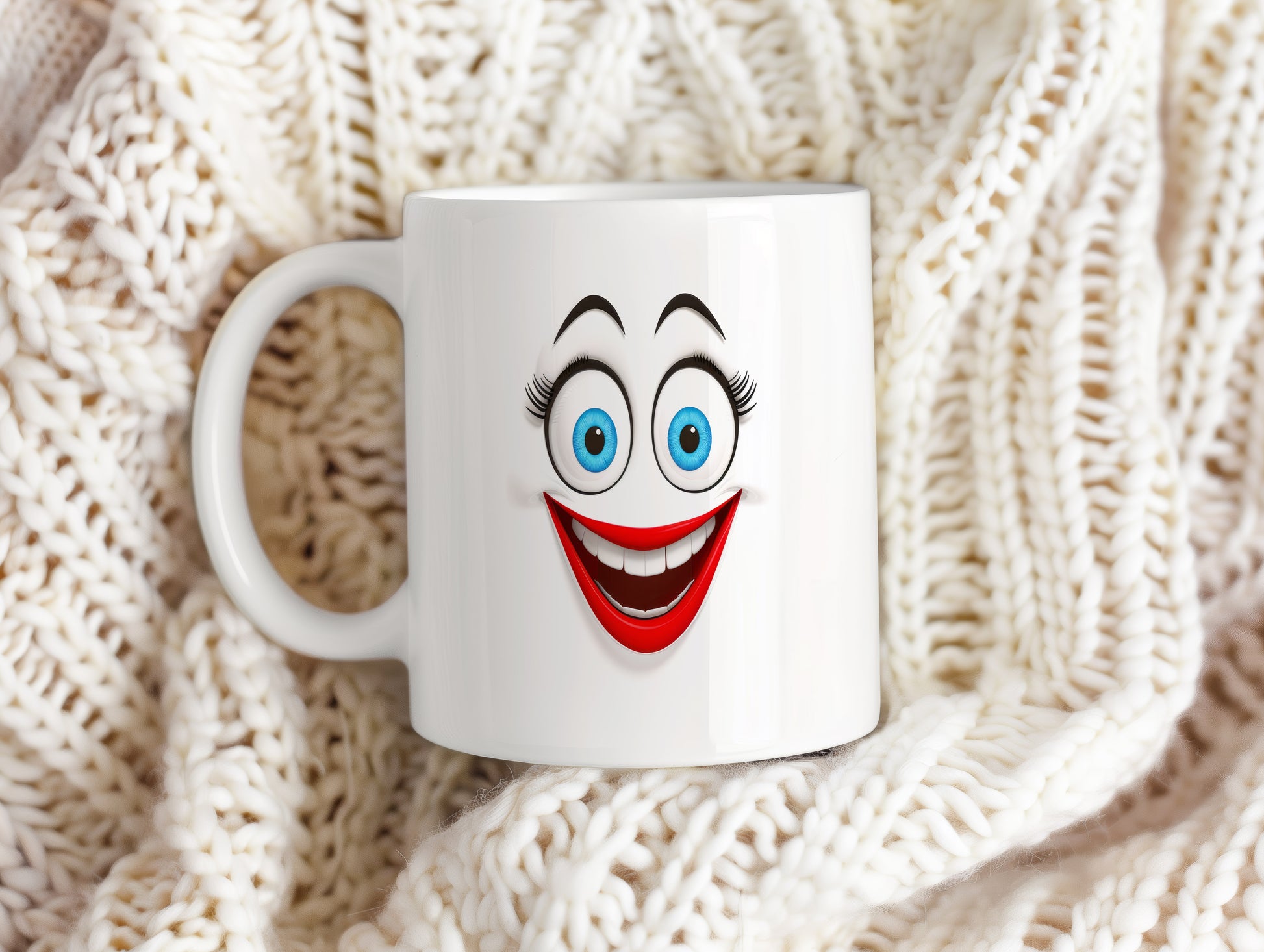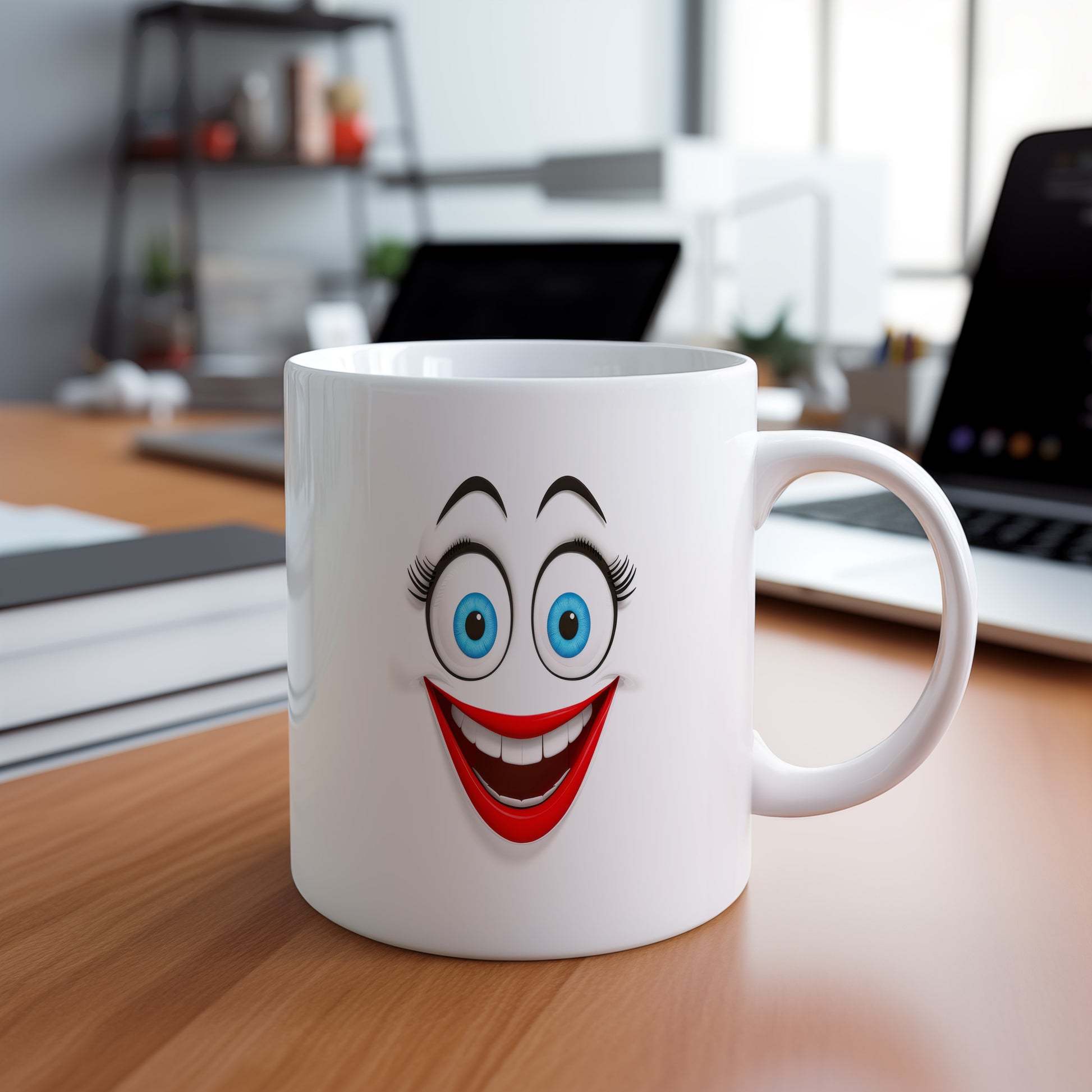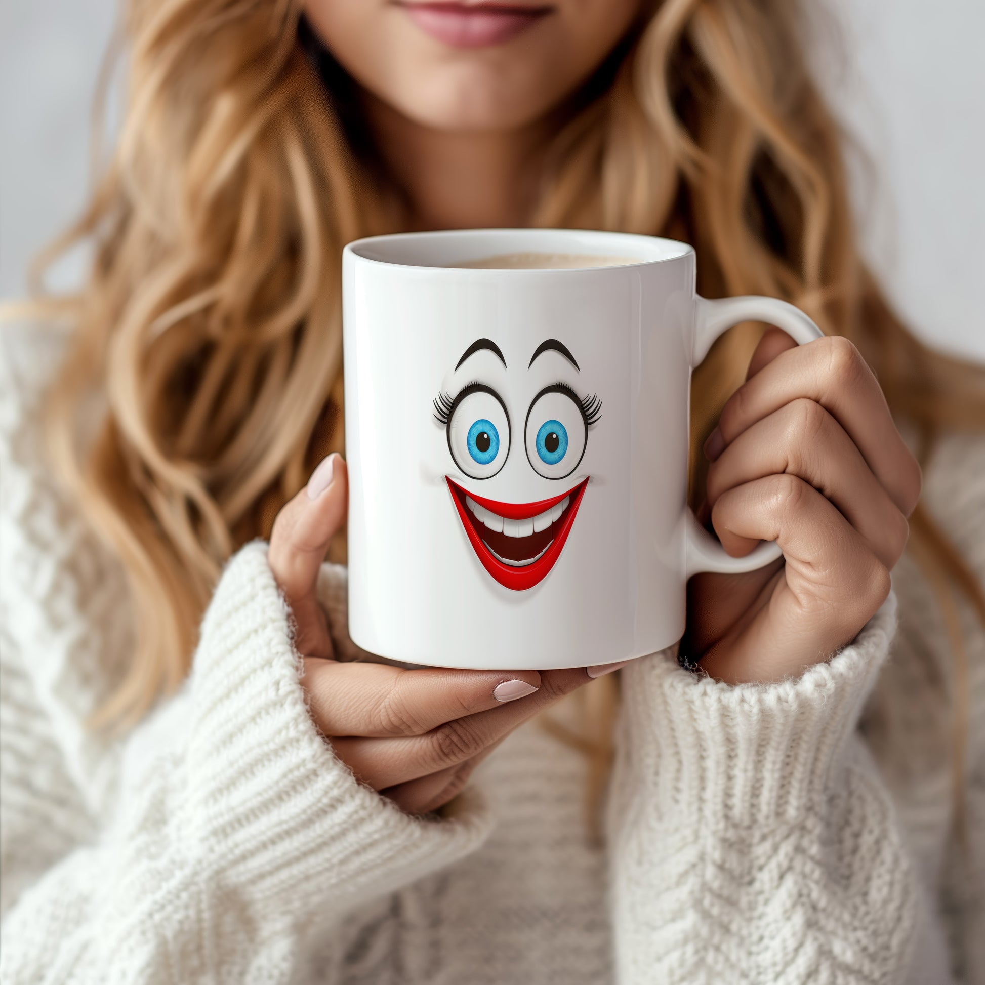 Hrnek s vtipným obličejem – vítězný úsměv. Skvělý parťák pro ranní kávu i odpolední čaj.