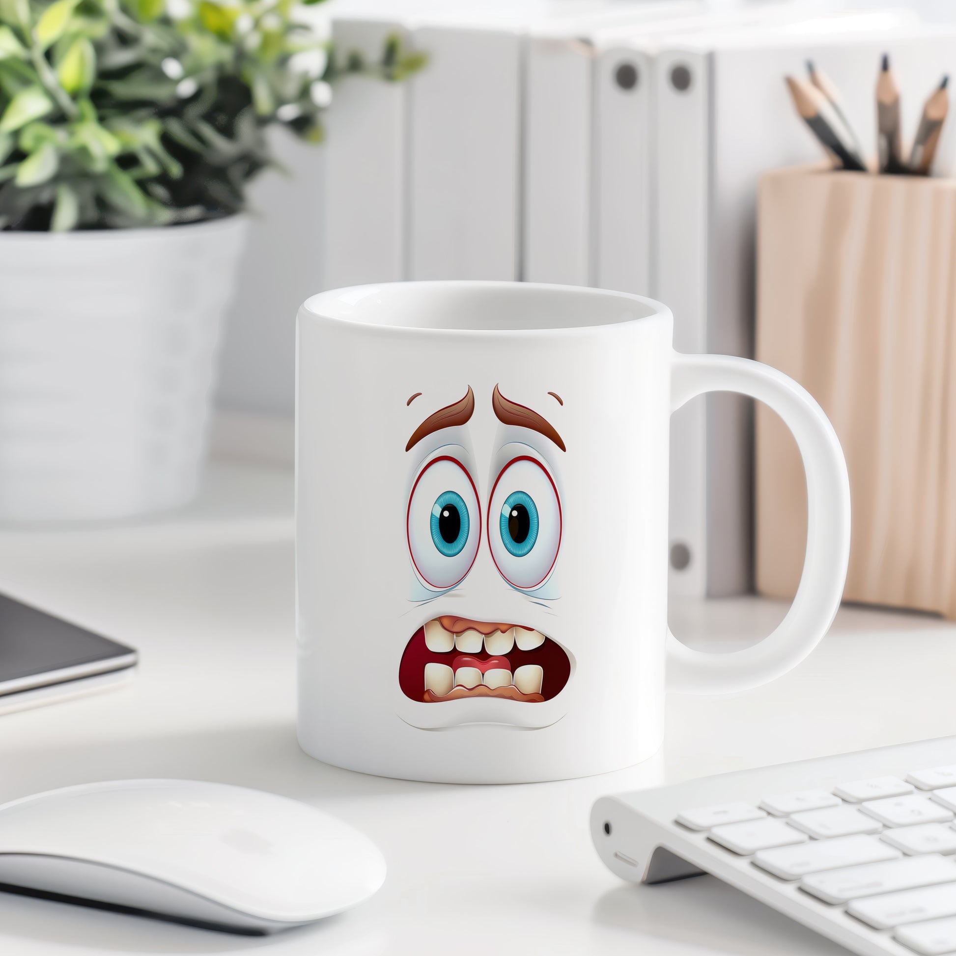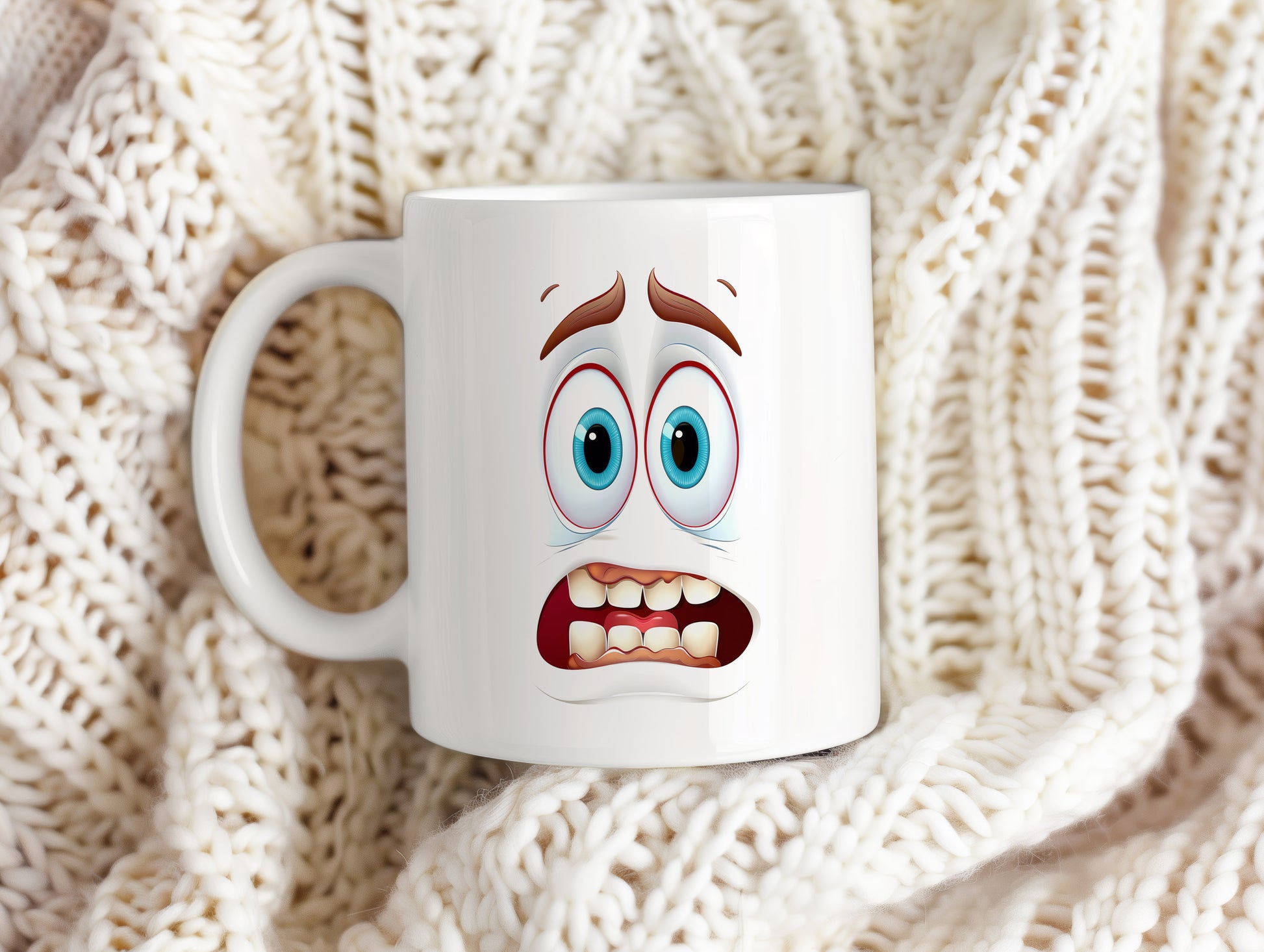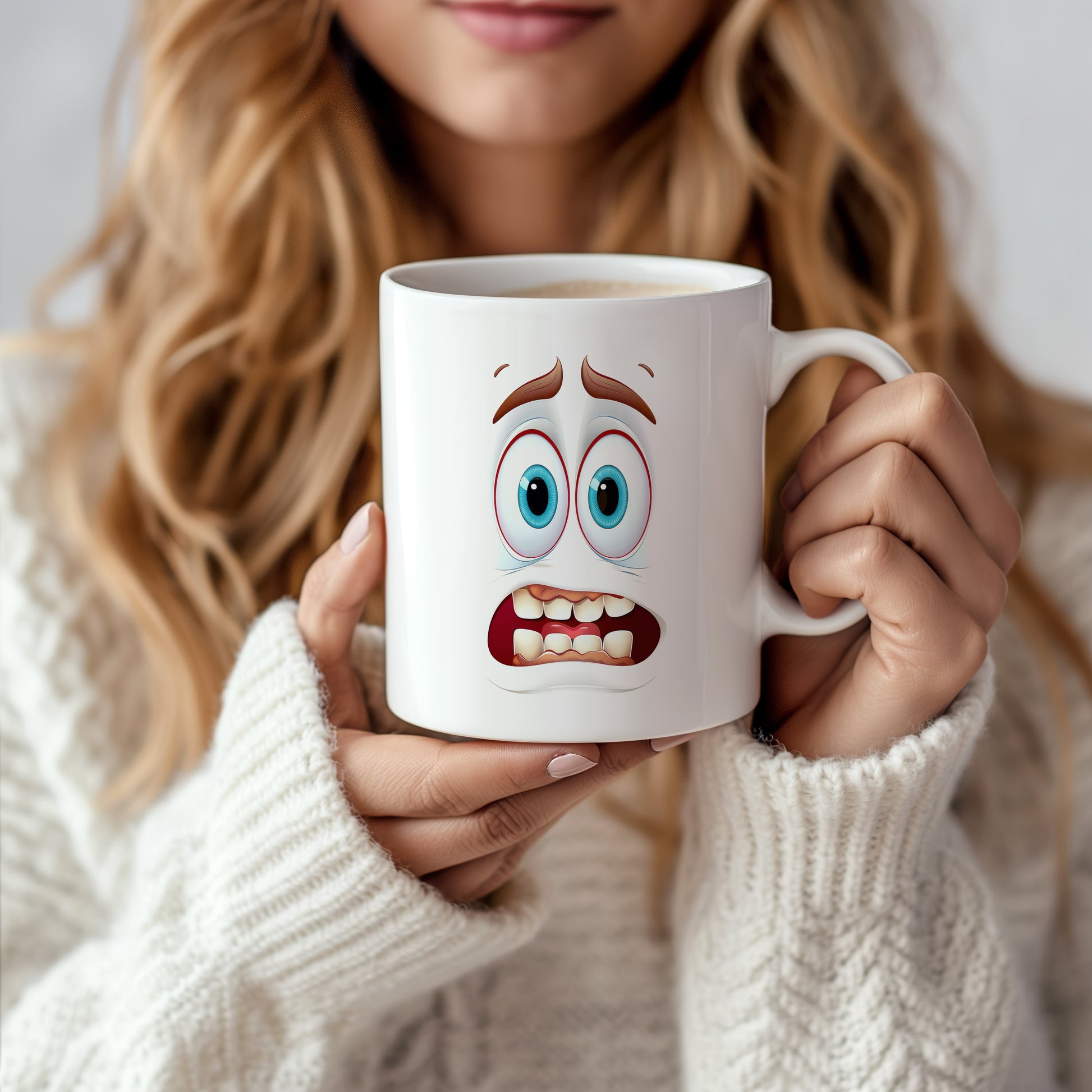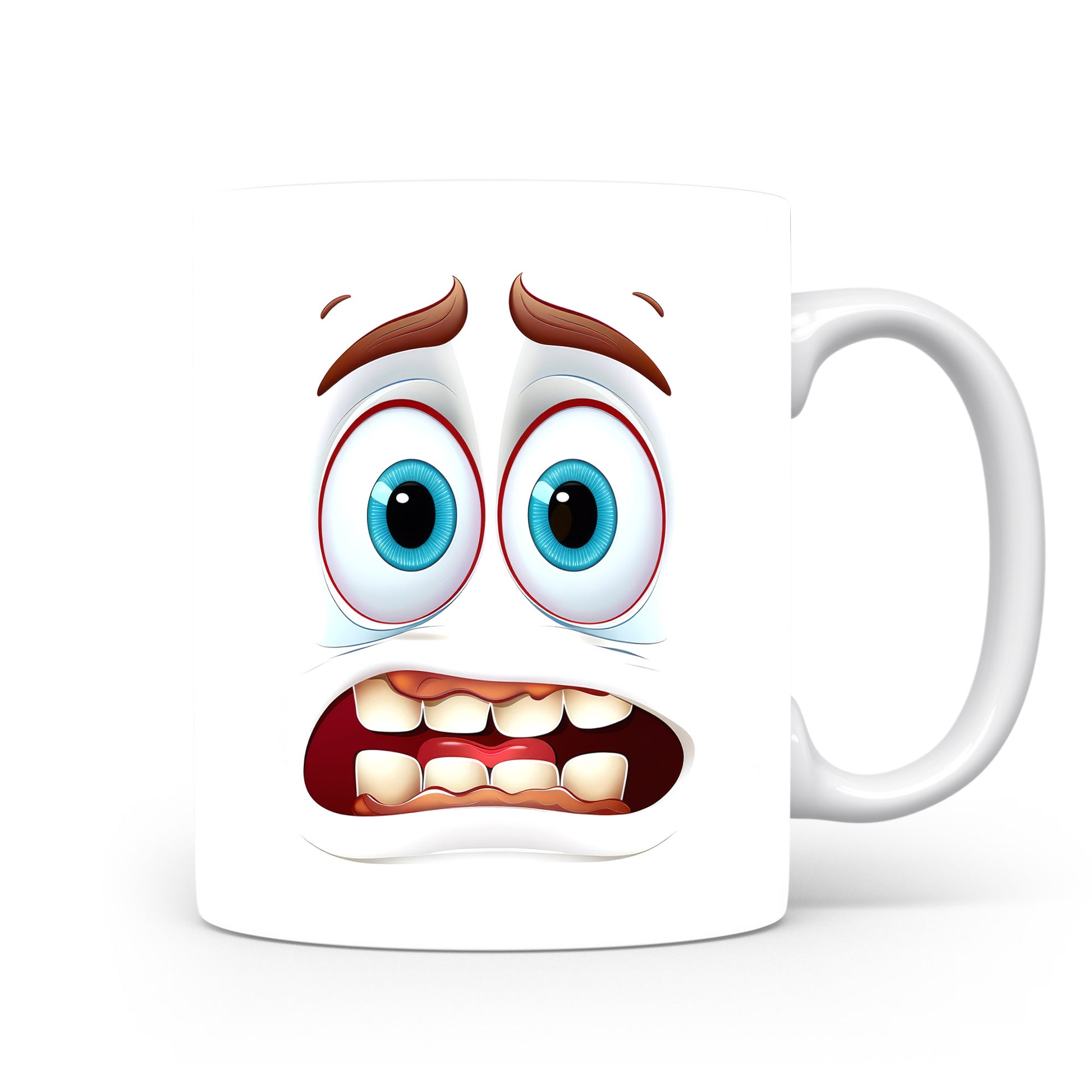 Hrnek s vtipným obličejem – vystrašený úsměv se zuby