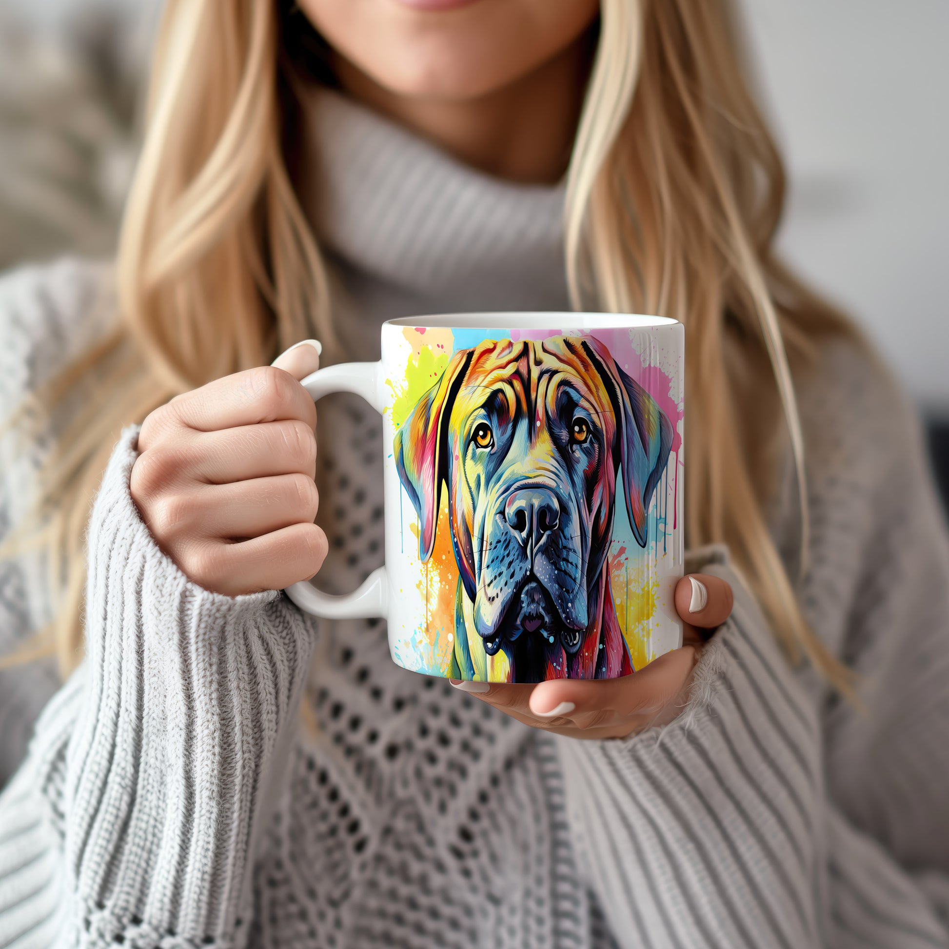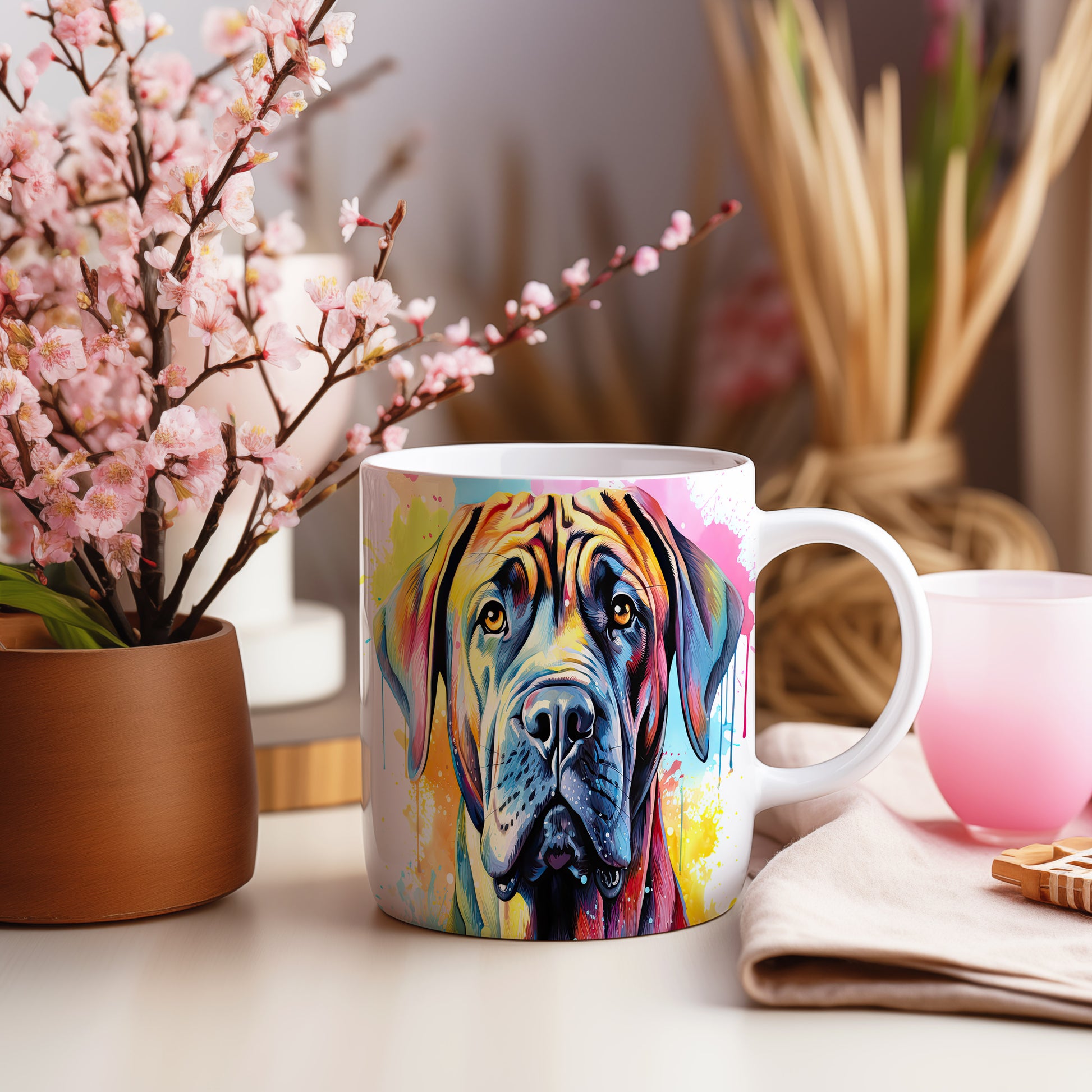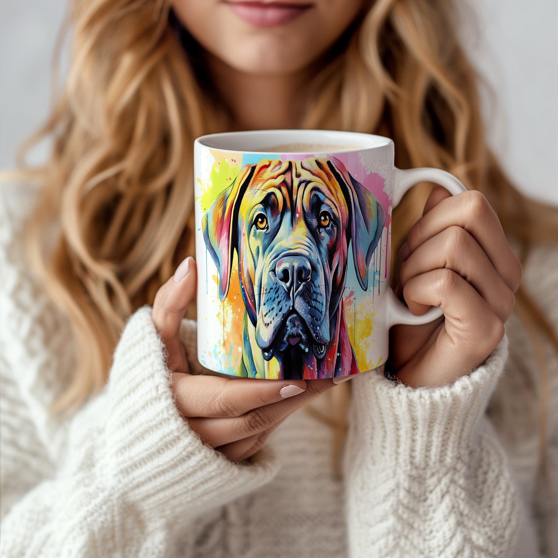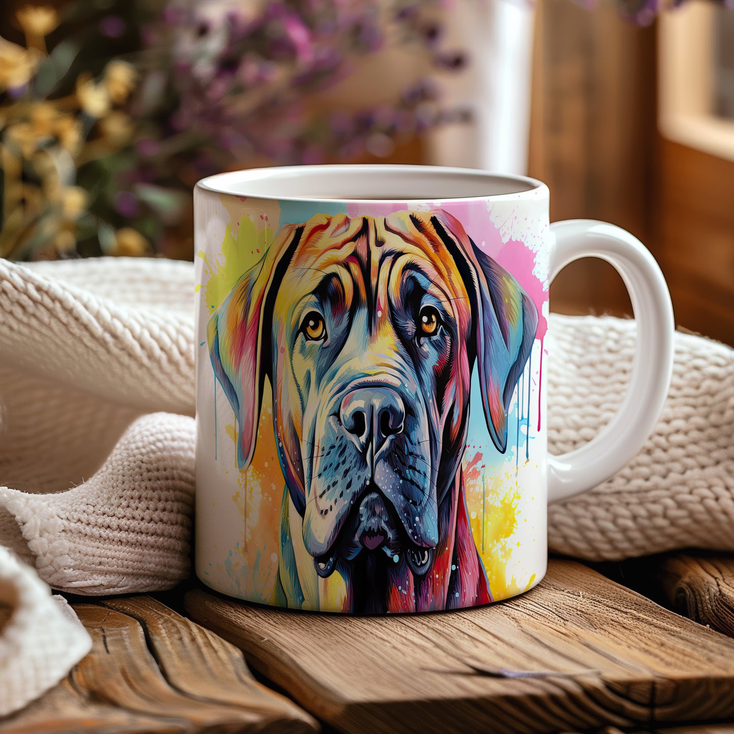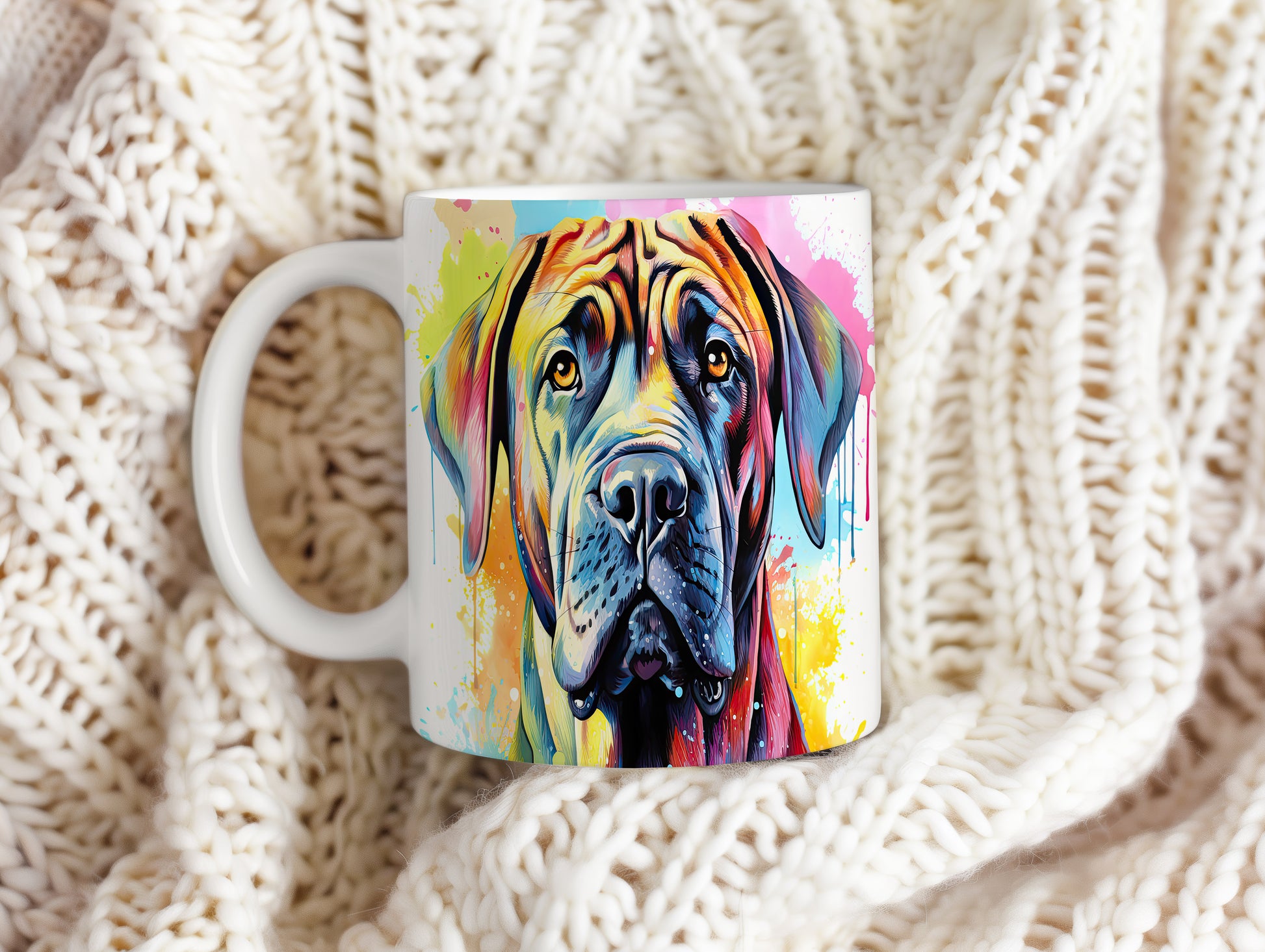 Hrnek s vtipným portrétem psa v živých barvách