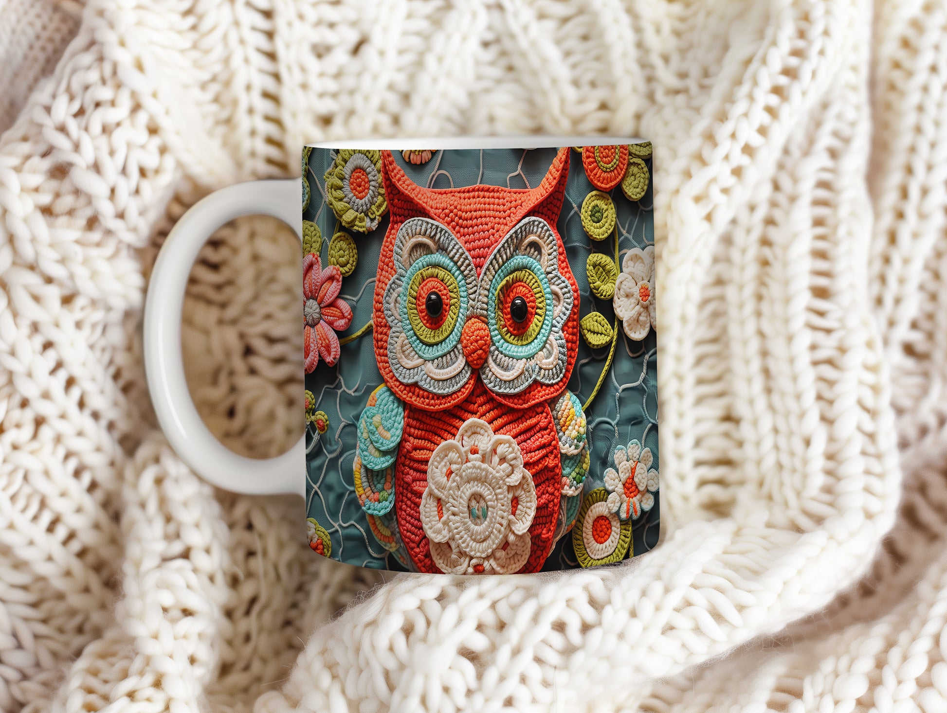 Hrnek s vyšívanou sovou a květinami