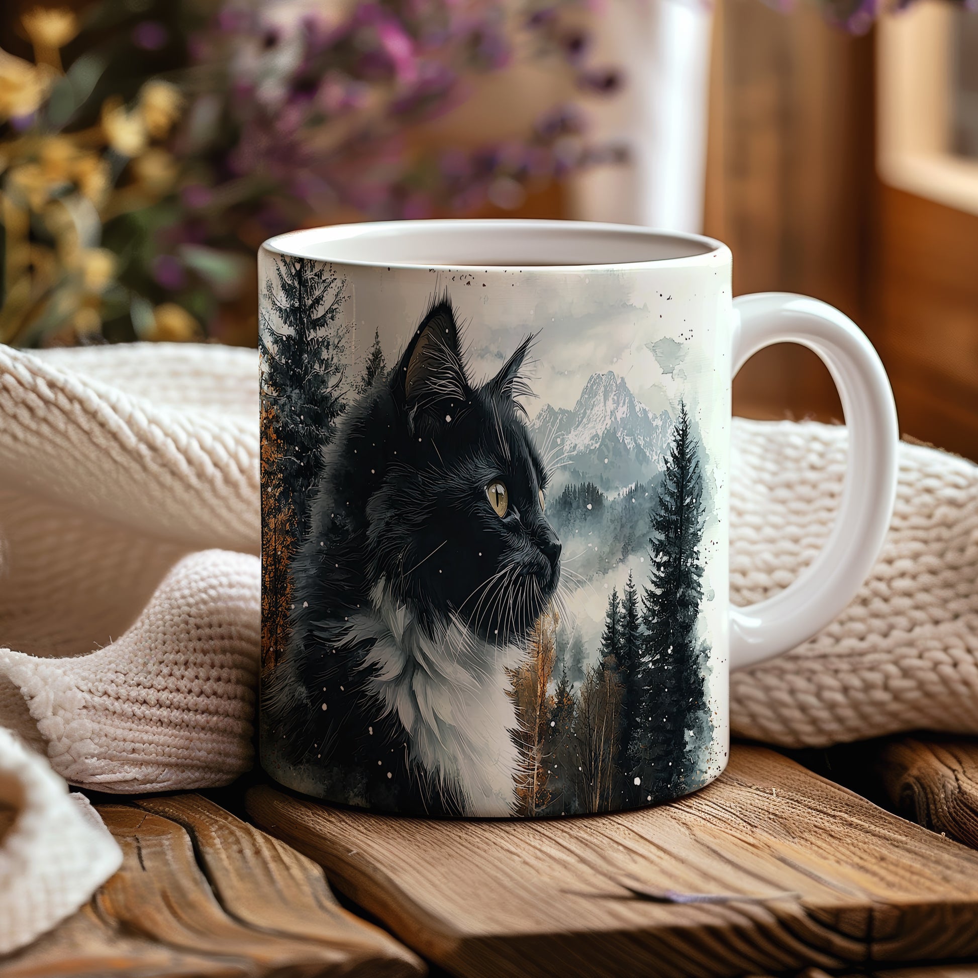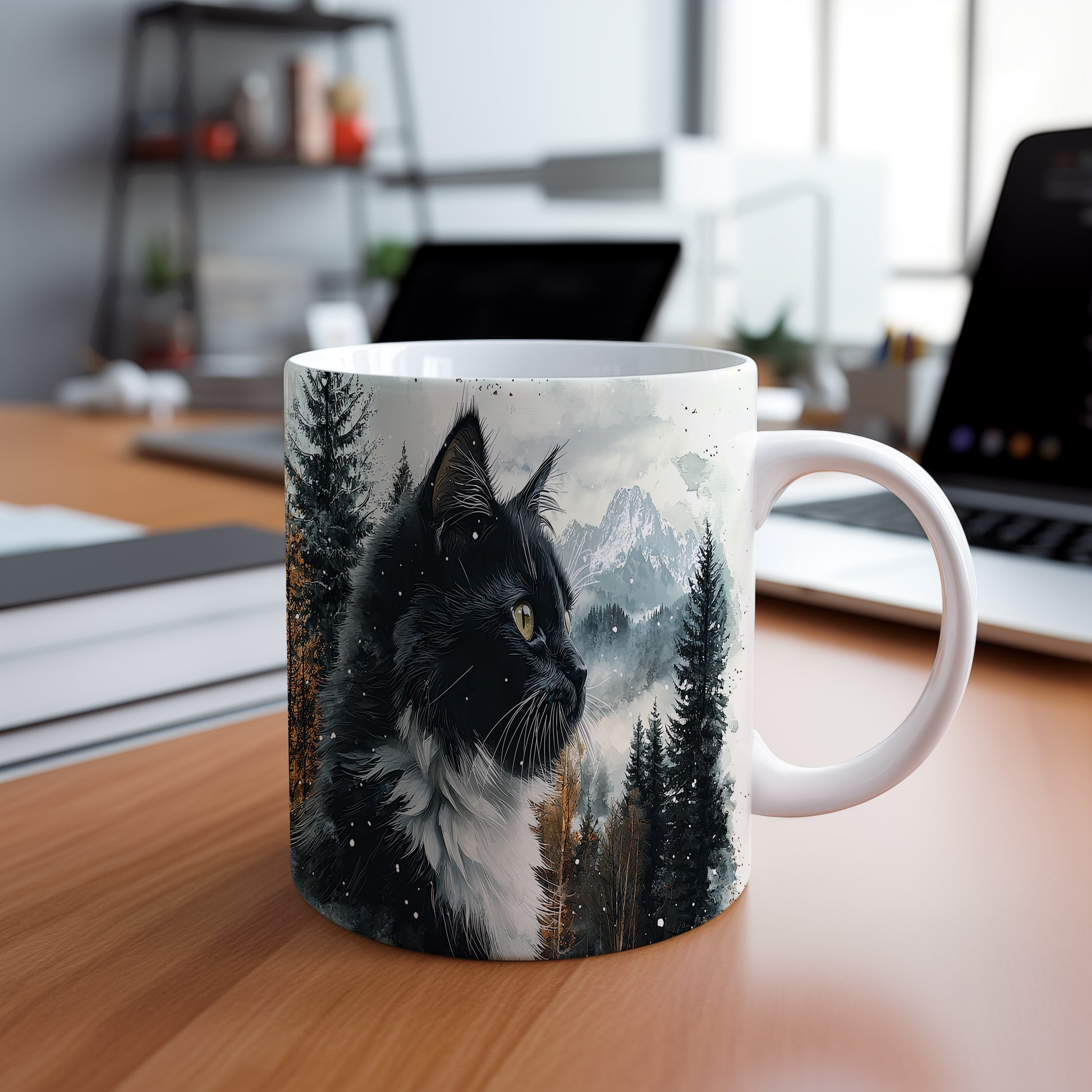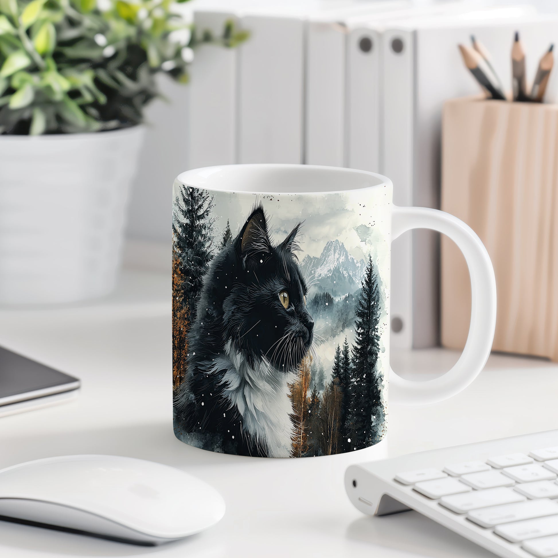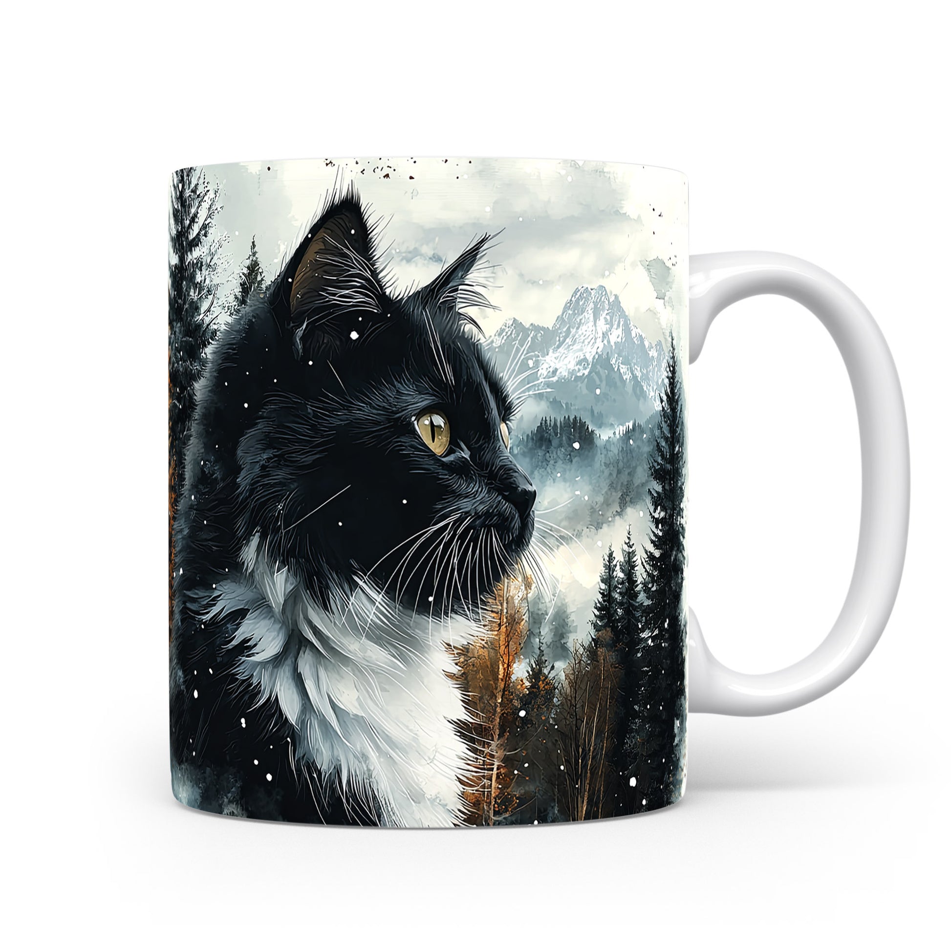 Tento hrnek zobrazuje černobílou kočku s výraznýma očima na pozadí zasněžených hor a lesů. Je ideální pro milovníky koček a přírody, skvělý tip na dárek pro přátele nebo rodinu. Materiál: keramika. Objem: 330 ml. Vhodné do myčky i mikrovlnky. Při každém doušku si užijete pohled na krásnou kočku a přírodu.