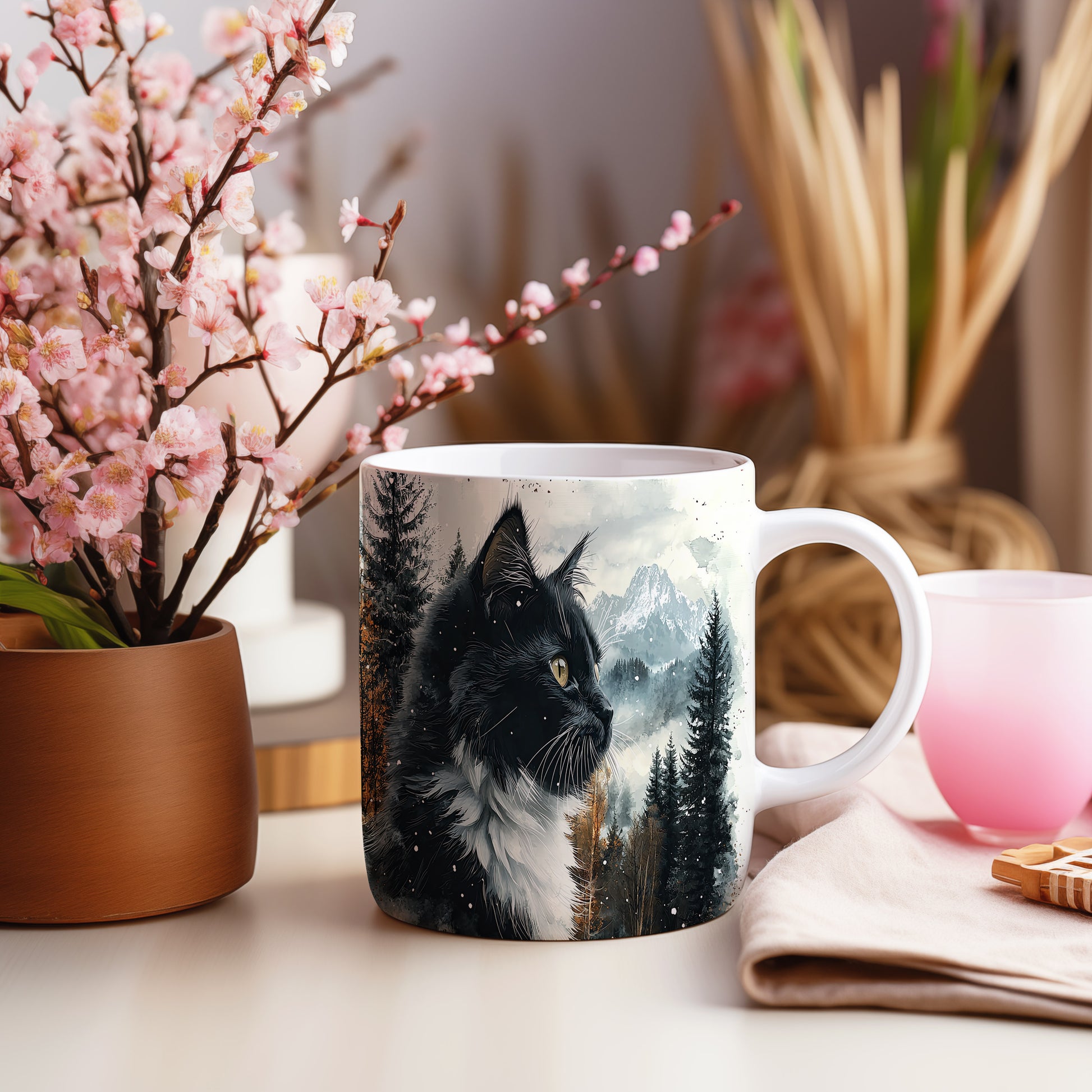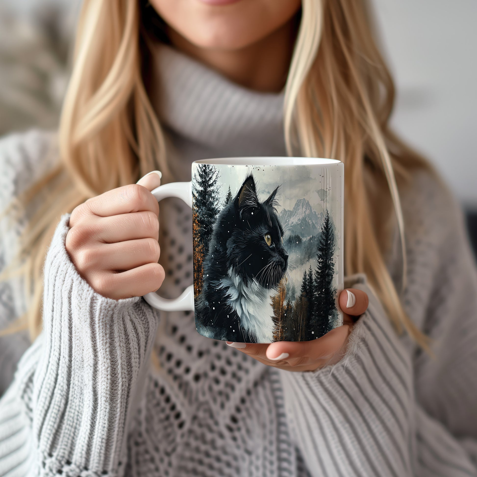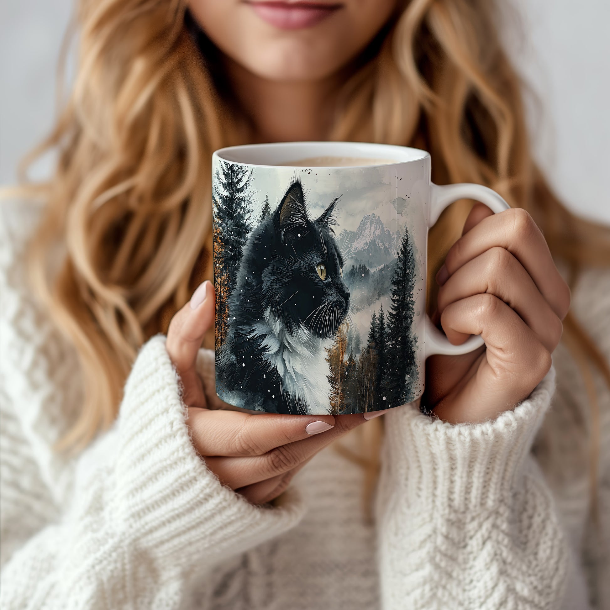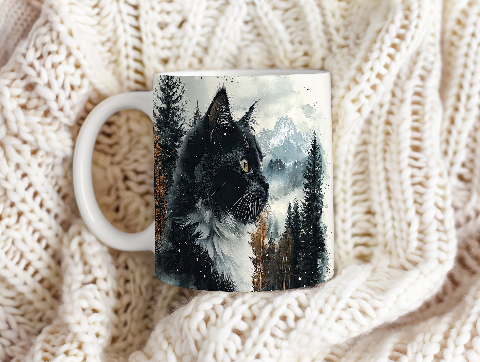 Tento hrnek zobrazuje černobílou kočku s výraznýma očima na pozadí zasněžených hor a lesů. Je ideální pro milovníky koček a přírody, skvělý tip na dárek pro přátele nebo rodinu. Materiál: keramika. Objem: 330 ml. Vhodné do myčky i mikrovlnky. Při každém doušku si užijete pohled na krásnou kočku a přírodu.