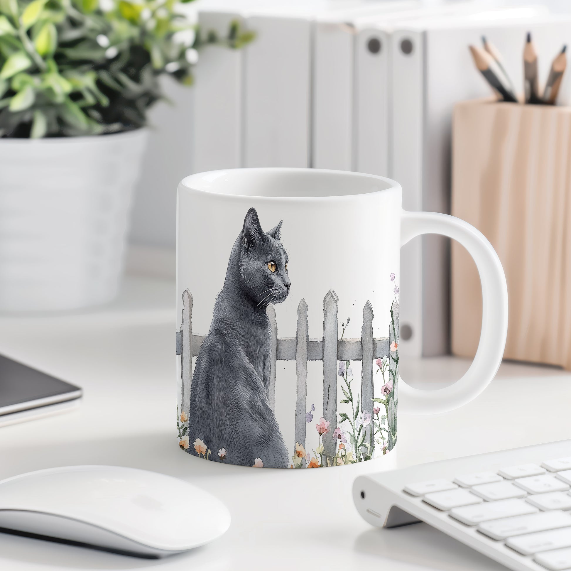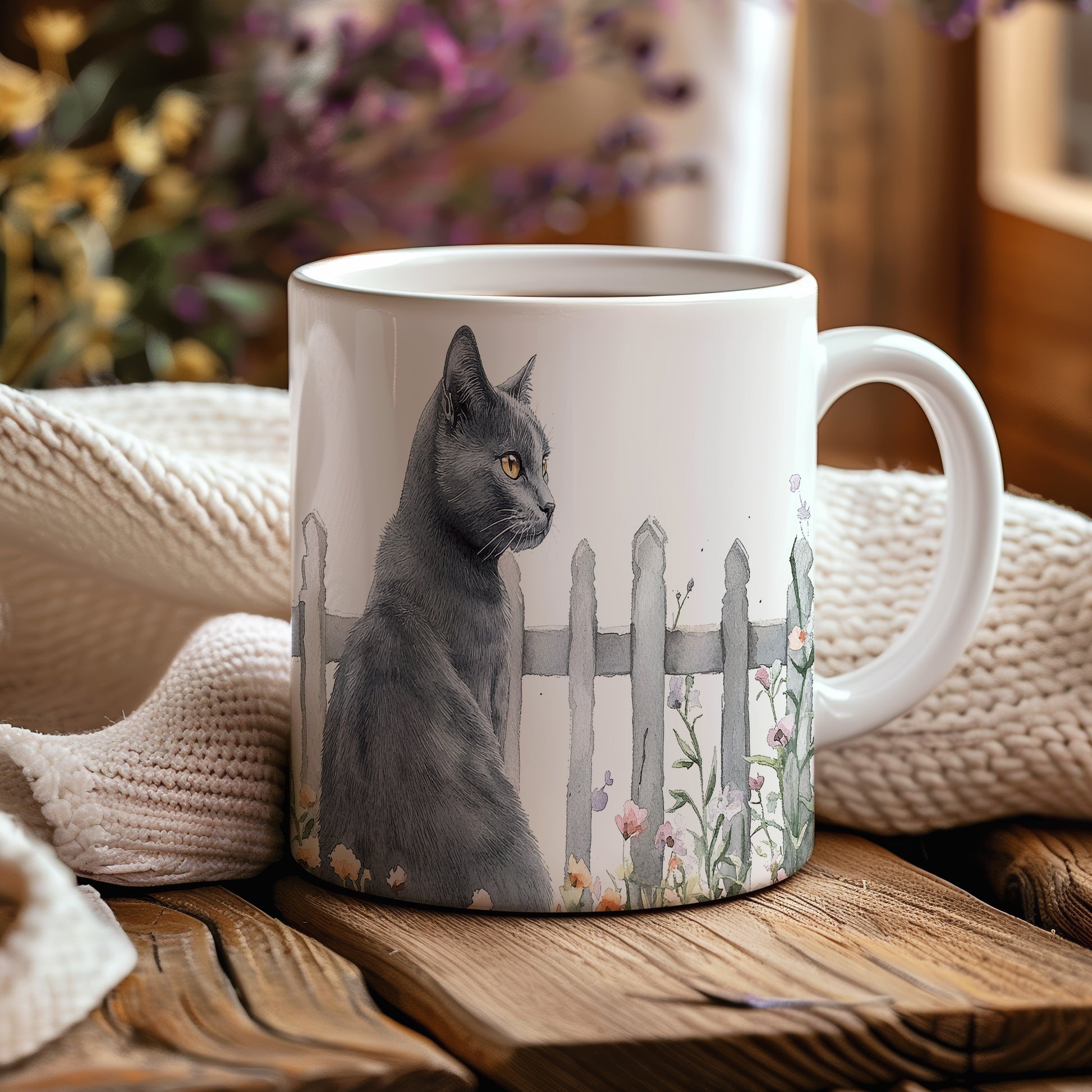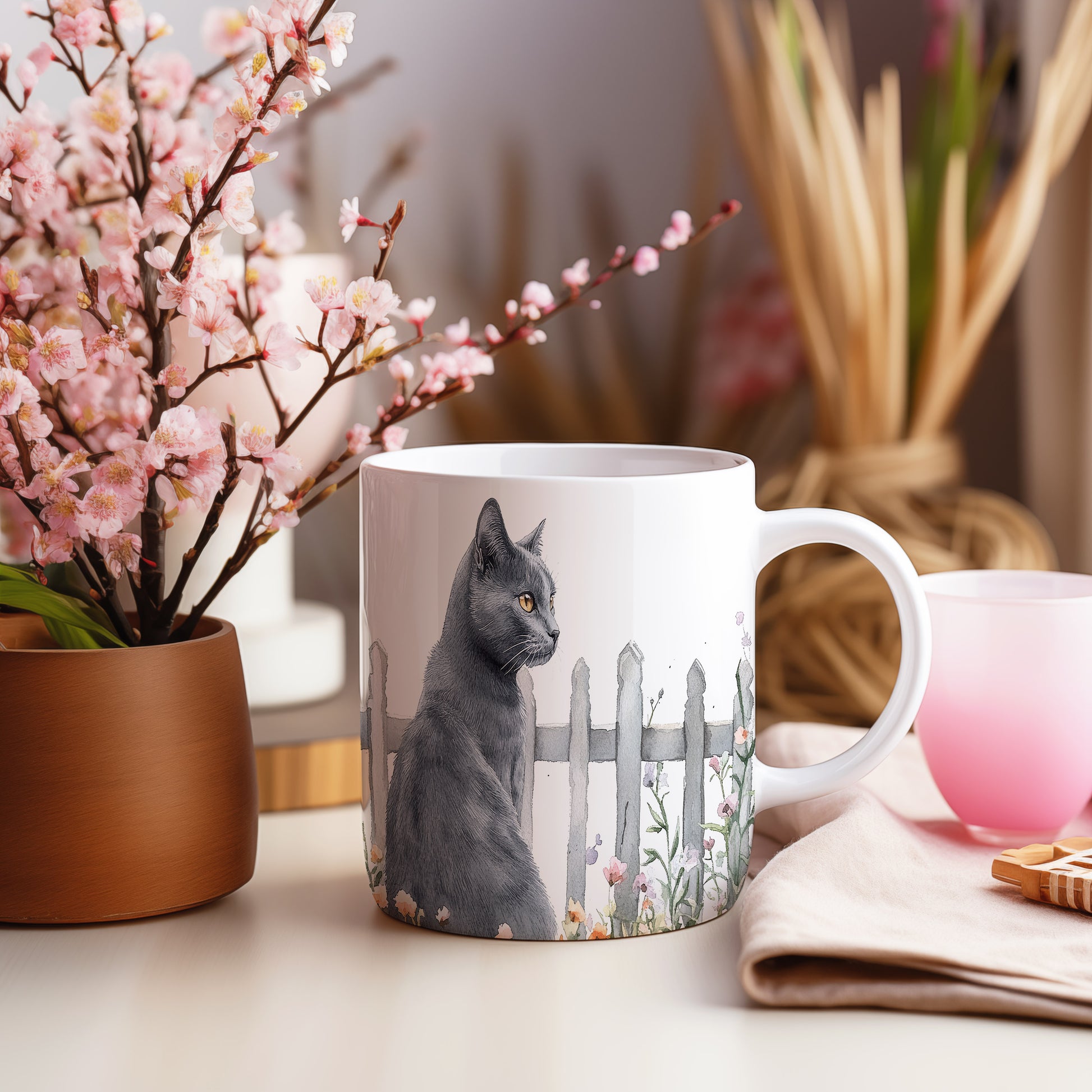 Hrnek se černou kočkou a květinami – malířským vzhledem