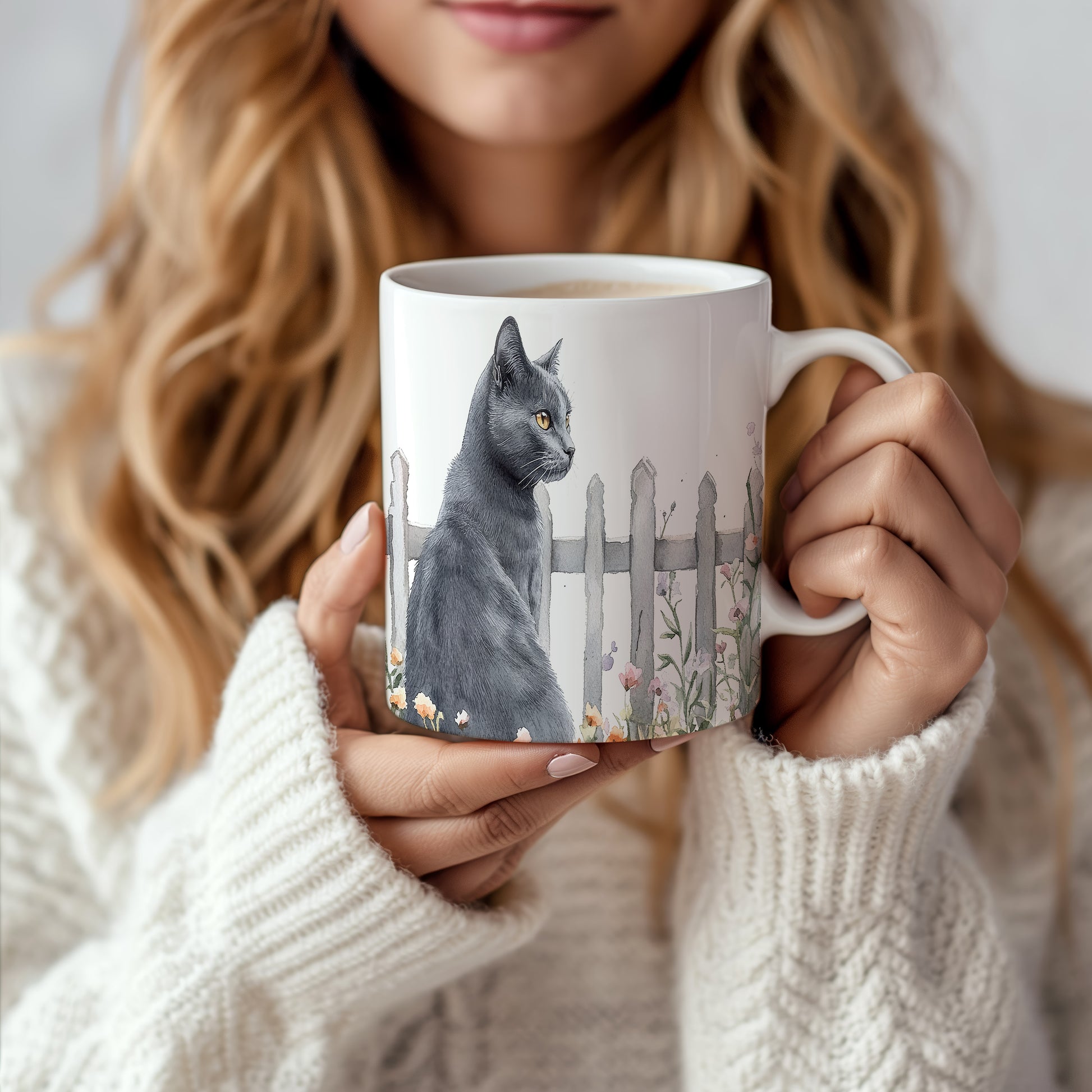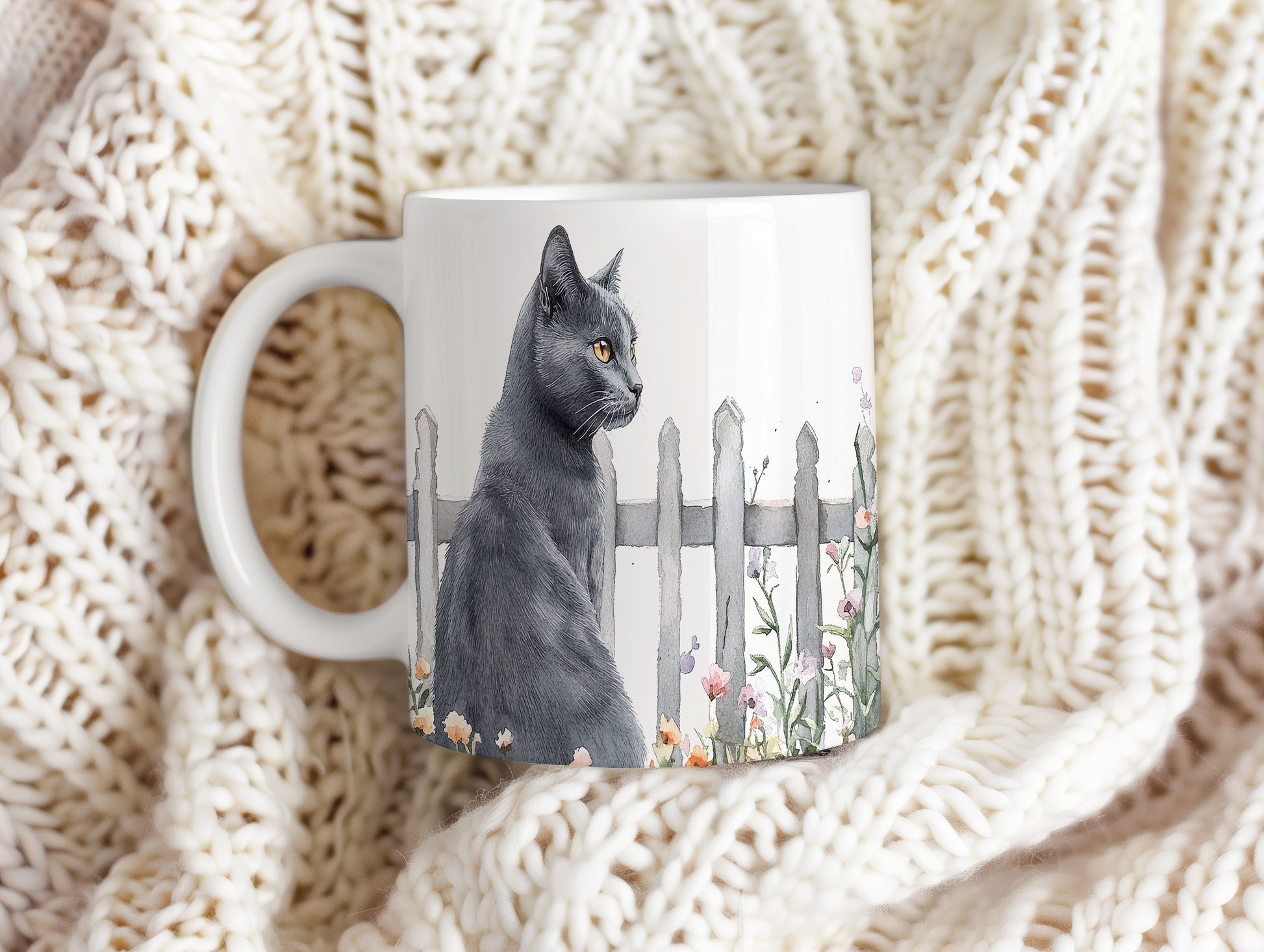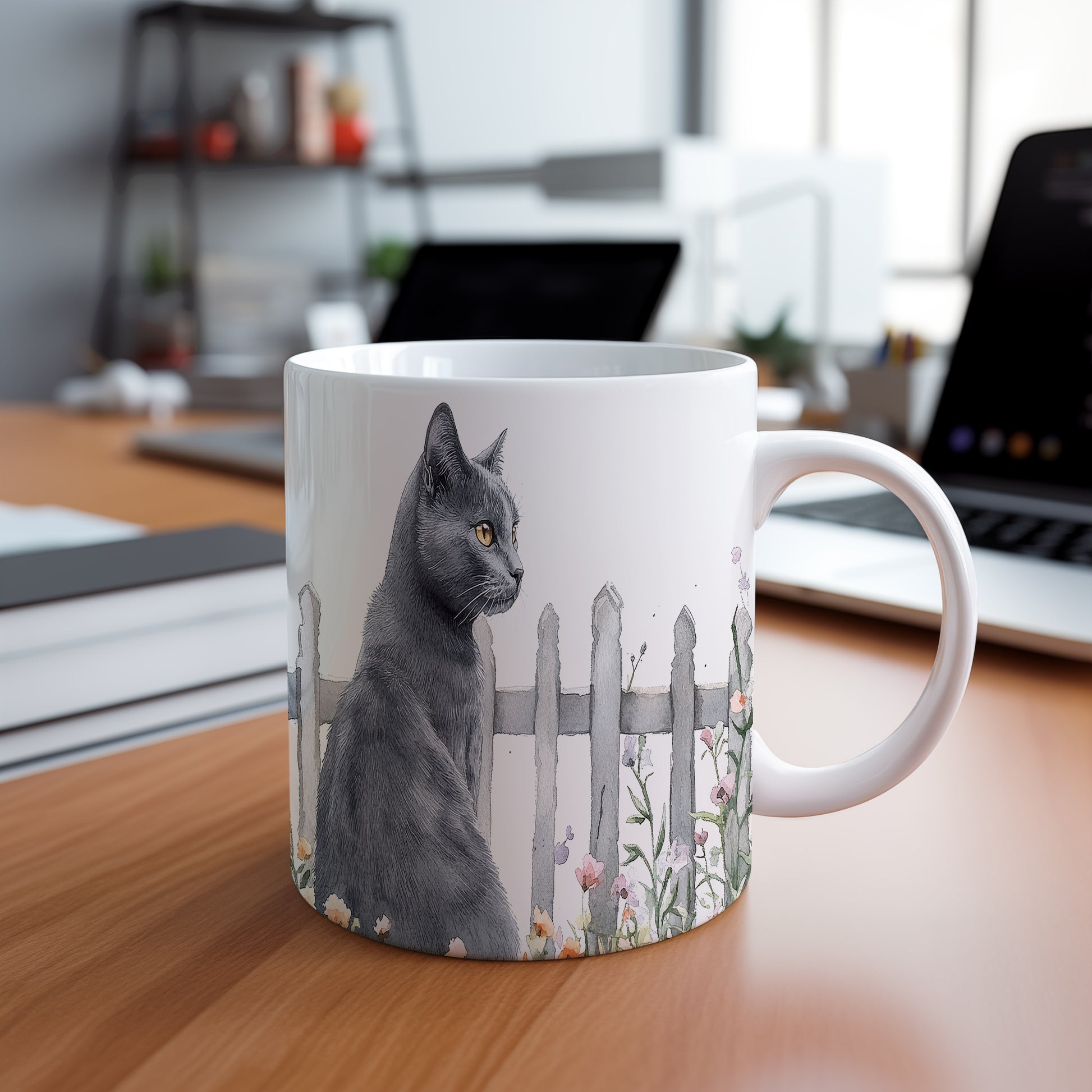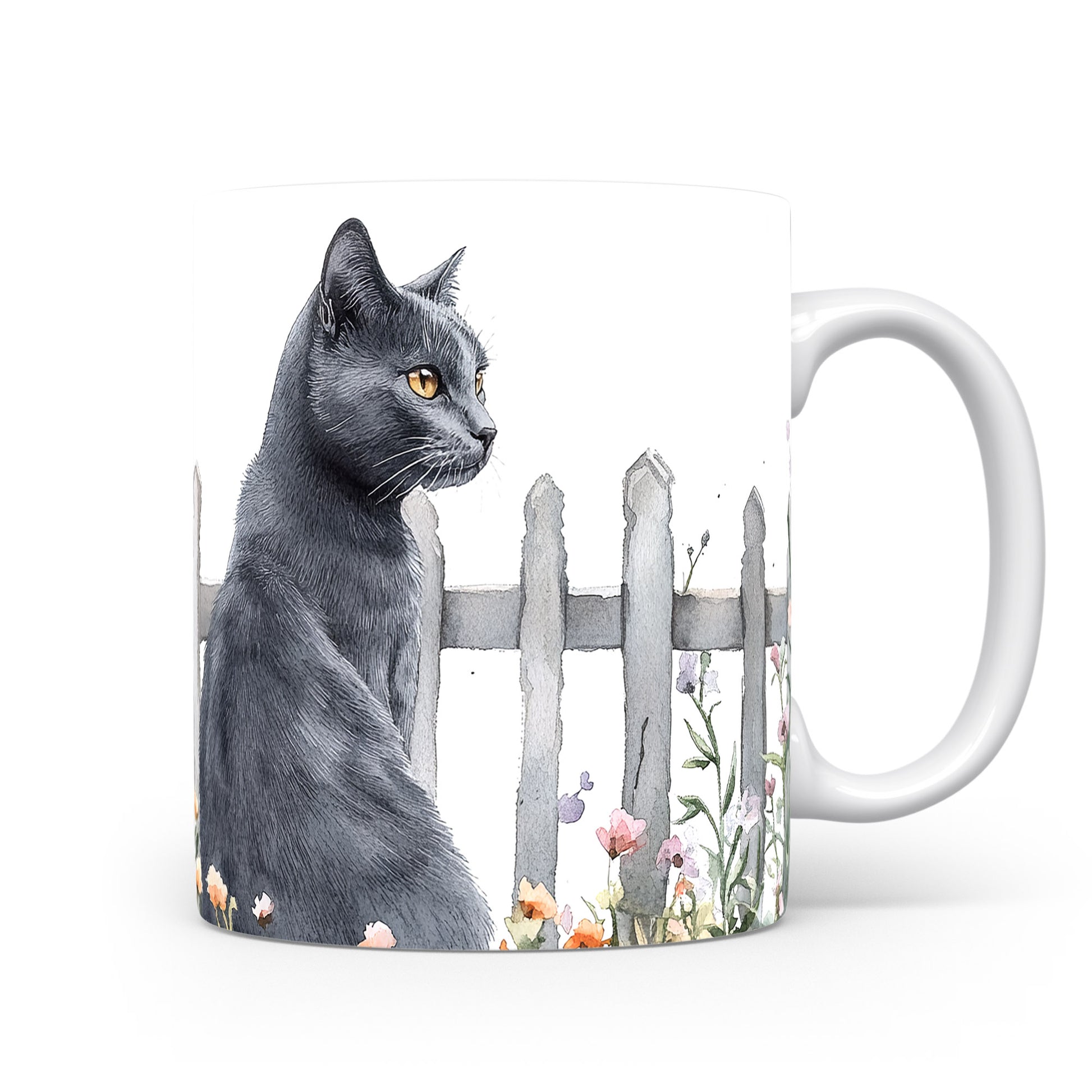 Hrnek se černou kočkou a květinami – malířským vzhledem