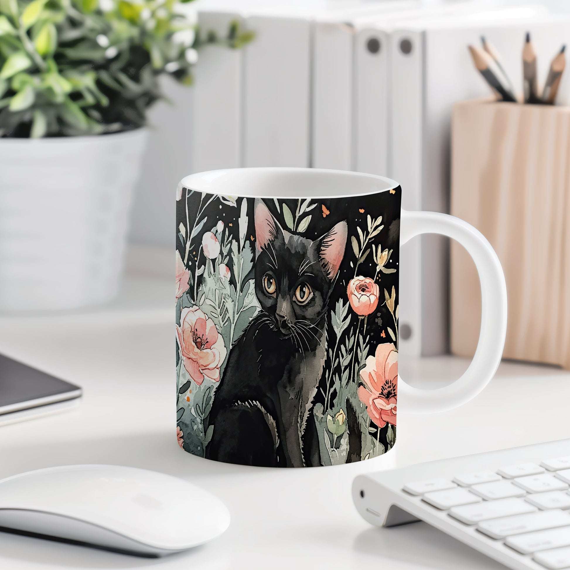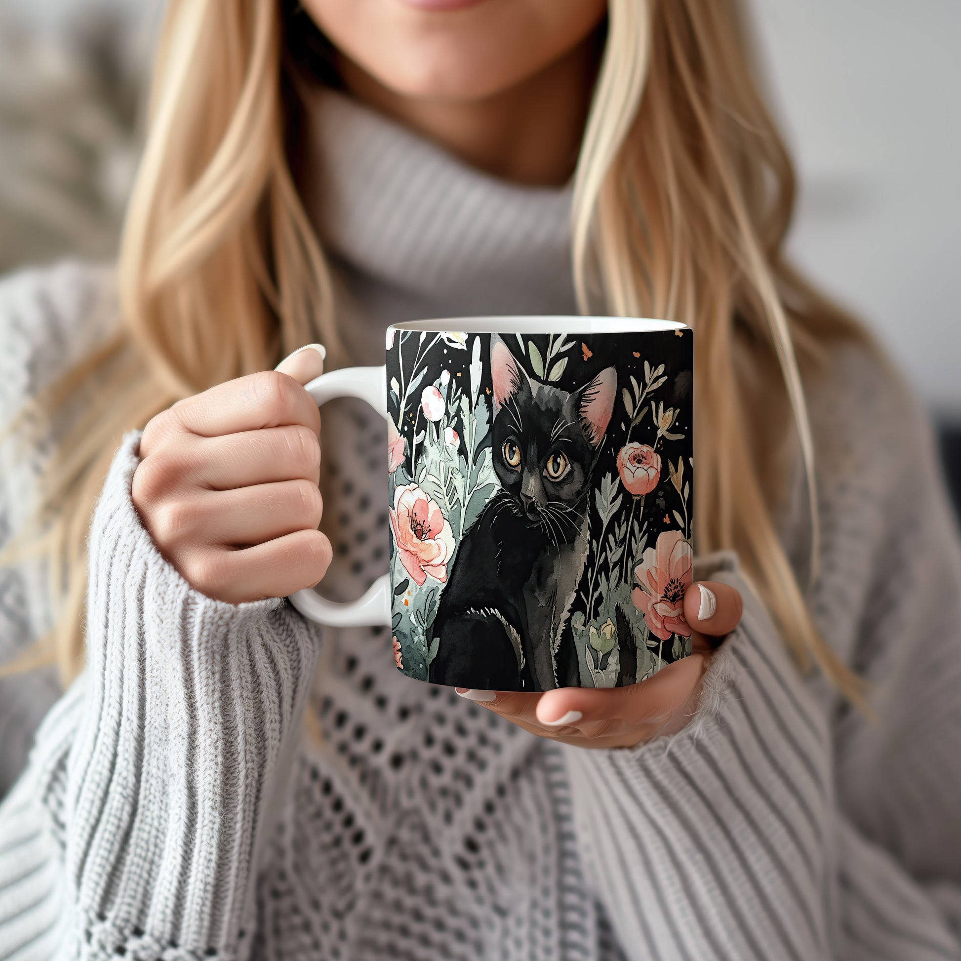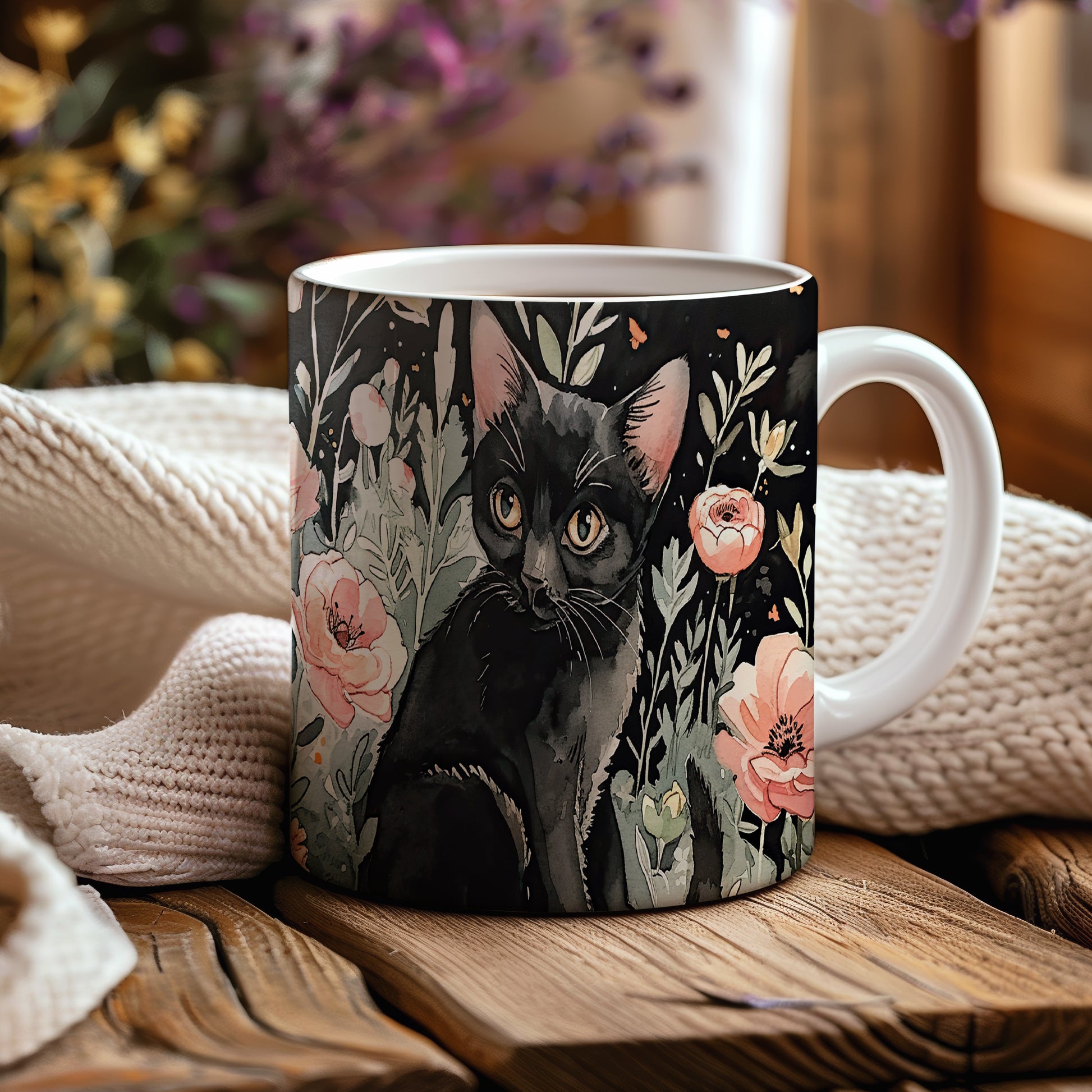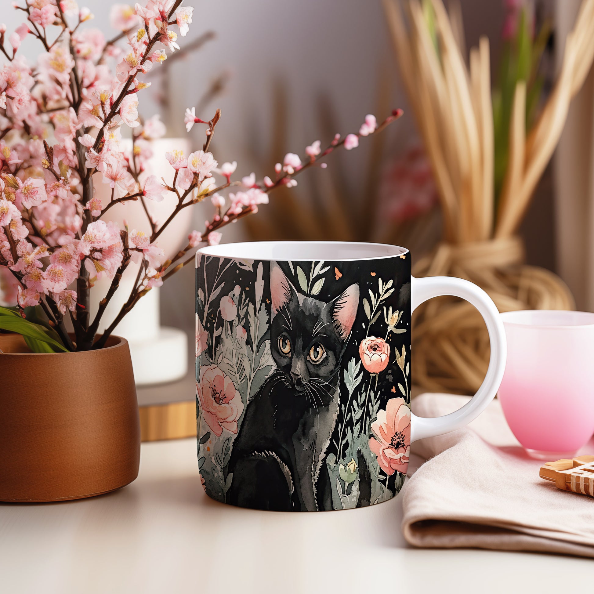 Tento hrnek zobrazuje černou kočku obklopenou krásnými květinami. Je ideální pro milovníky koček a přírody, skvělý tip na dárek pro přátele nebo rodinu. Materiál: keramika. Objem: 330 ml. Vhodné do myčky i mikrovlnky. Používání tohoto hrnku přináší radost a oživí každé pití.