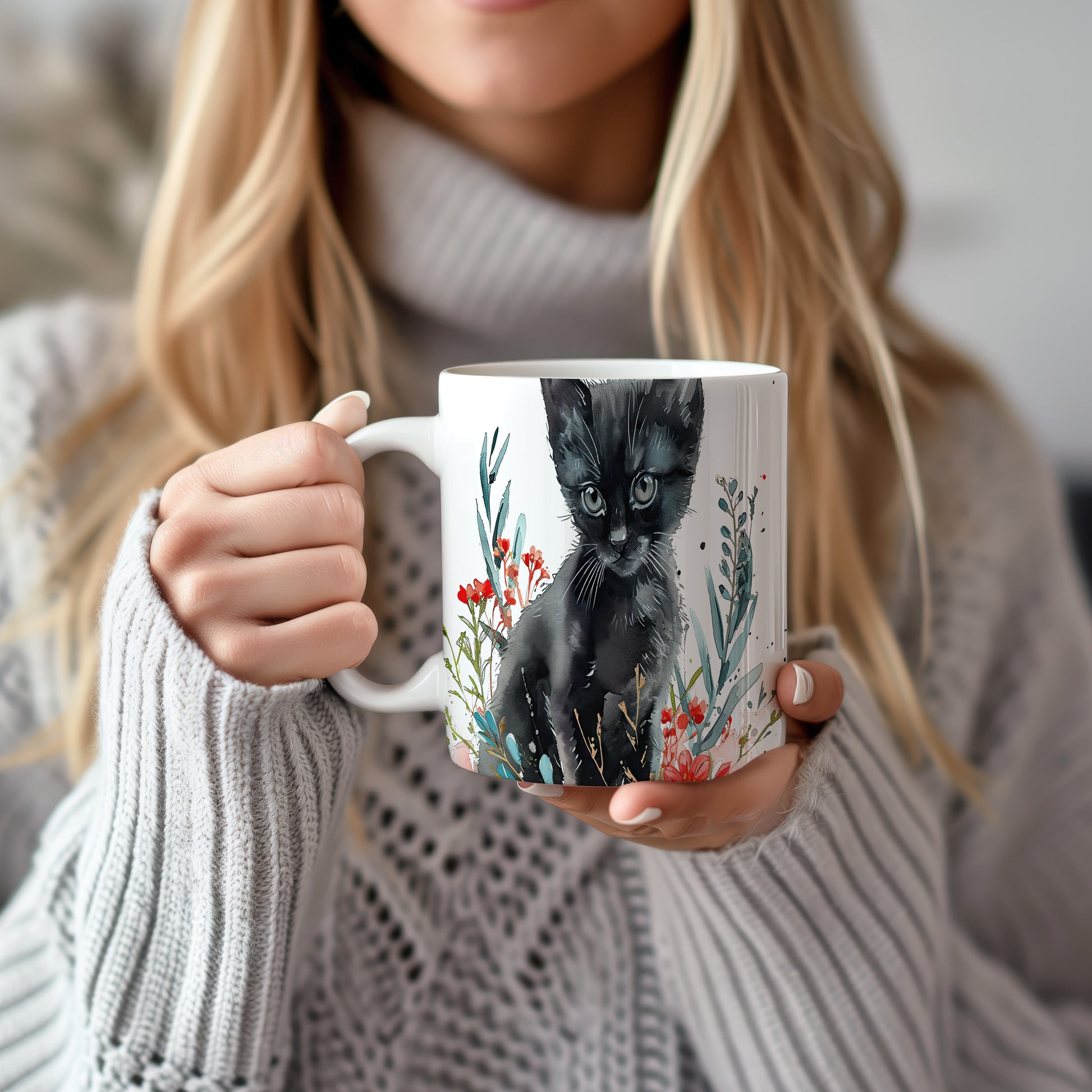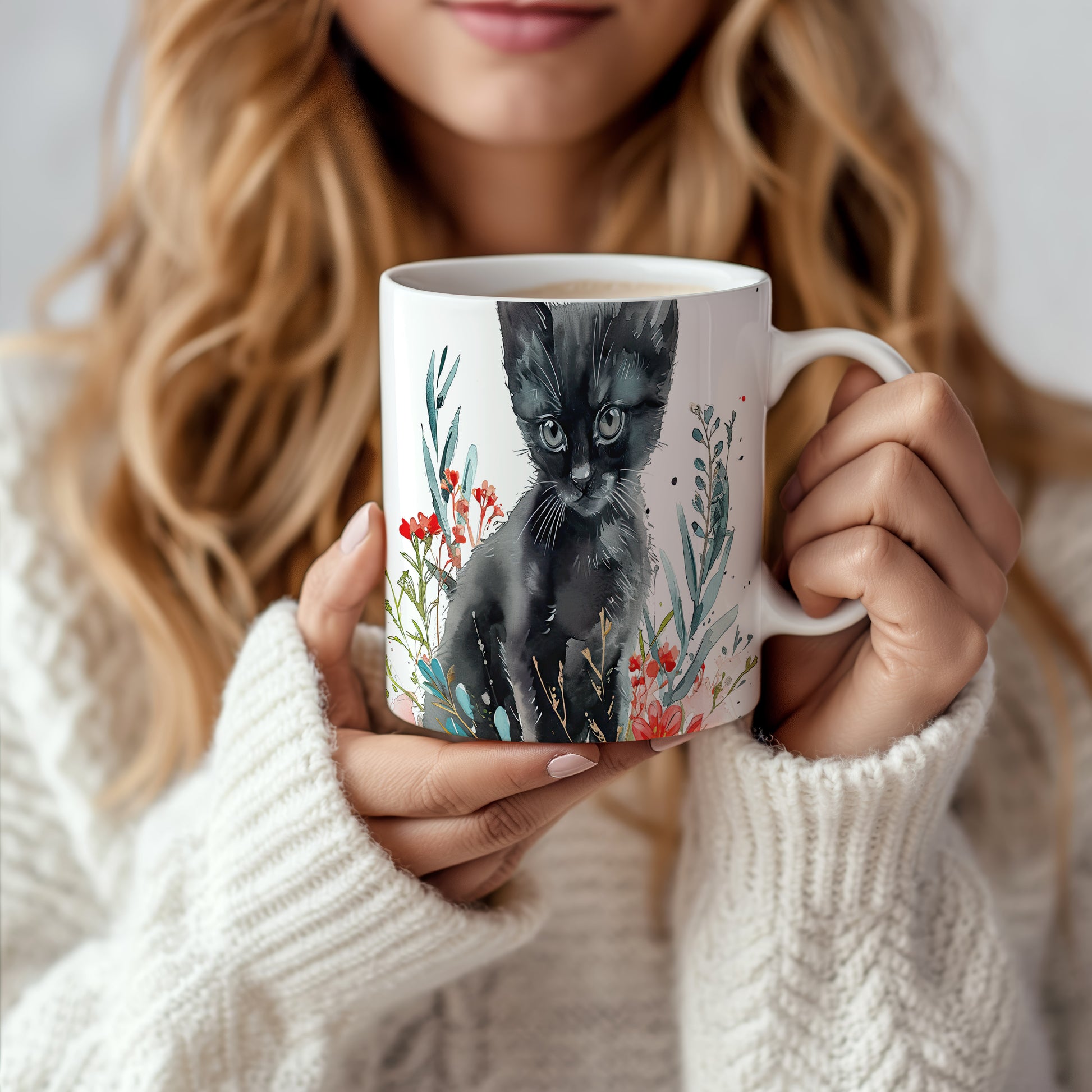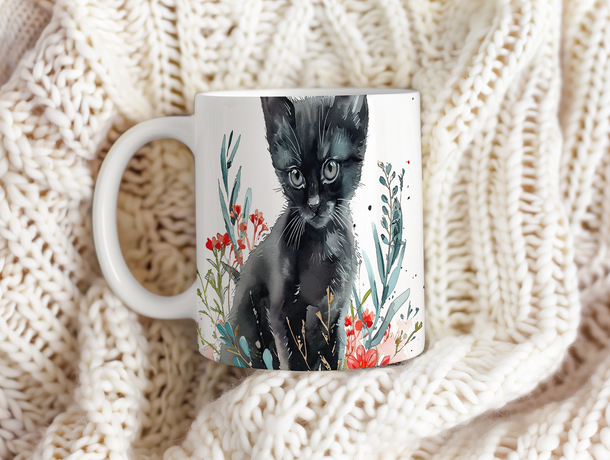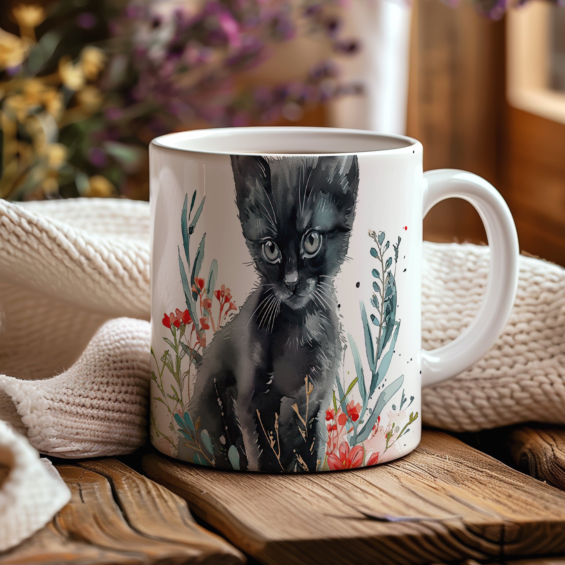 Tento hrnek zobrazuje černou kočku obklopenou barevnými květinami, což mu dodává hravý a veselý vzhled. Je ideální pro milovníky koček a květin, skvělý tip na dárek pro přátele nebo rodinu. Materiál: keramika. Objem: 330 ml. Vhodné do myčky i mikrovlnky. Používáním tohoto hrnku si užijete každý doušek vašeho oblíbeného nápoje.