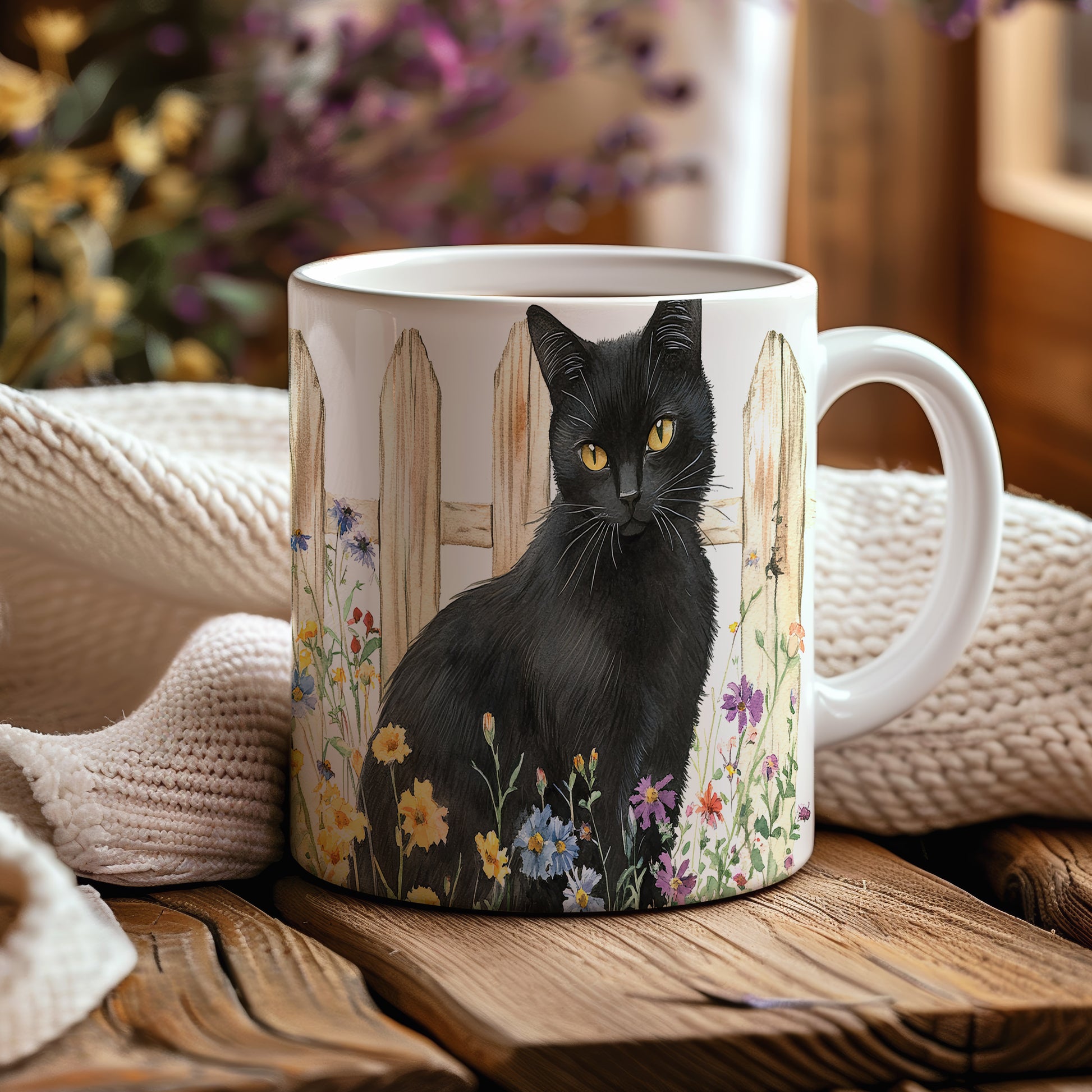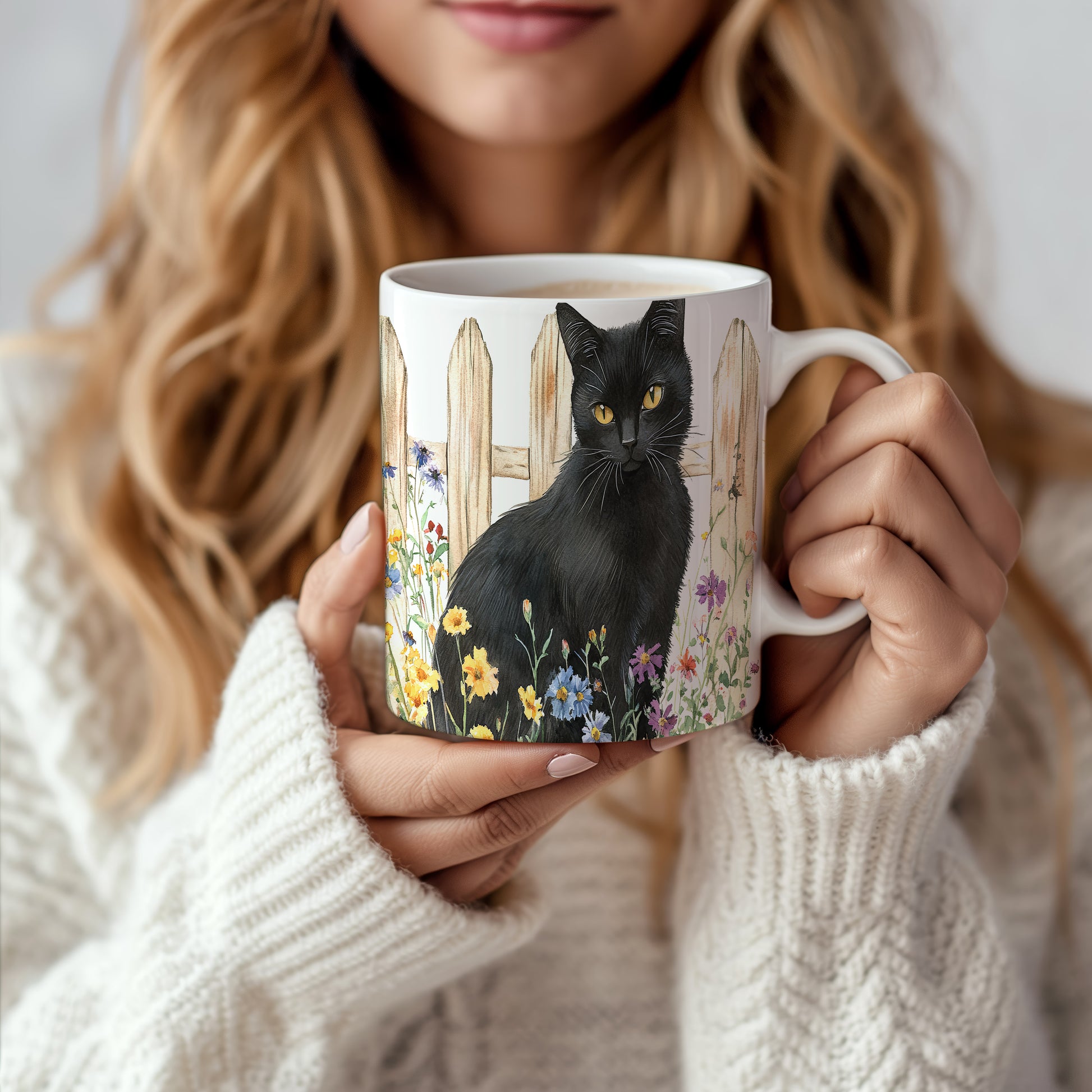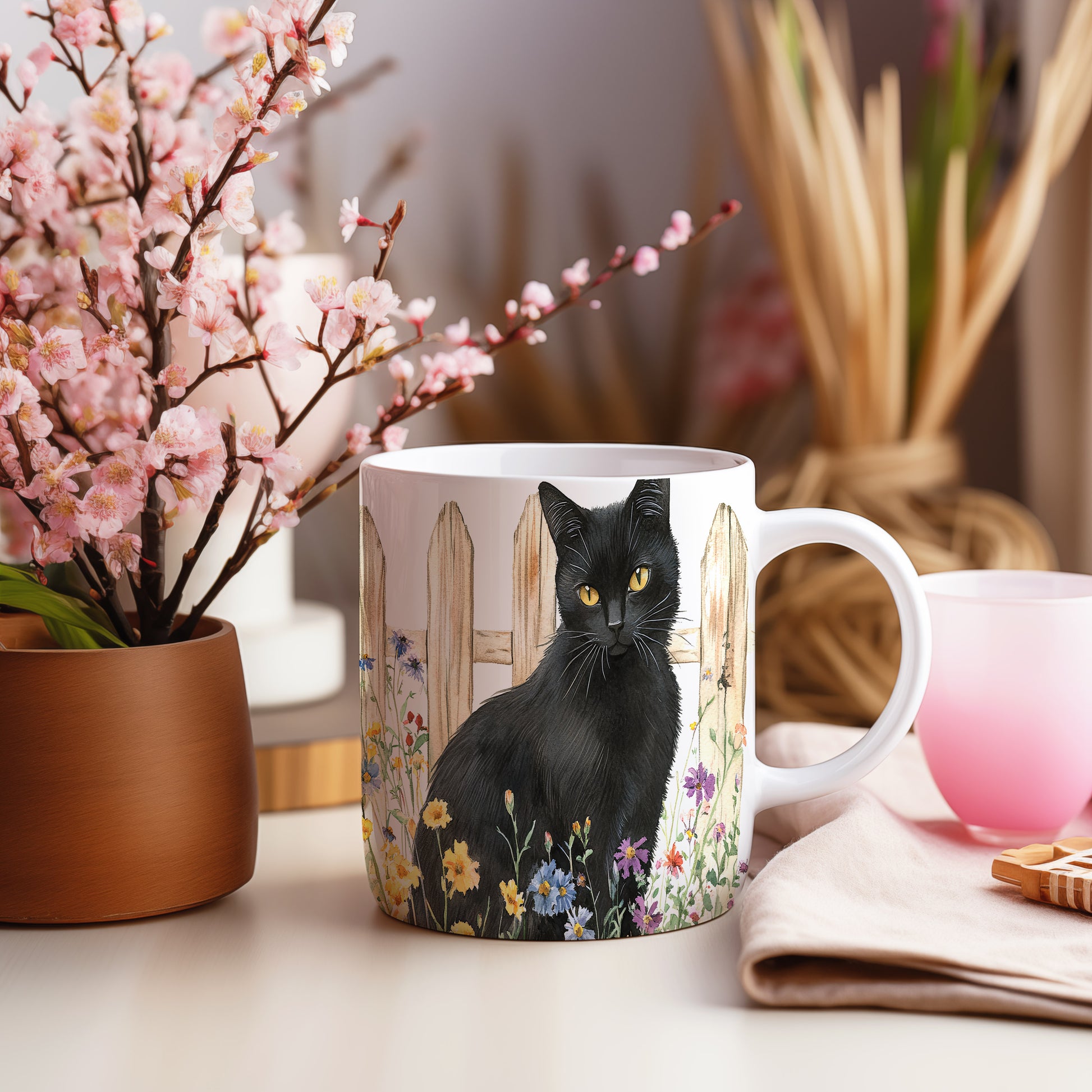 Tento hrnek zobrazuje elegantní černou kočku obklopenou rozkvetlými květinami. Je ideální pro milovníky zvířat a skvěle poslouží jako dárek pro přátele nebo rodinu. Materiál: keramika. Objem: 330 ml. Vhodné do myčky i mikrovlnky. Používání tohoto hrnku přináší radost z každého doušku.