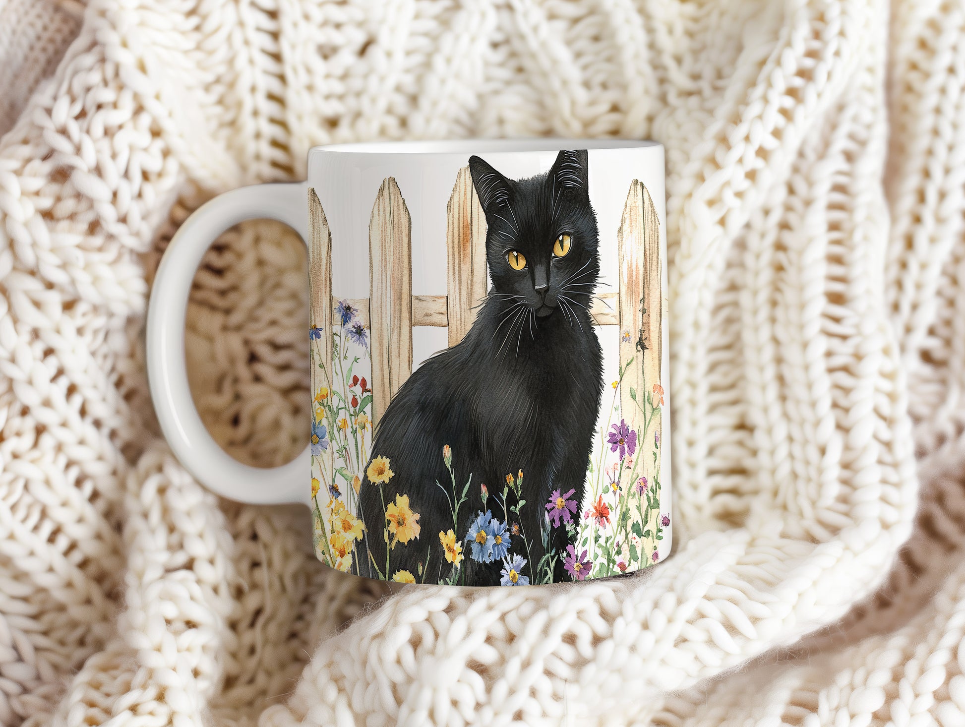 Hrnek se černou kočkou mezi květinami – černým akcentem