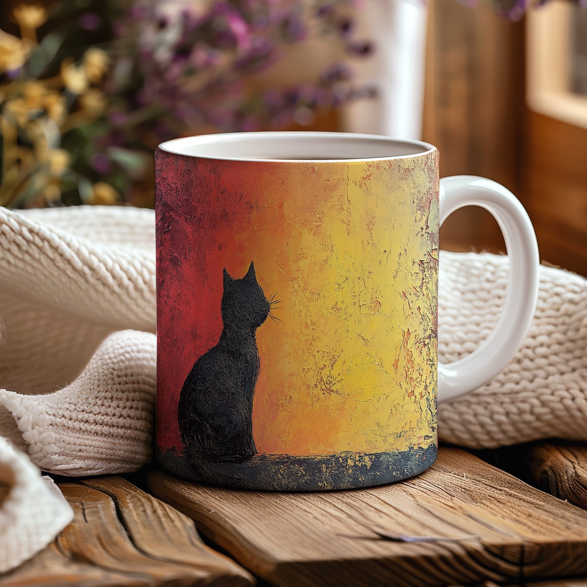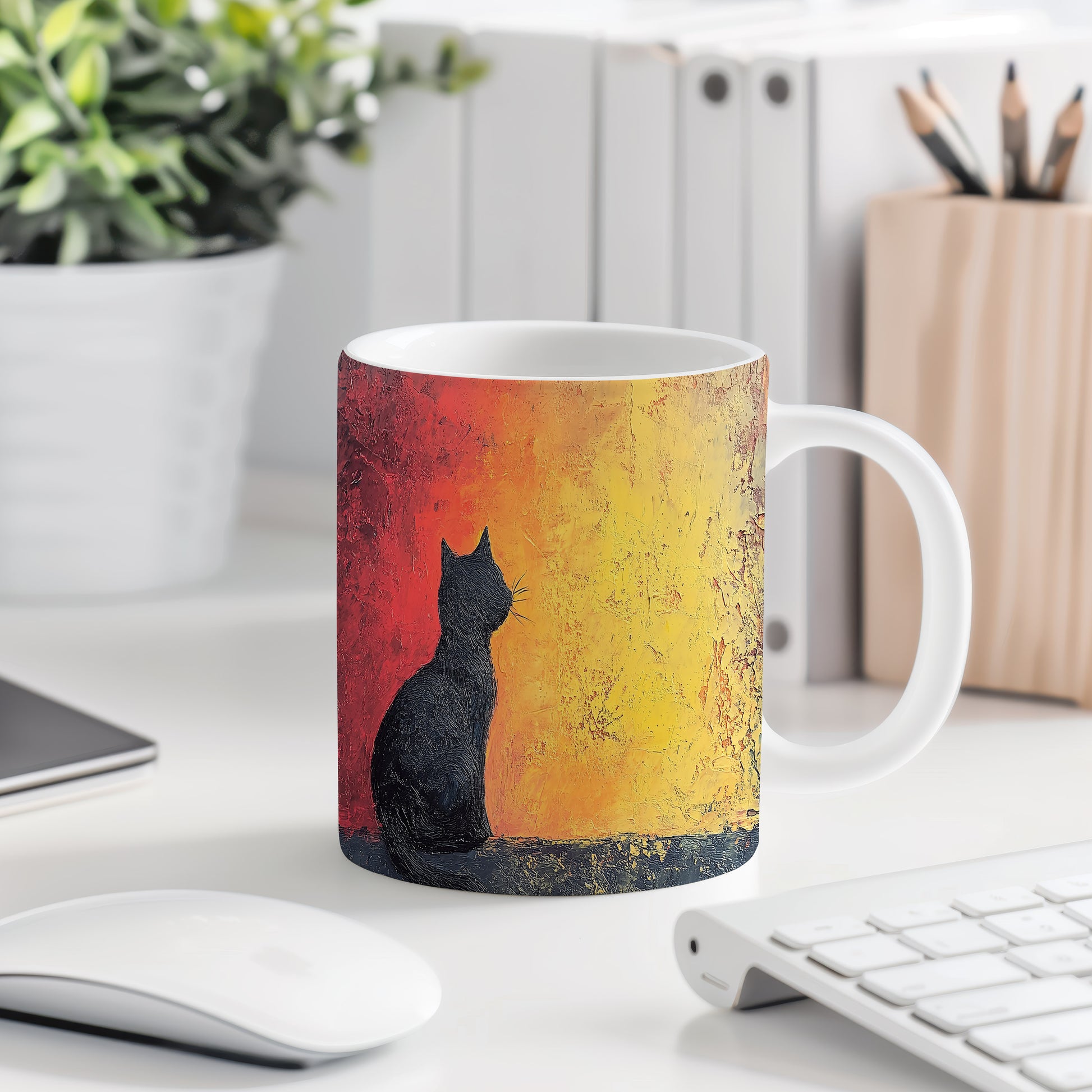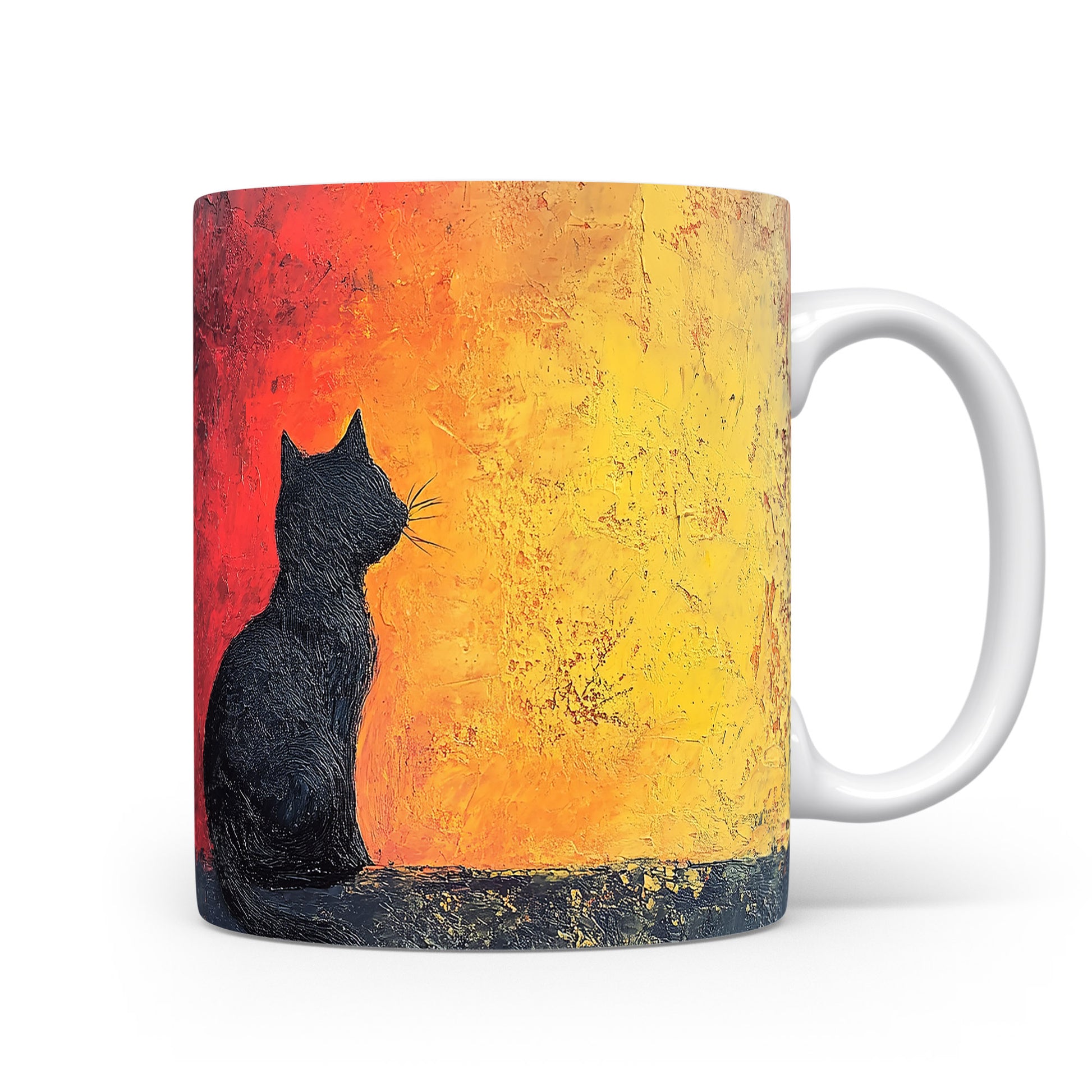 Hrnek s motivem černé kočky na pozadí západu slunce, elegantní a minimalistický design. Tento hrnek je skvělým dárkem pro milovníky koček a přírody. Materiál: keramika. Objem: 330 ml. Vhodné do myčky i mikrovlnky. Užijte si svůj oblíbený nápoj s tímto stylovým hrnkem, který přináší útulnou atmosféru.