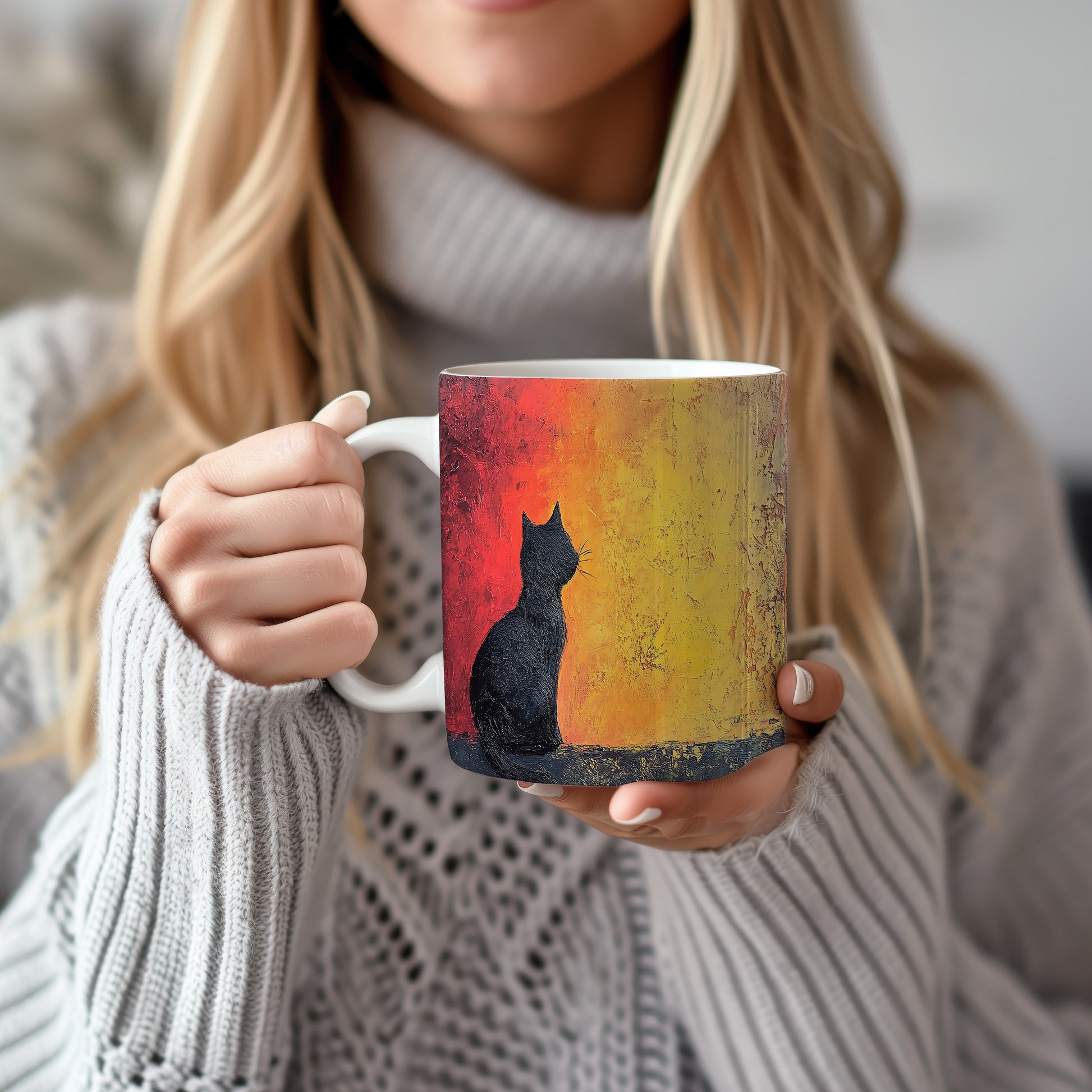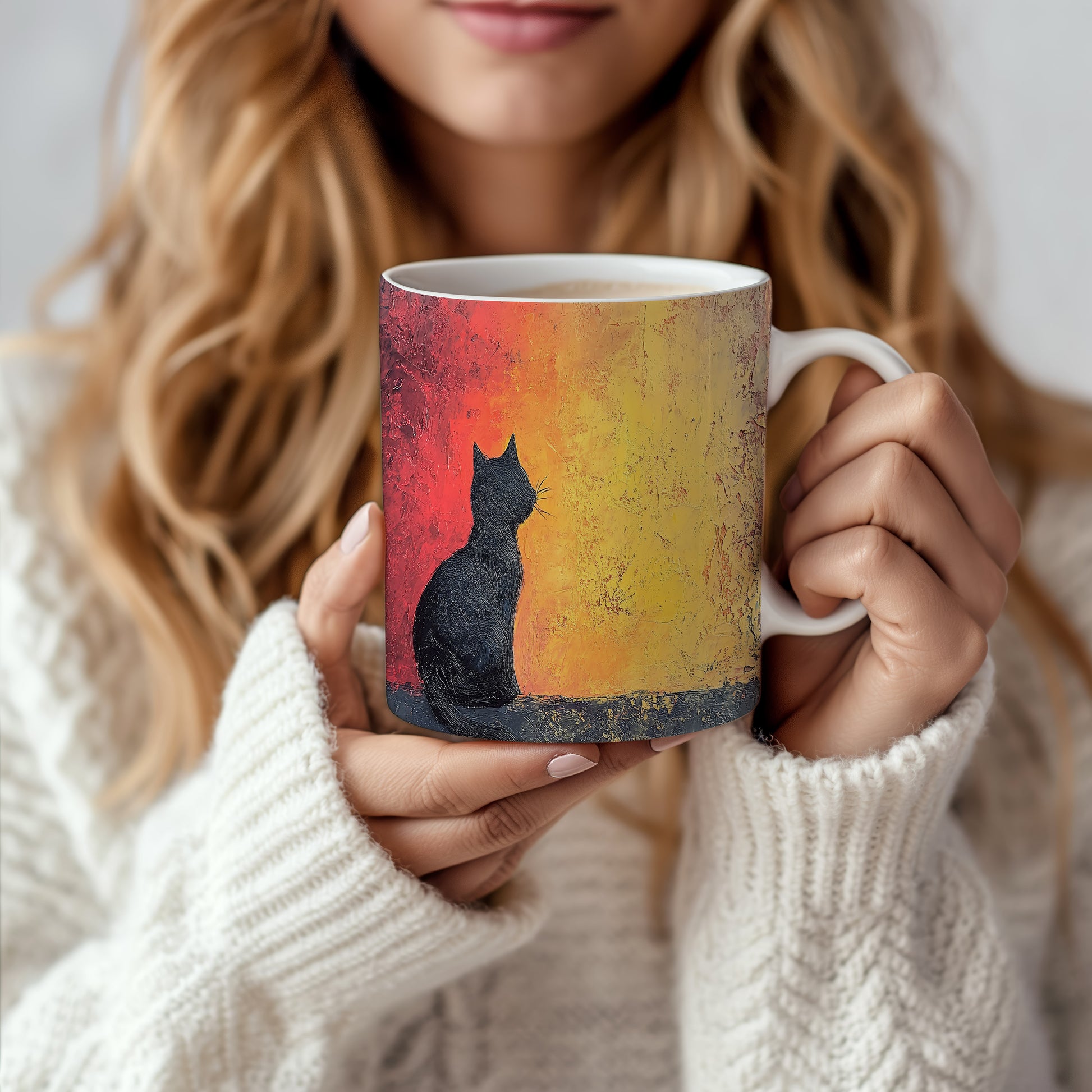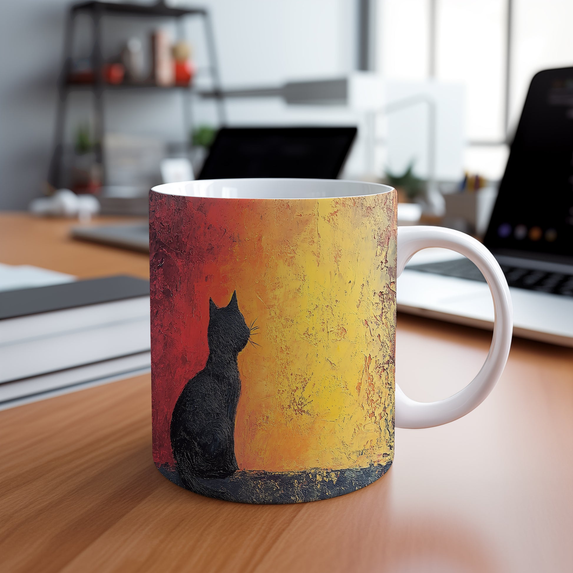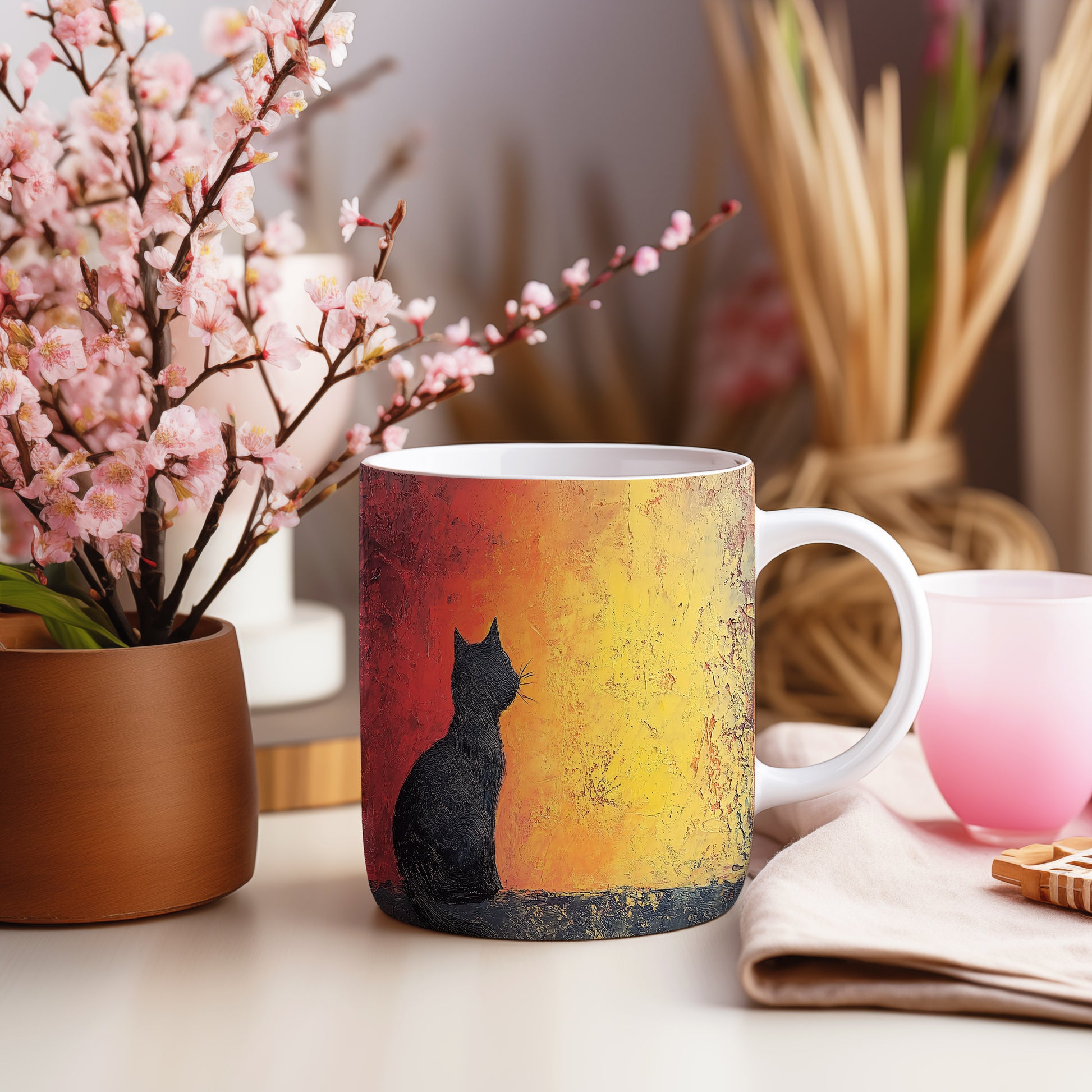 Hrnek s motivem černé kočky na pozadí západu slunce, elegantní a minimalistický design. Tento hrnek je skvělým dárkem pro milovníky koček a přírody. Materiál: keramika. Objem: 330 ml. Vhodné do myčky i mikrovlnky. Užijte si svůj oblíbený nápoj s tímto stylovým hrnkem, který přináší útulnou atmosféru.