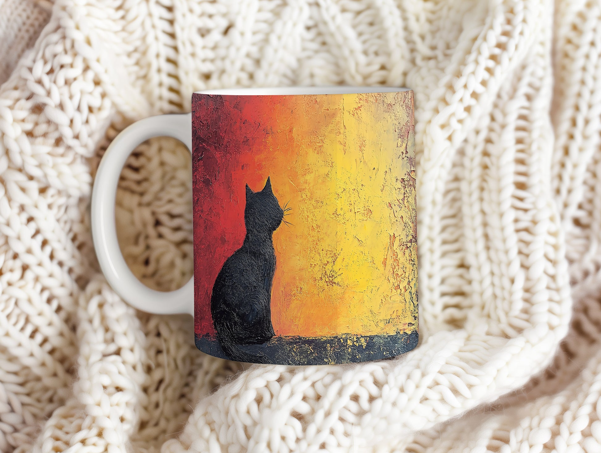 Hrnek se černou kočkou na pozadí západu slunce
