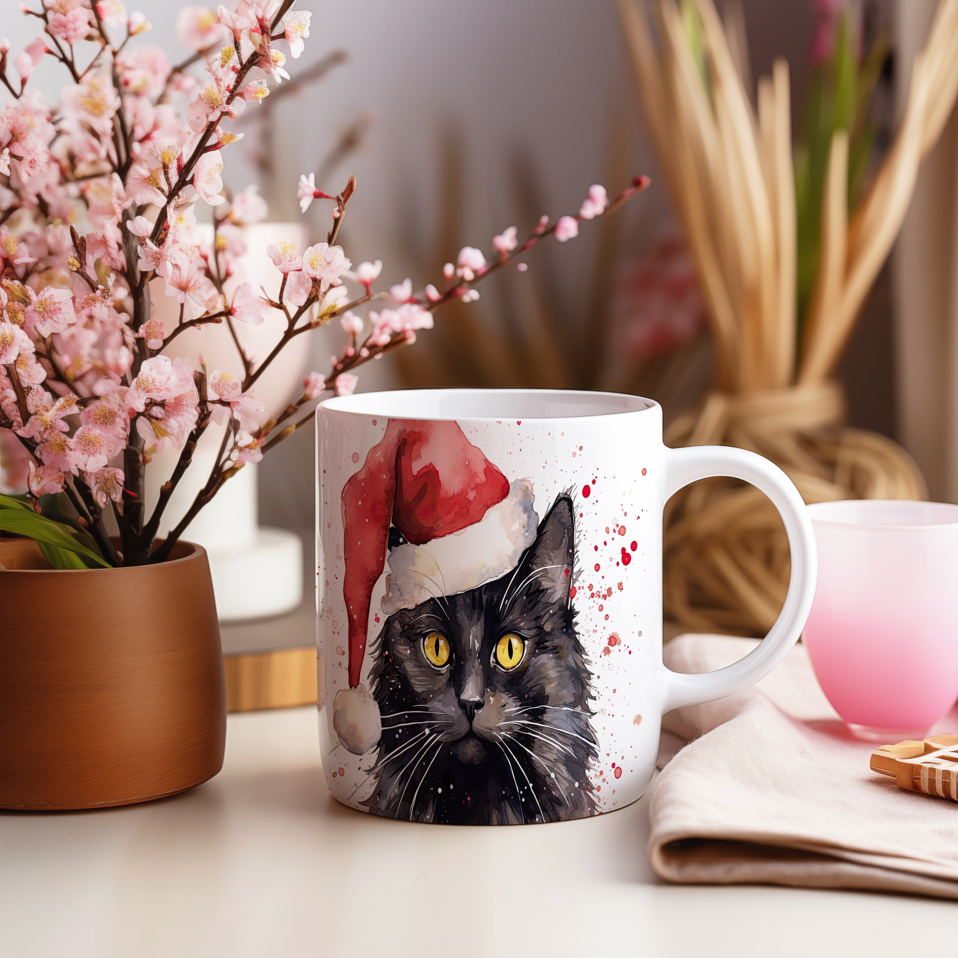 Hrnek se černou kočkou v červené čepici