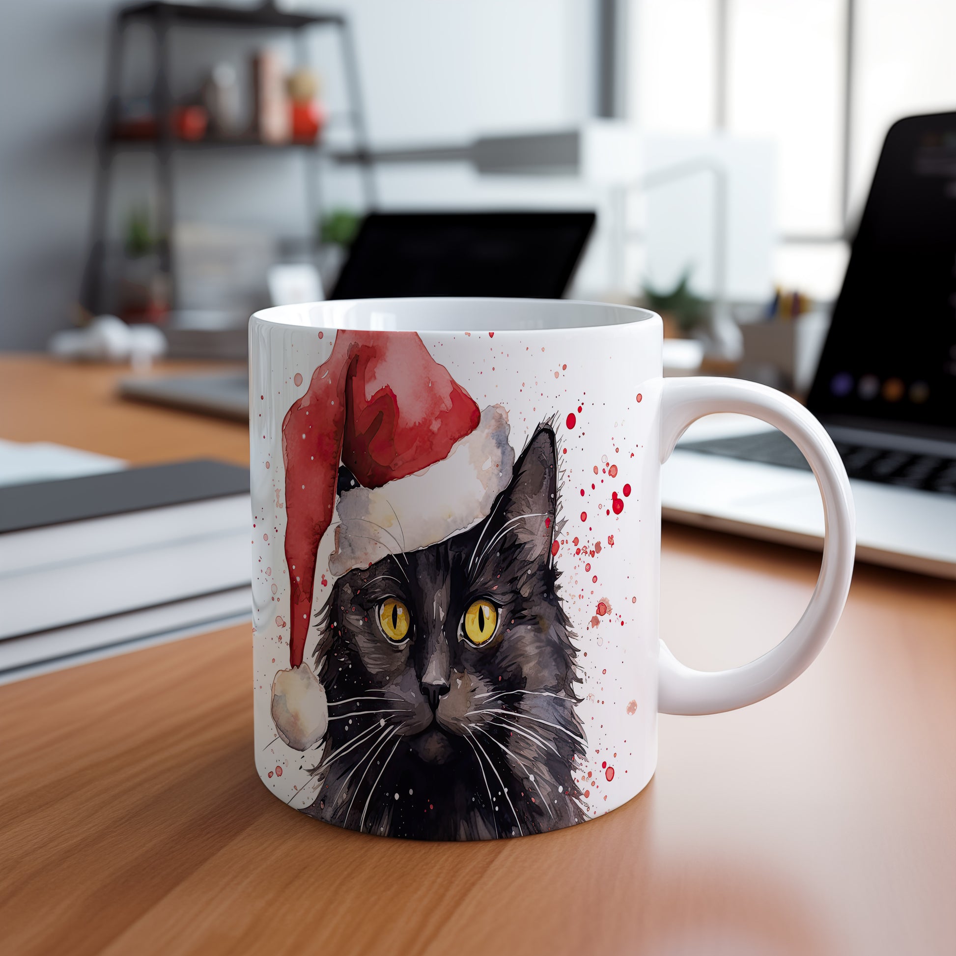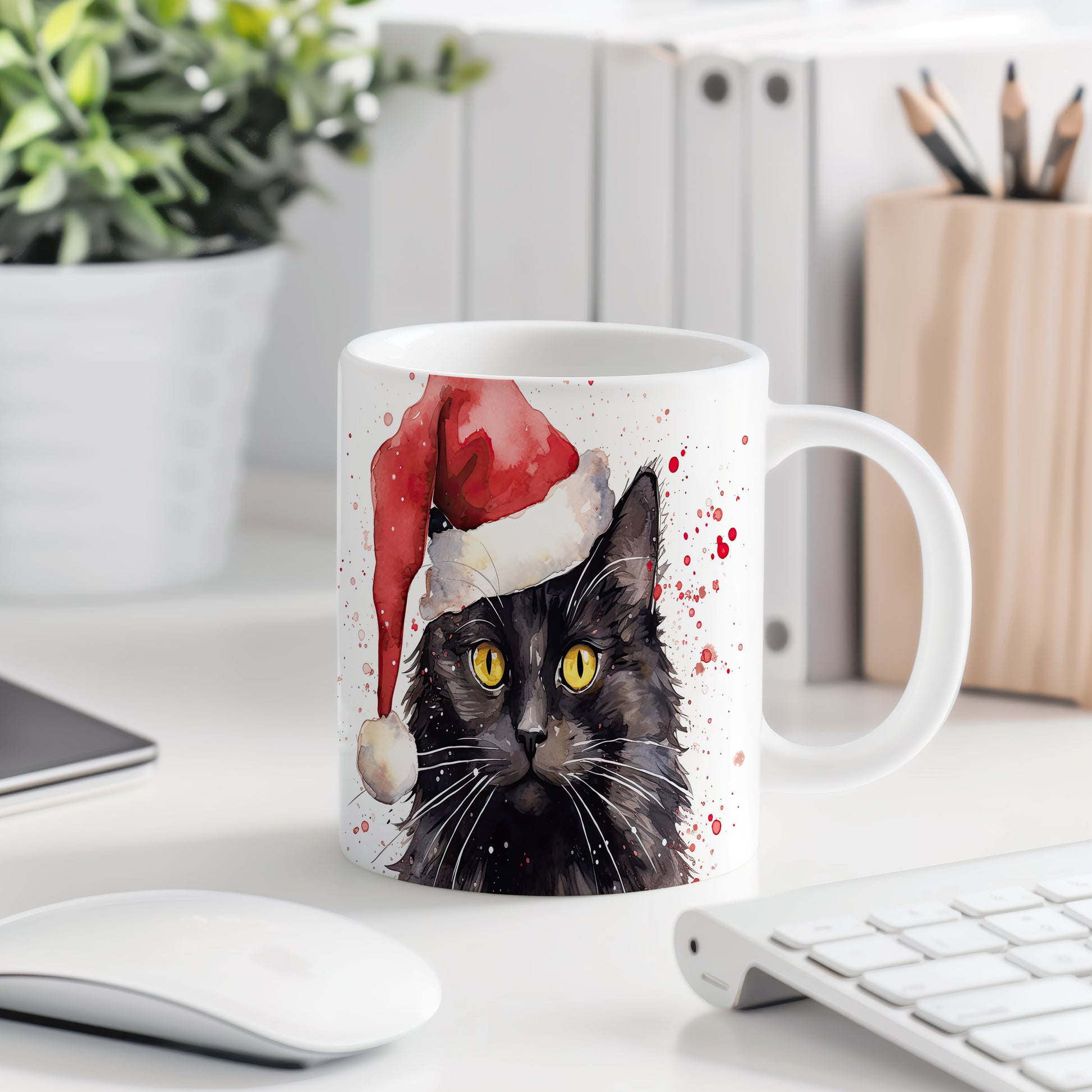 Tento keramický hrnek s motivem černé kočky v červené čepici je skvělým doplňkem pro milovníky koček. Je ideální jako dárek pro přátele nebo rodinu, kteří si potrpí na originální design. Materiál: keramika. Objem: 330 ml. Vhodné do myčky i mikrovlnky. Díky svému jedinečnému vzhledu přináší do každodenního pití radost a styl.
