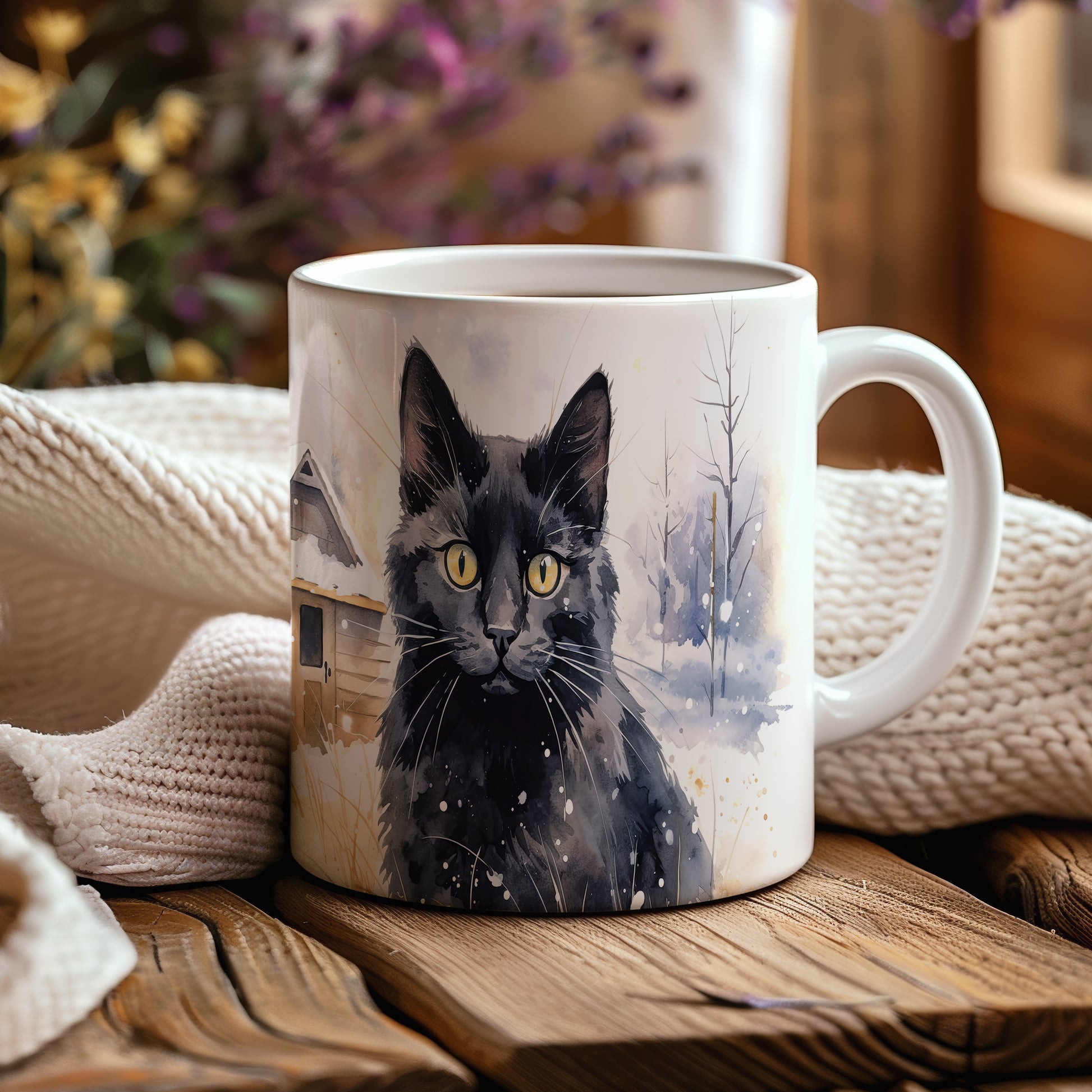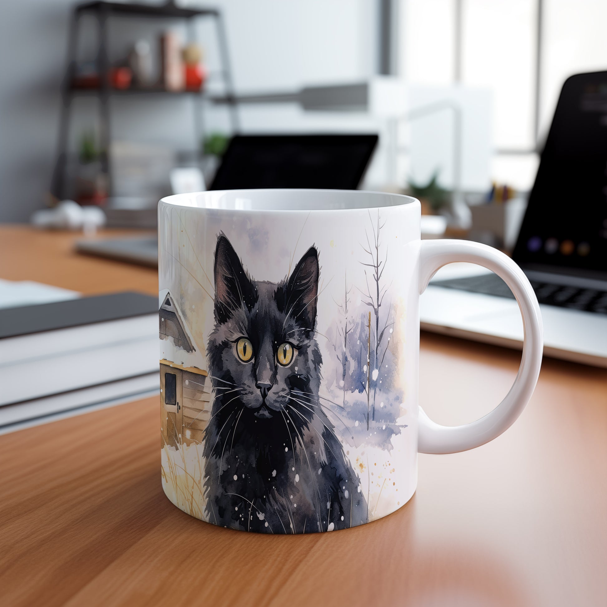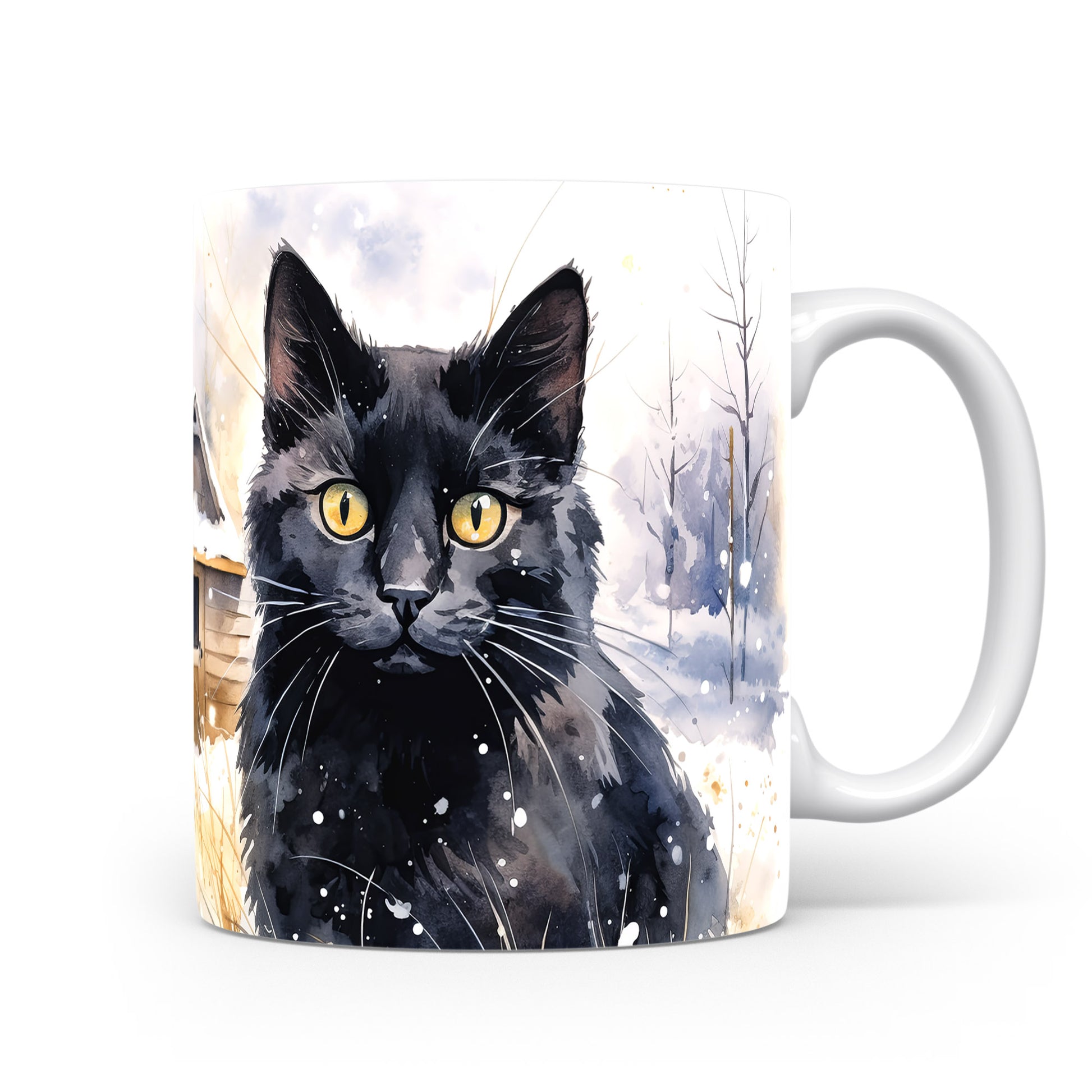 Tento hrnek zobrazuje černou kočku s výraznýma zlatýma očima na pozadí zasněžené krajiny. Je ideální pro milovníky koček a skvělým dárkem pro každého, kdo ocení krásu přírody. Materiál: keramika. Objem: 330 ml. Vhodné do myčky i mikrovlnky. Používání tohoto hrnku přináší radost a útulnost do každého dne.