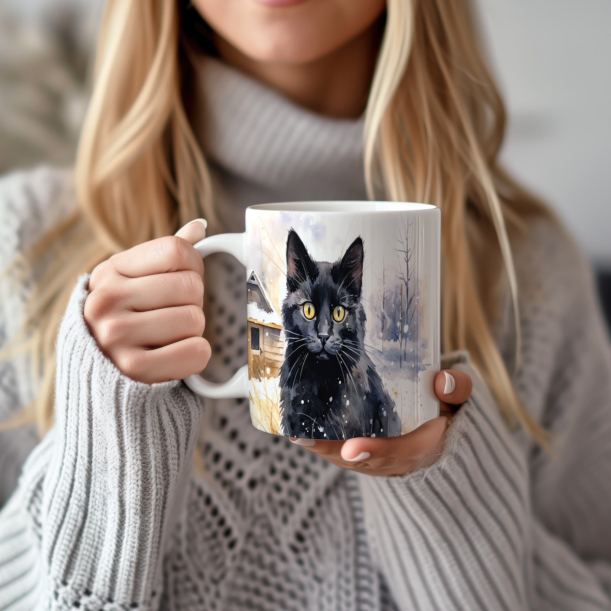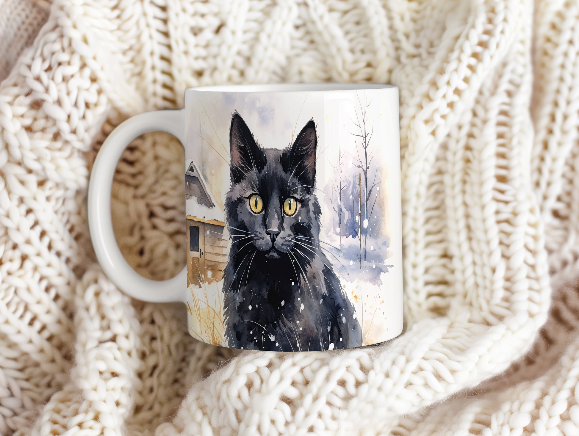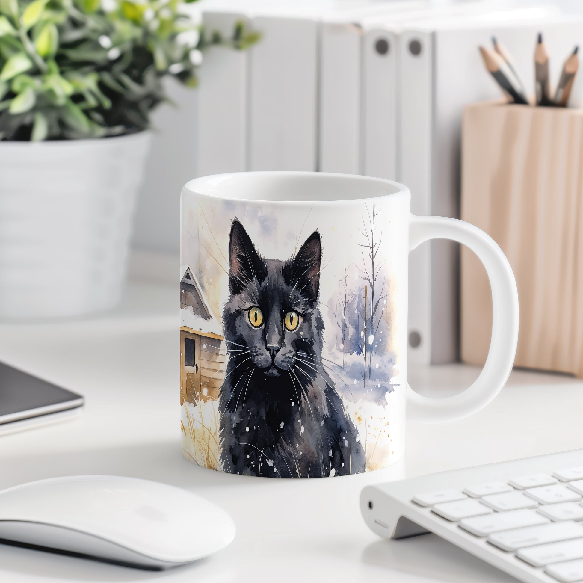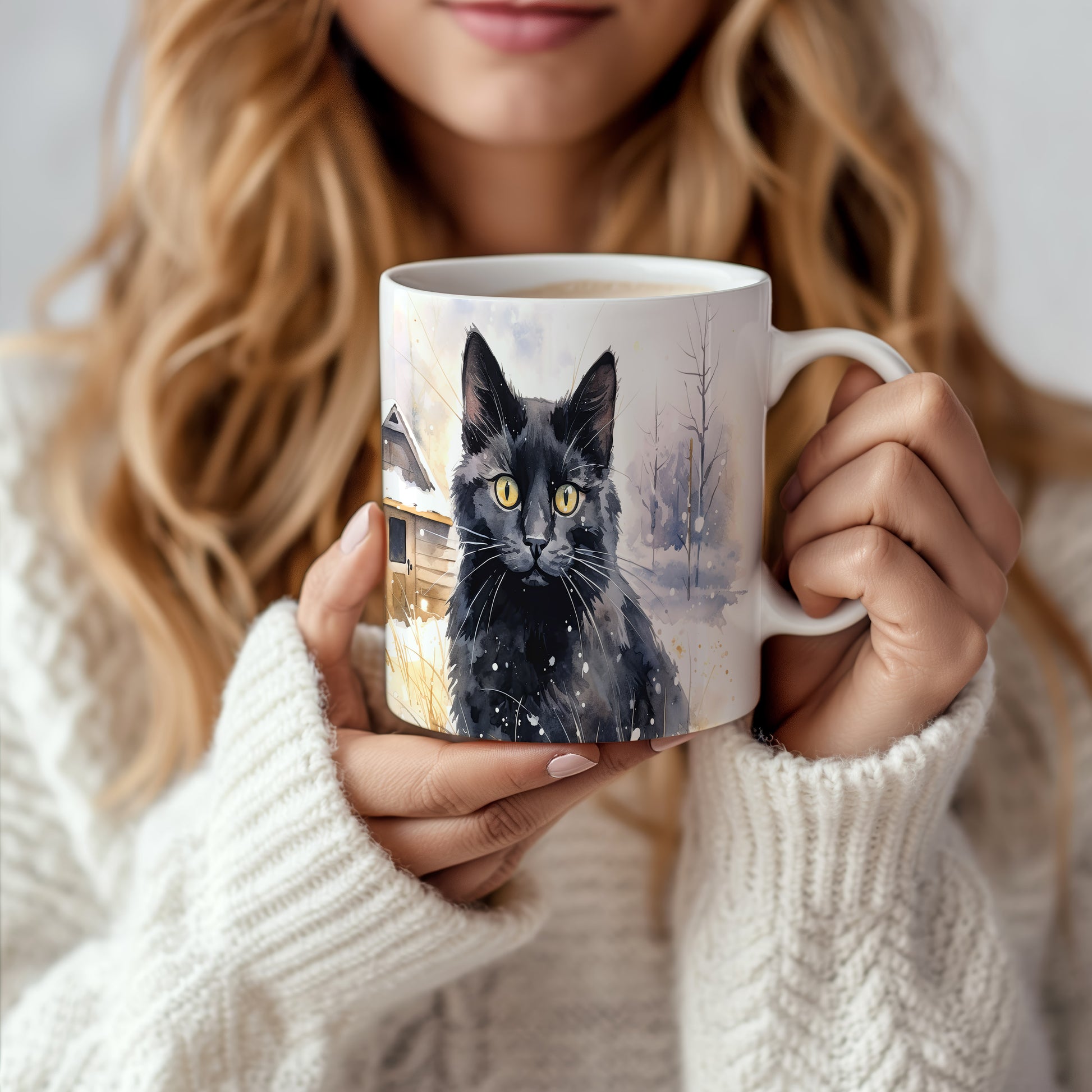Tento hrnek zobrazuje černou kočku s výraznýma zlatýma očima na pozadí zasněžené krajiny. Je ideální pro milovníky koček a skvělým dárkem pro každého, kdo ocení krásu přírody. Materiál: keramika. Objem: 330 ml. Vhodné do myčky i mikrovlnky. Používání tohoto hrnku přináší radost a útulnost do každého dne.