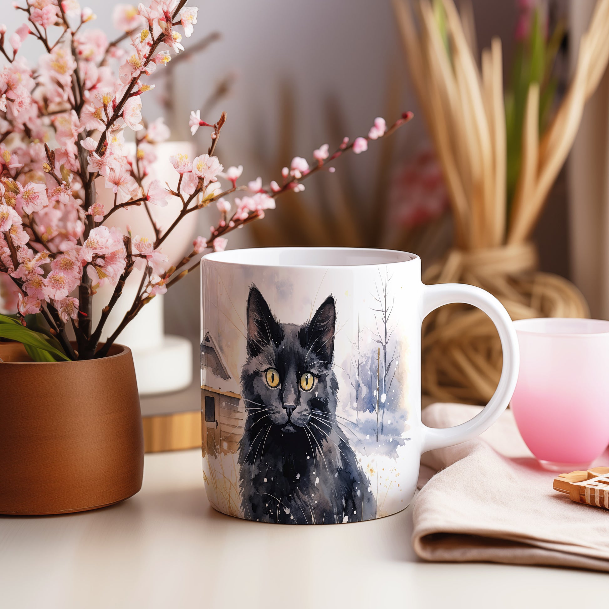 Hrnek se černou kočkou v zasněžené krajině – černobílým motivem