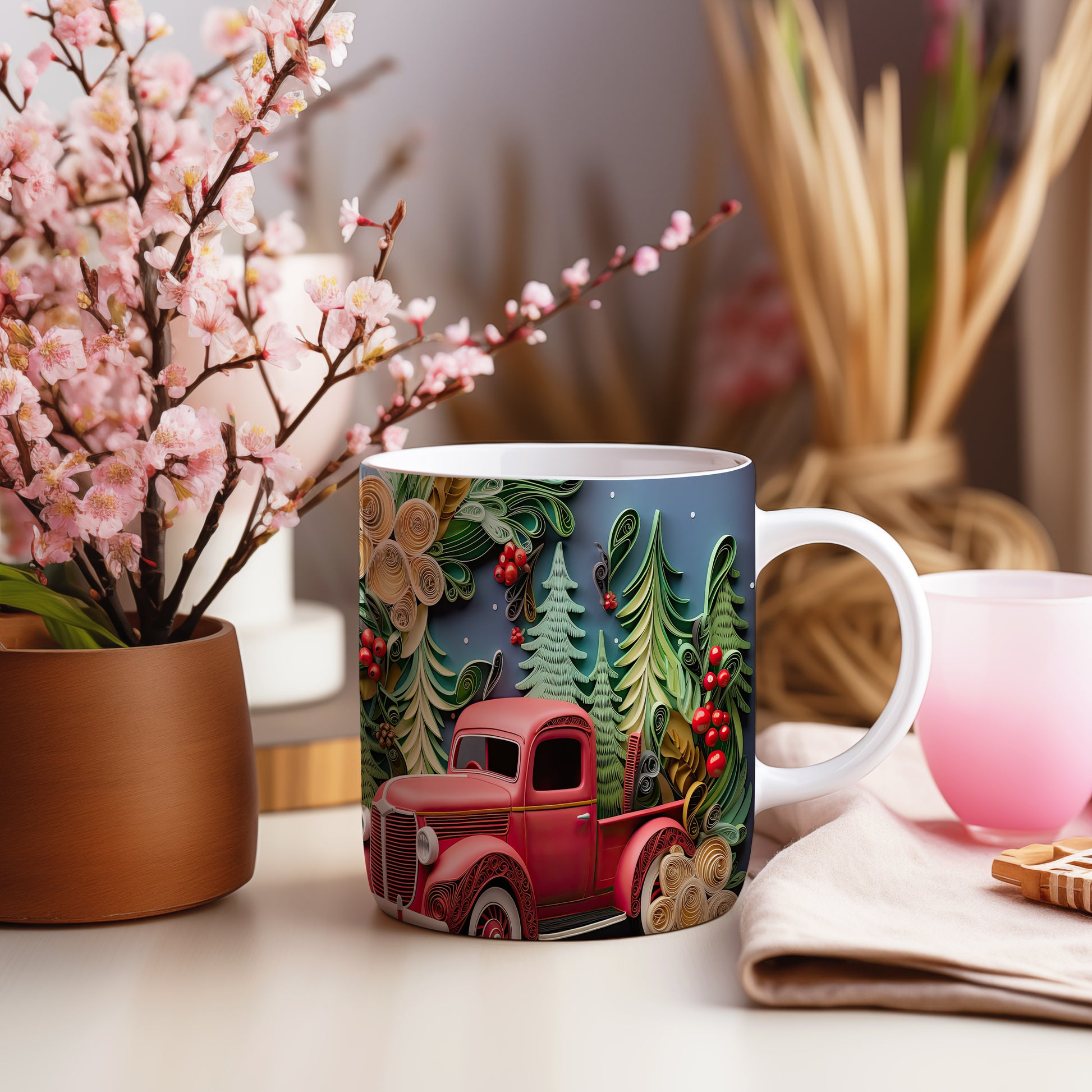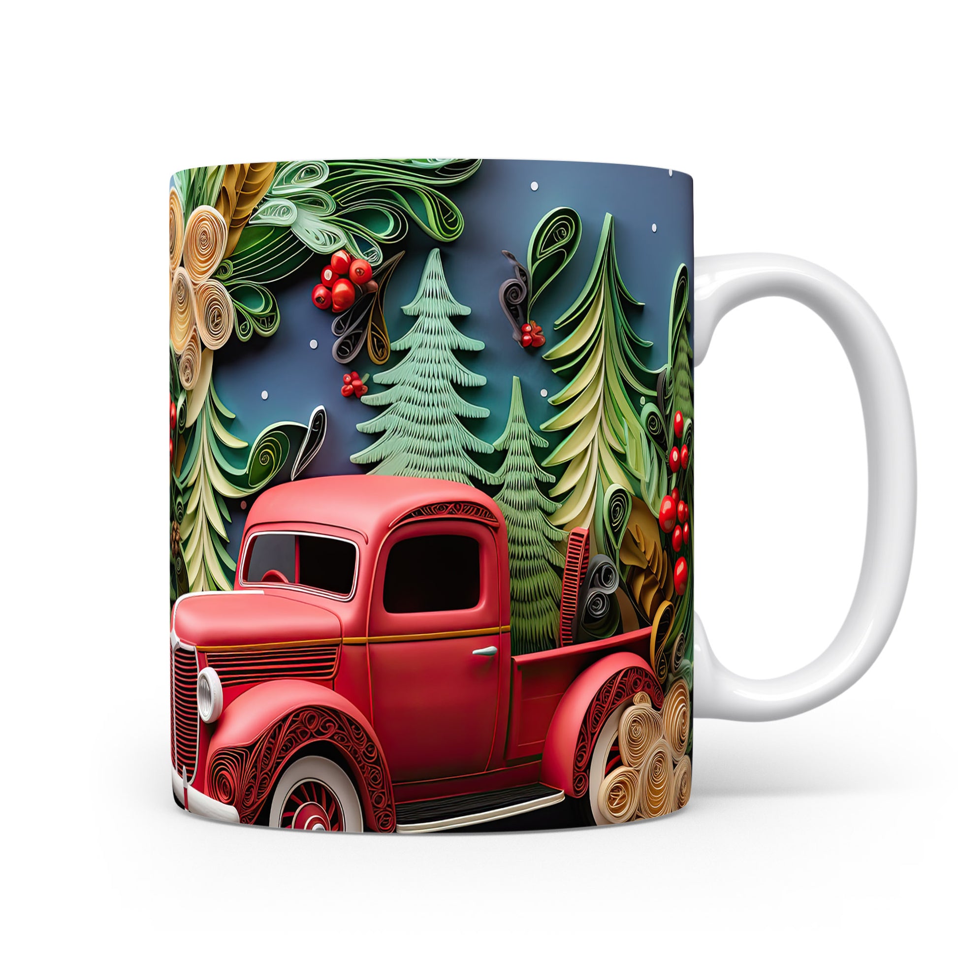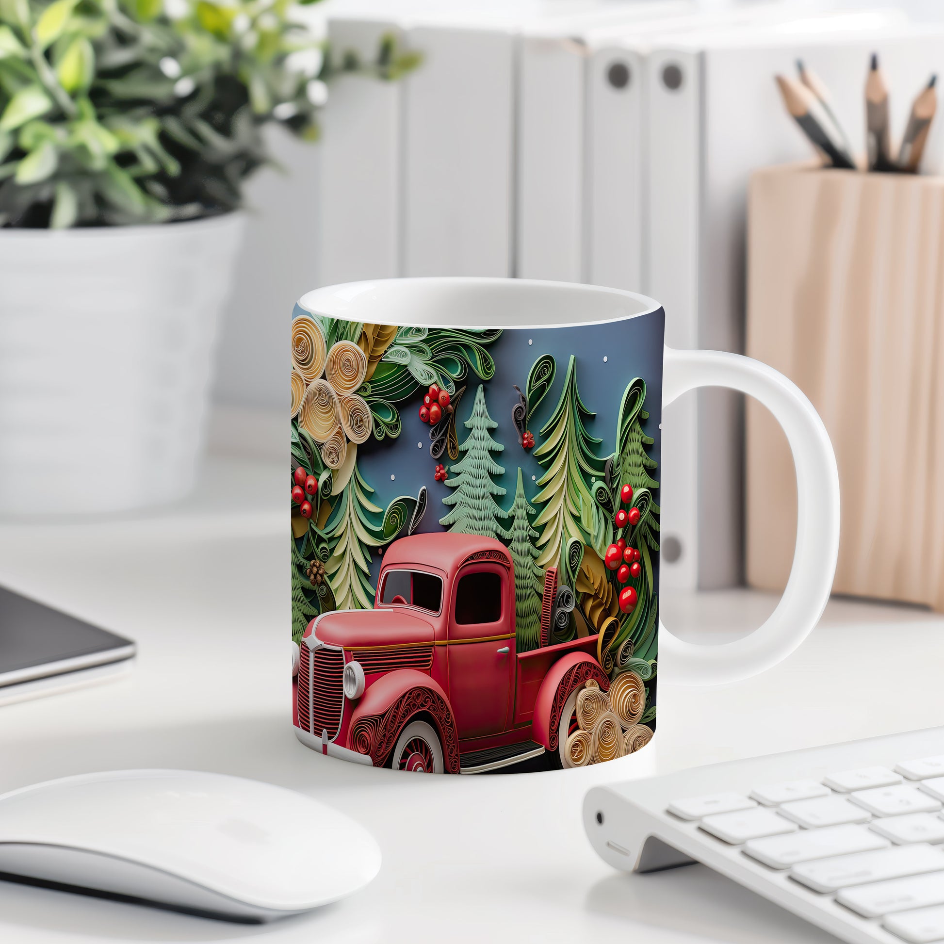 Tento hrnek zobrazuje červený retro truck obklopený zelenými stromy a vánočními detaily. Je ideální pro milovníky přírody a skvělým dárkem pro přátele na Vánoce. Materiál: keramika. Objem: 330 ml. Vhodné do myčky i mikrovlnky. Užijte si každé sousto s tímto stylovým hrnkem.