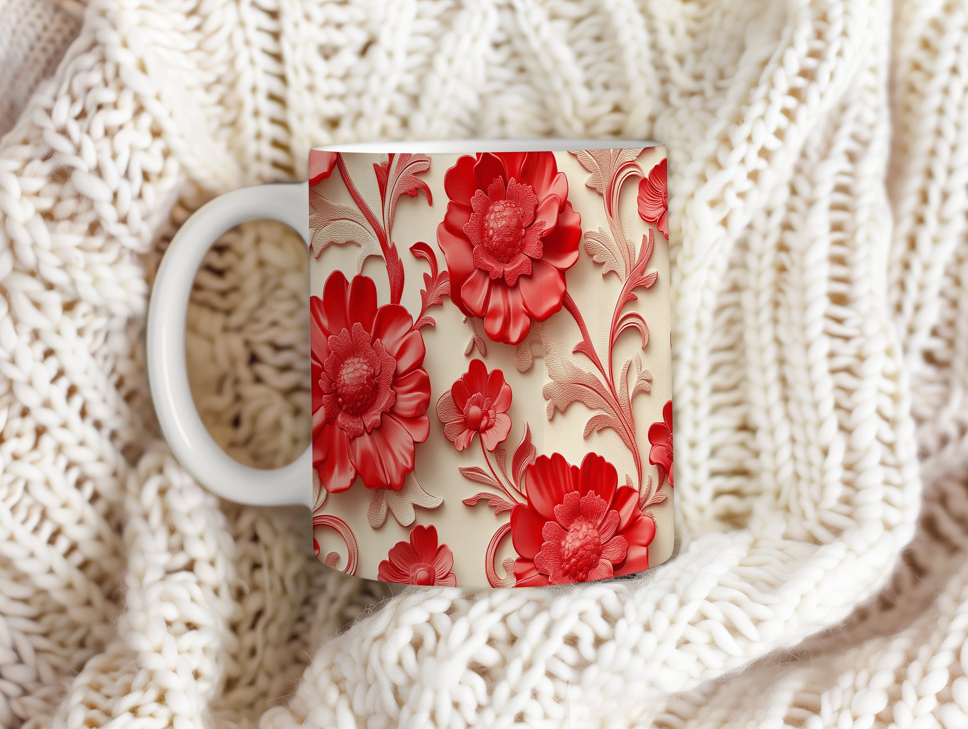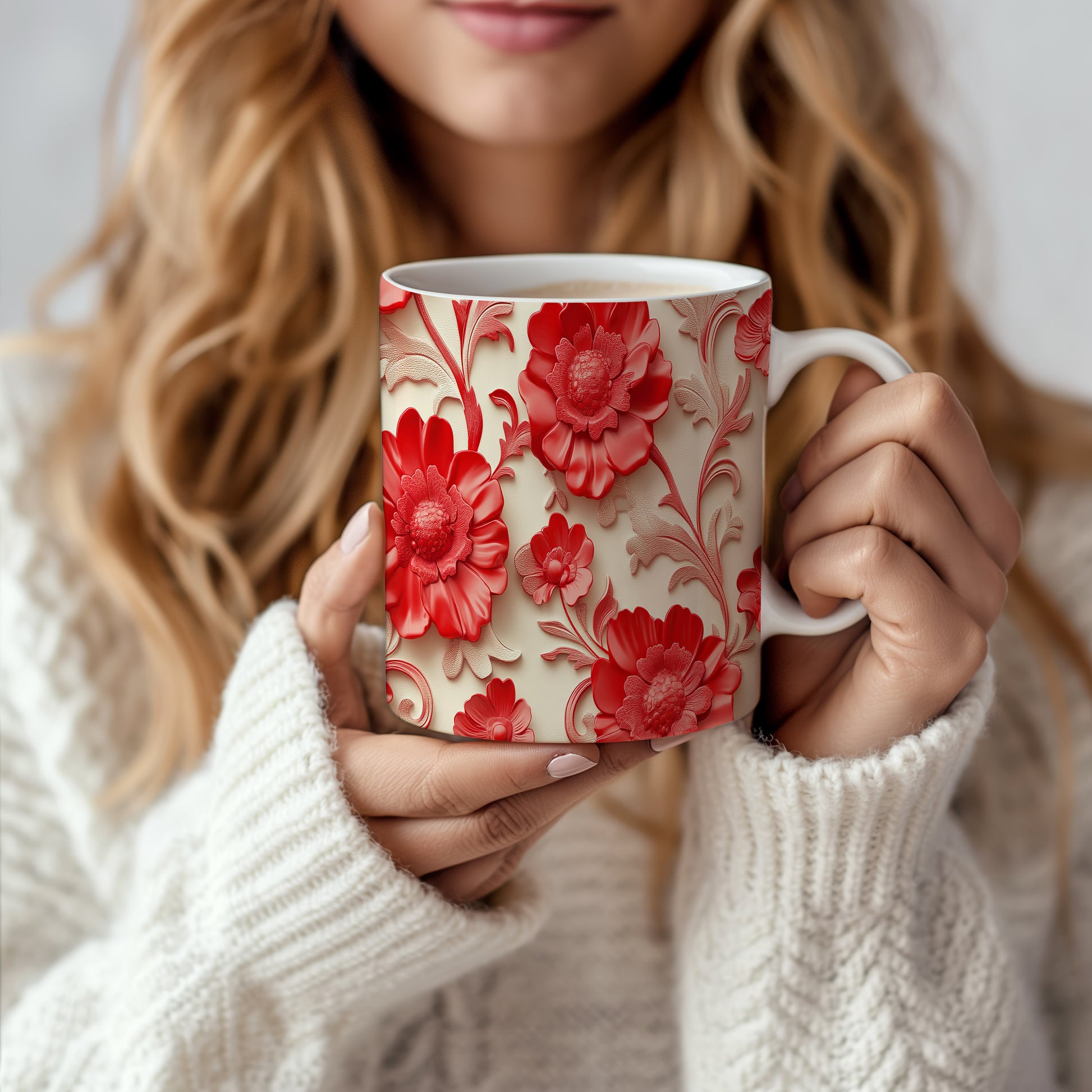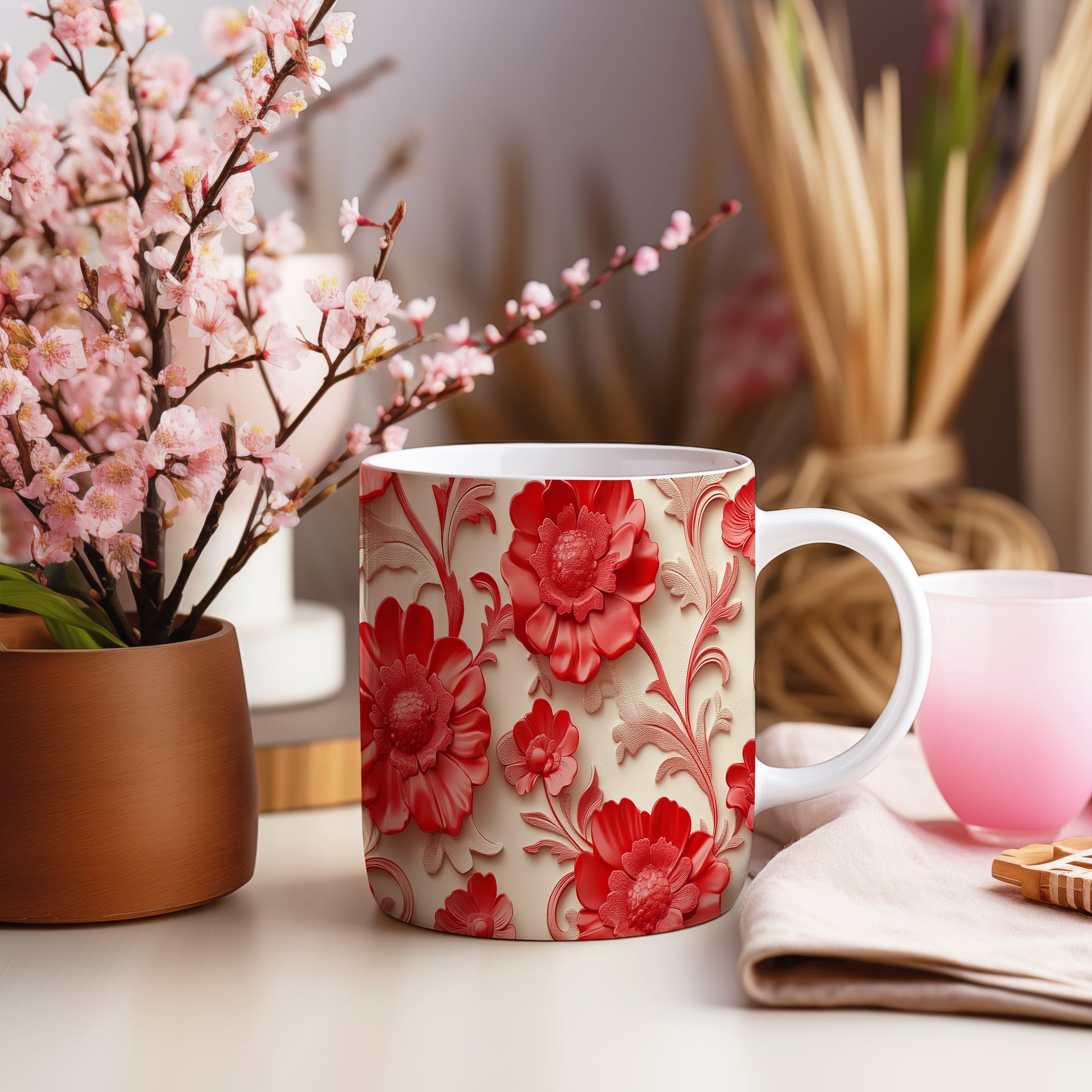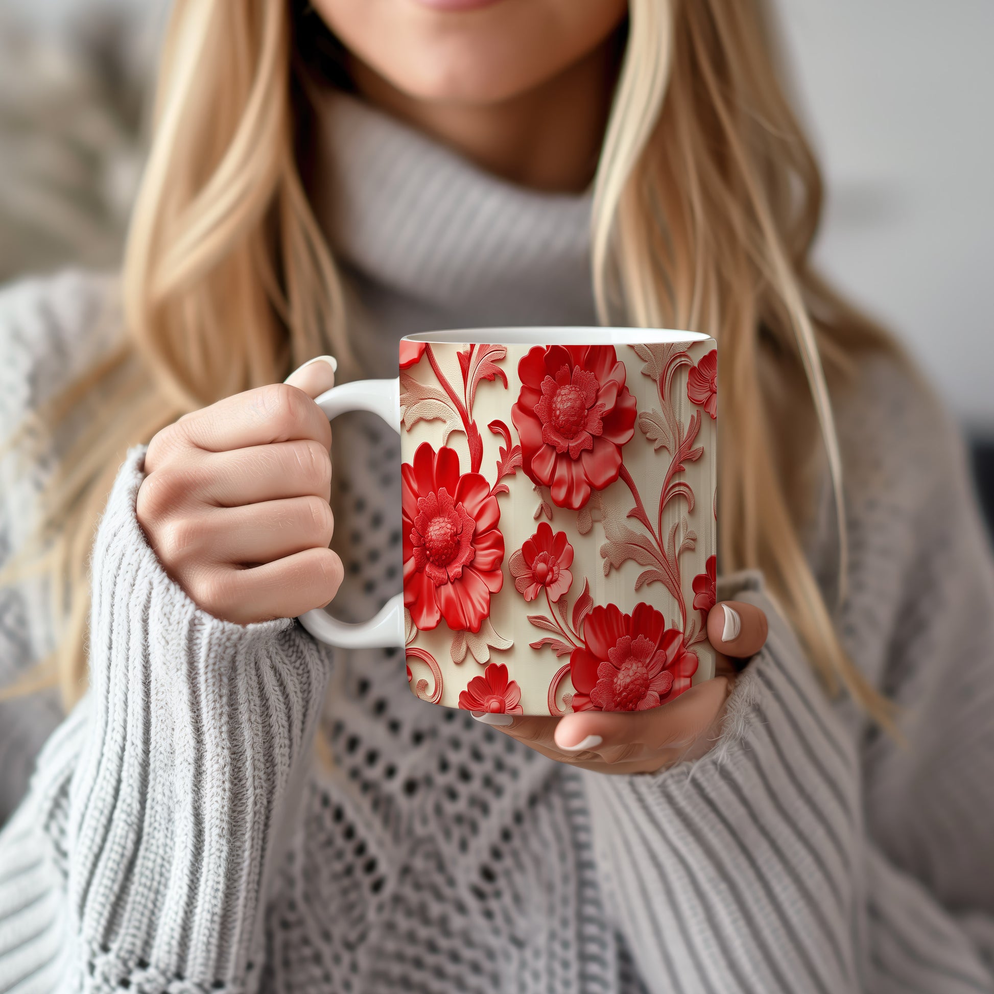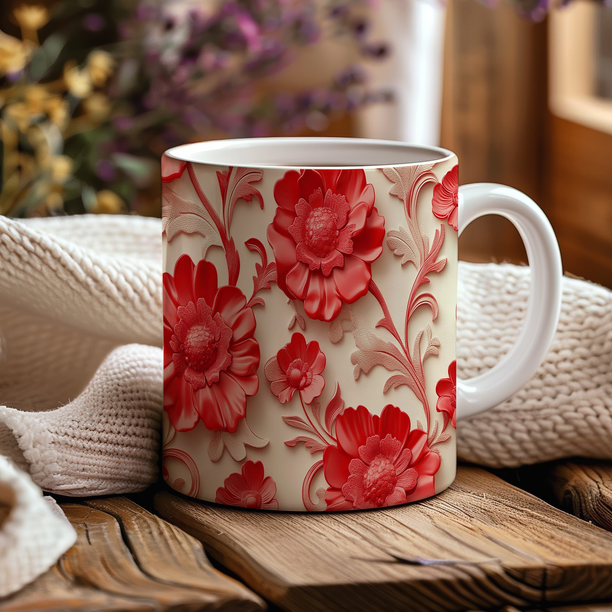 Hrnek se červenými květinami – malířským vzhledem