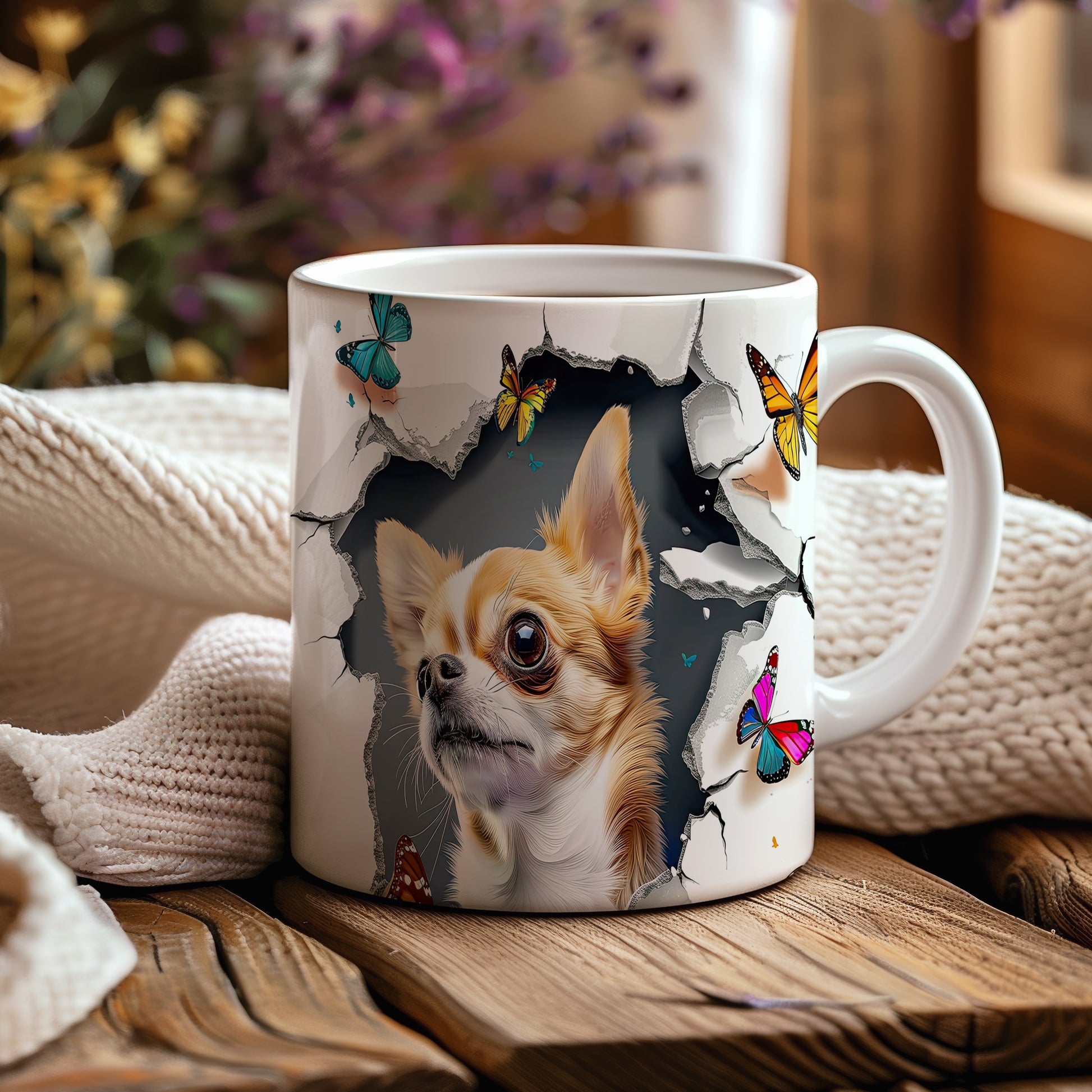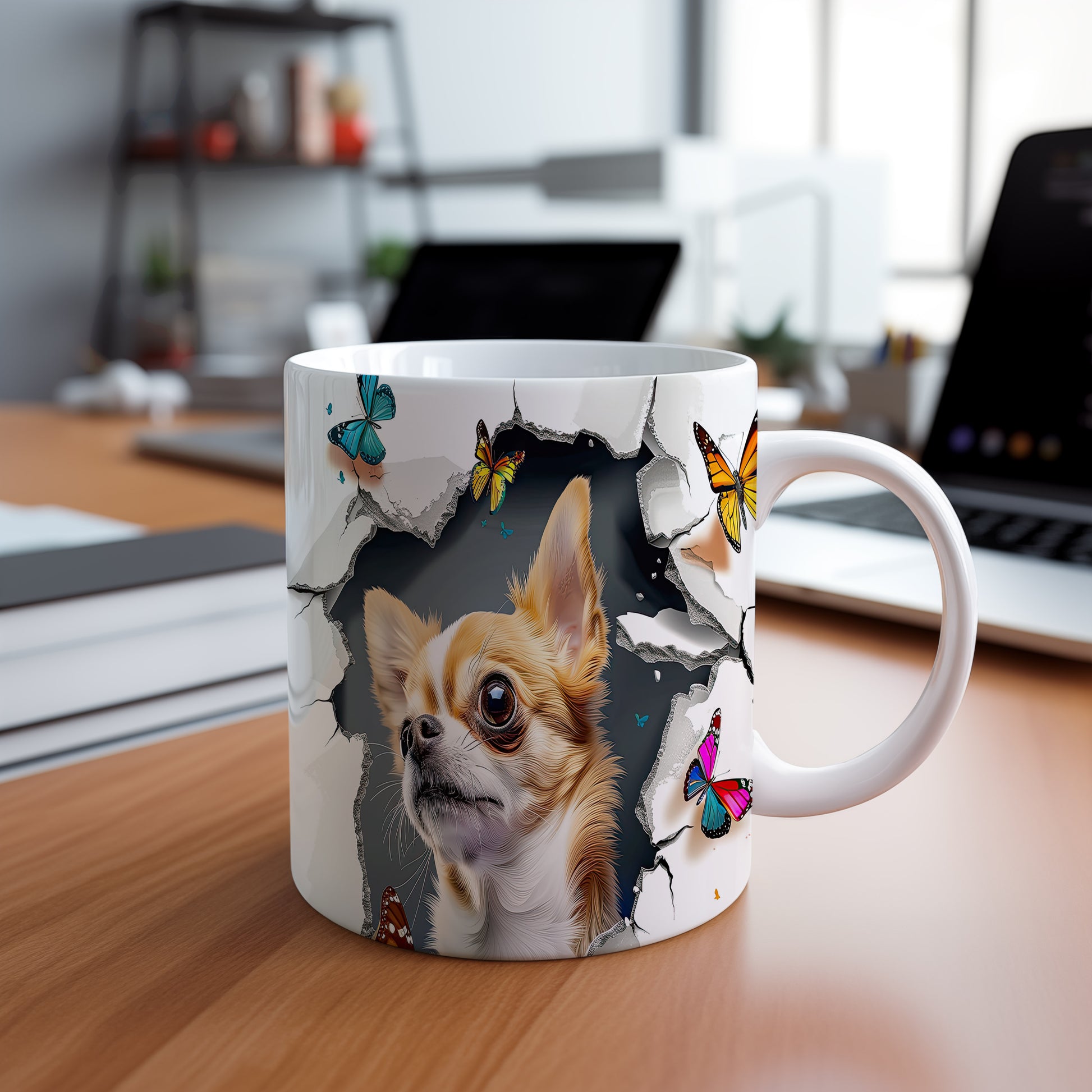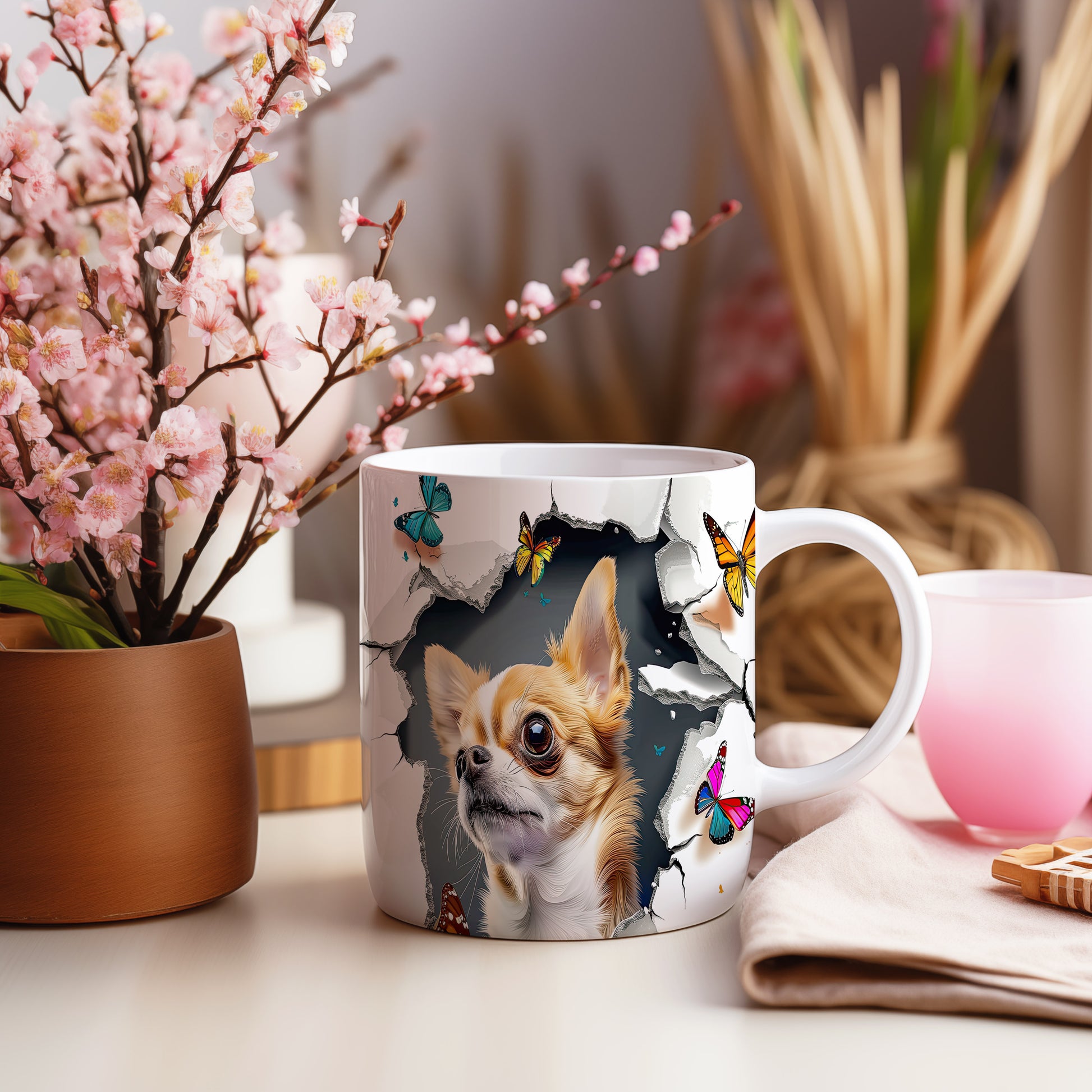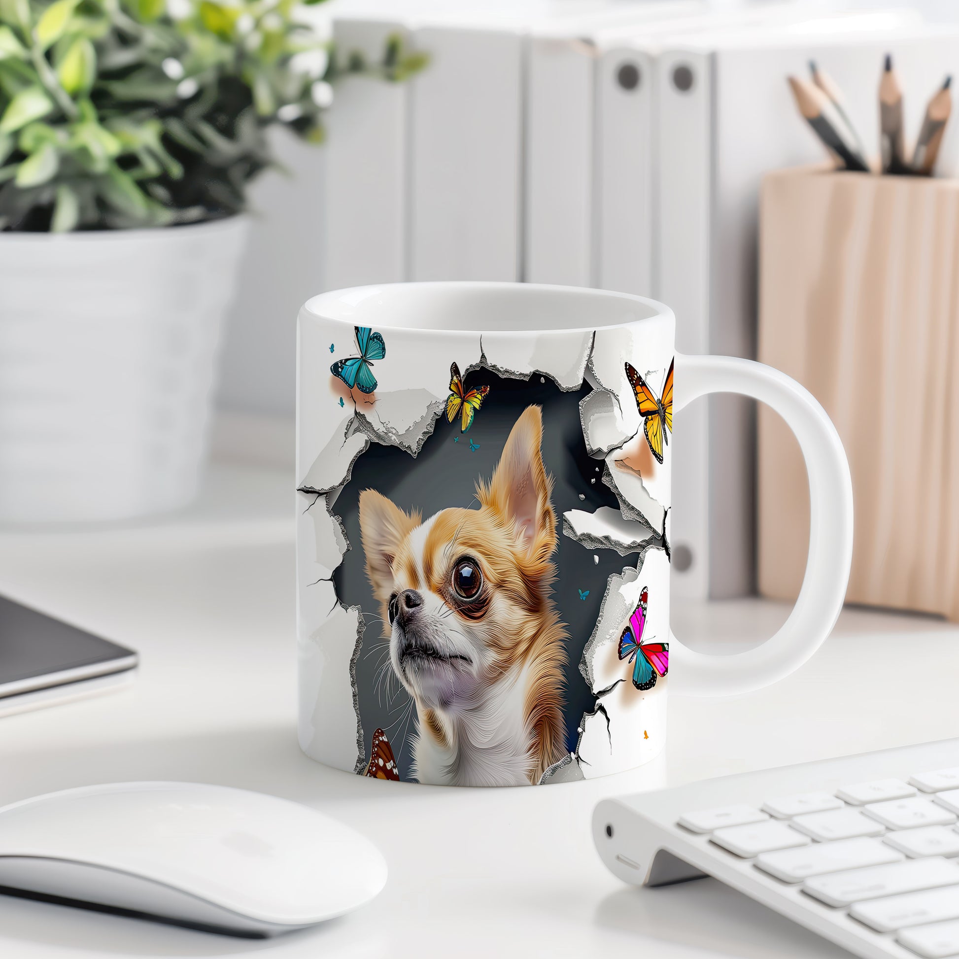 Tento hrnek zobrazuje čivavu obklopenou barevnými motýlky, ideální pro milovníky psů a originálního designu. Skvělý tip na dárek pro přátele nebo rodinu, kteří mají rádi zvířata. Materiál: keramika. Objem: 330 ml. Vhodné do myčky i mikrovlnky. Používáním tohoto hrnku si užijete nejen kávu, ale i radost z jeho jedinečného vzhledu.