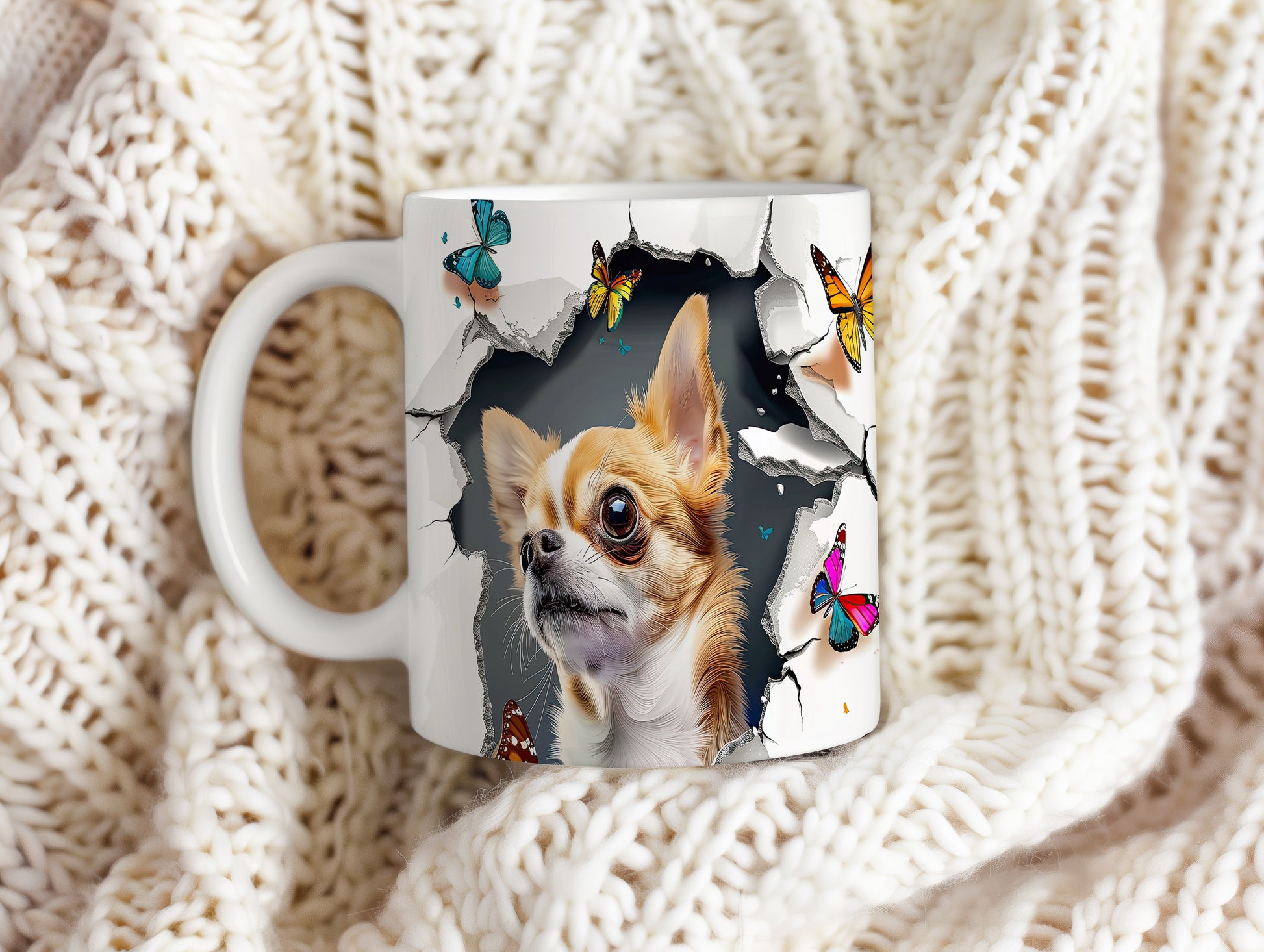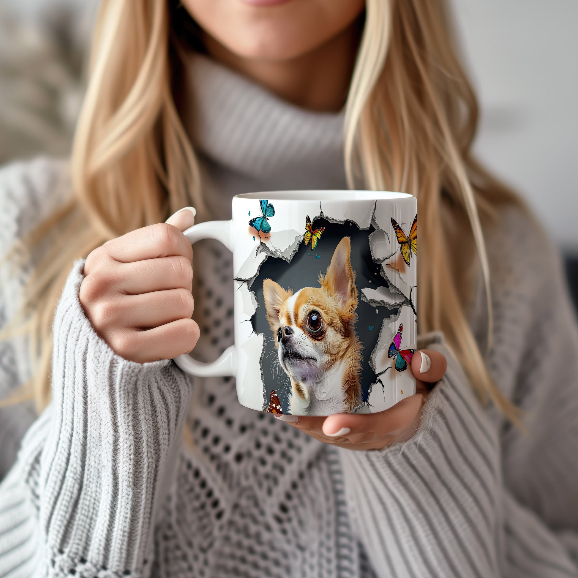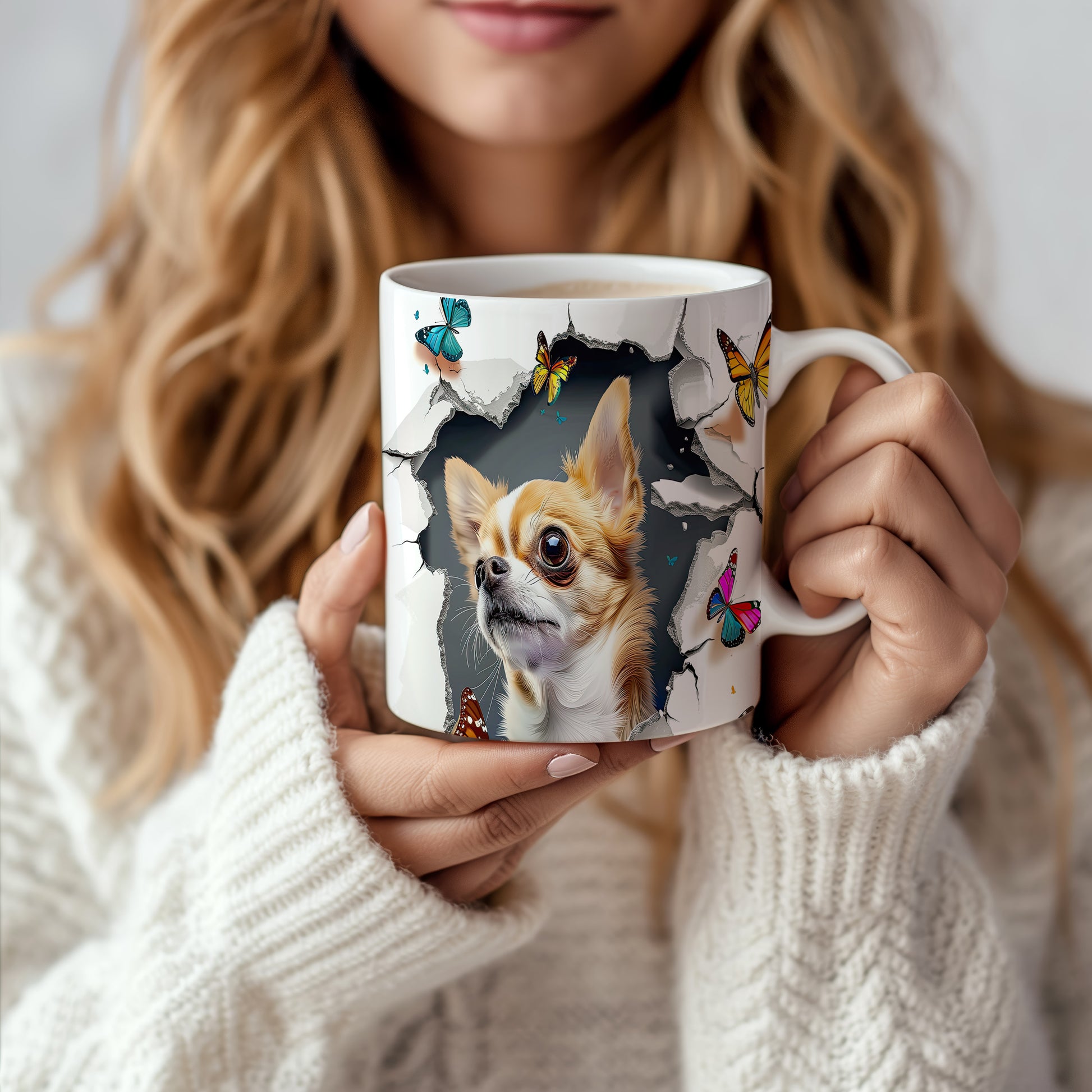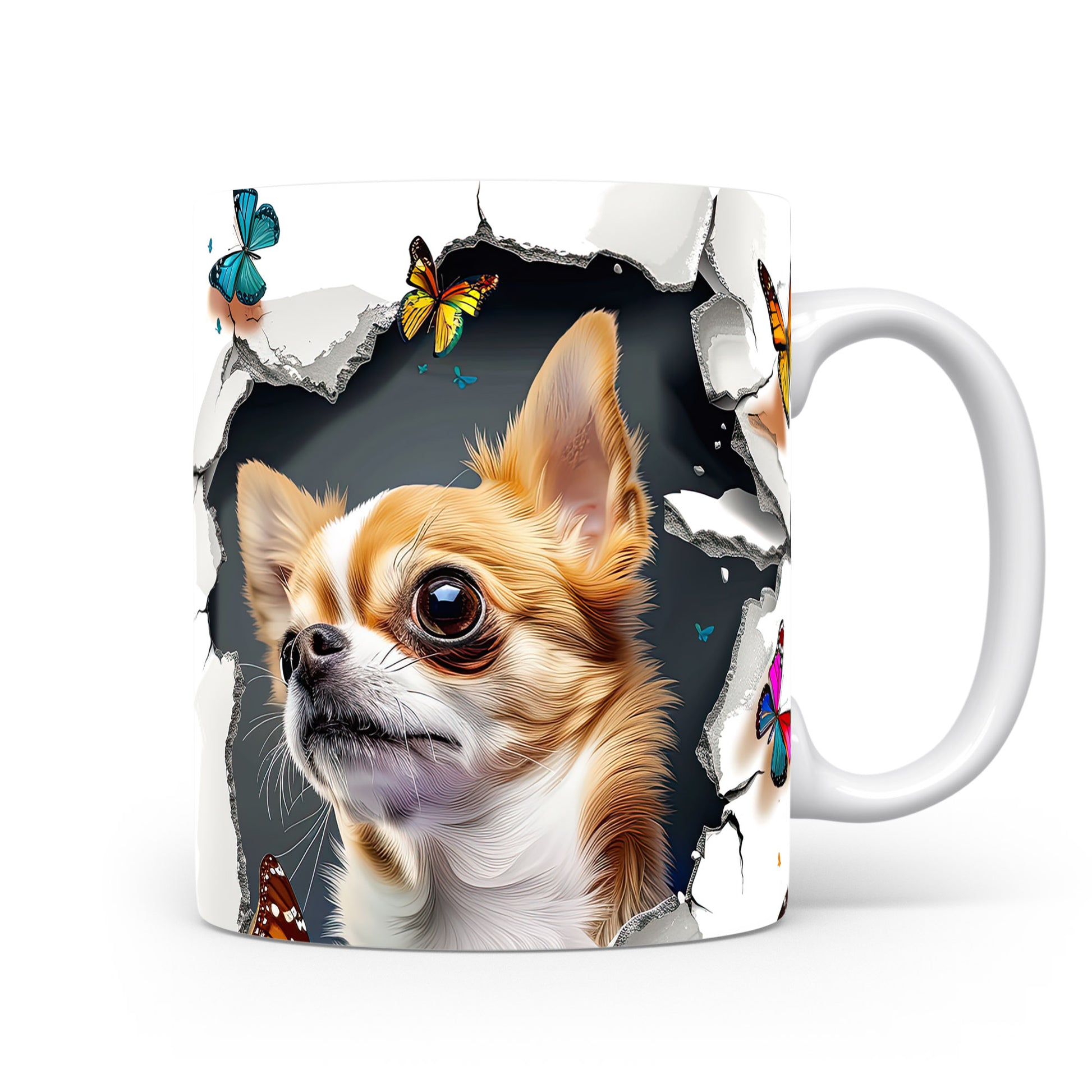 Tento hrnek zobrazuje čivavu obklopenou barevnými motýlky, ideální pro milovníky psů a originálního designu. Skvělý tip na dárek pro přátele nebo rodinu, kteří mají rádi zvířata. Materiál: keramika. Objem: 330 ml. Vhodné do myčky i mikrovlnky. Používáním tohoto hrnku si užijete nejen kávu, ale i radost z jeho jedinečného vzhledu.