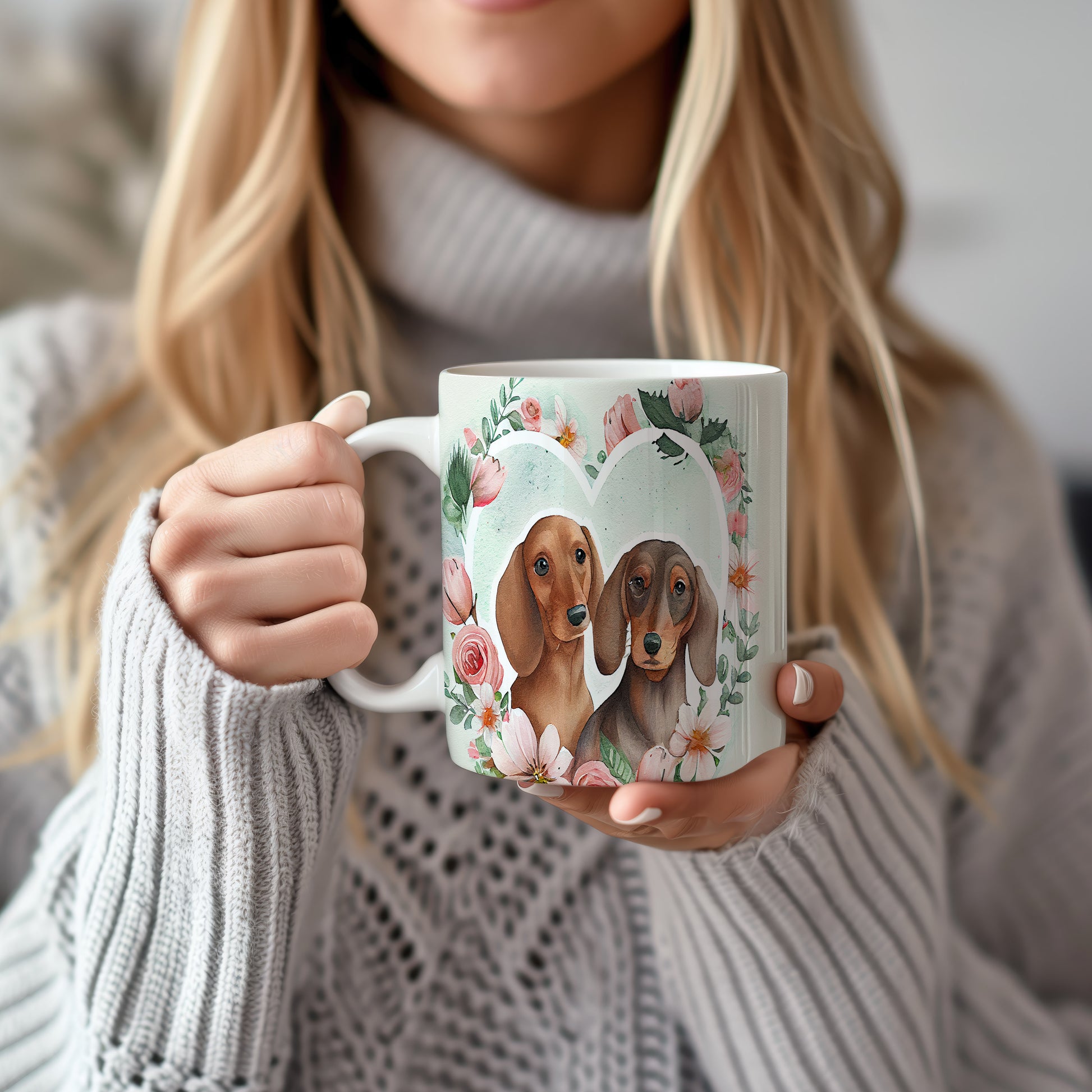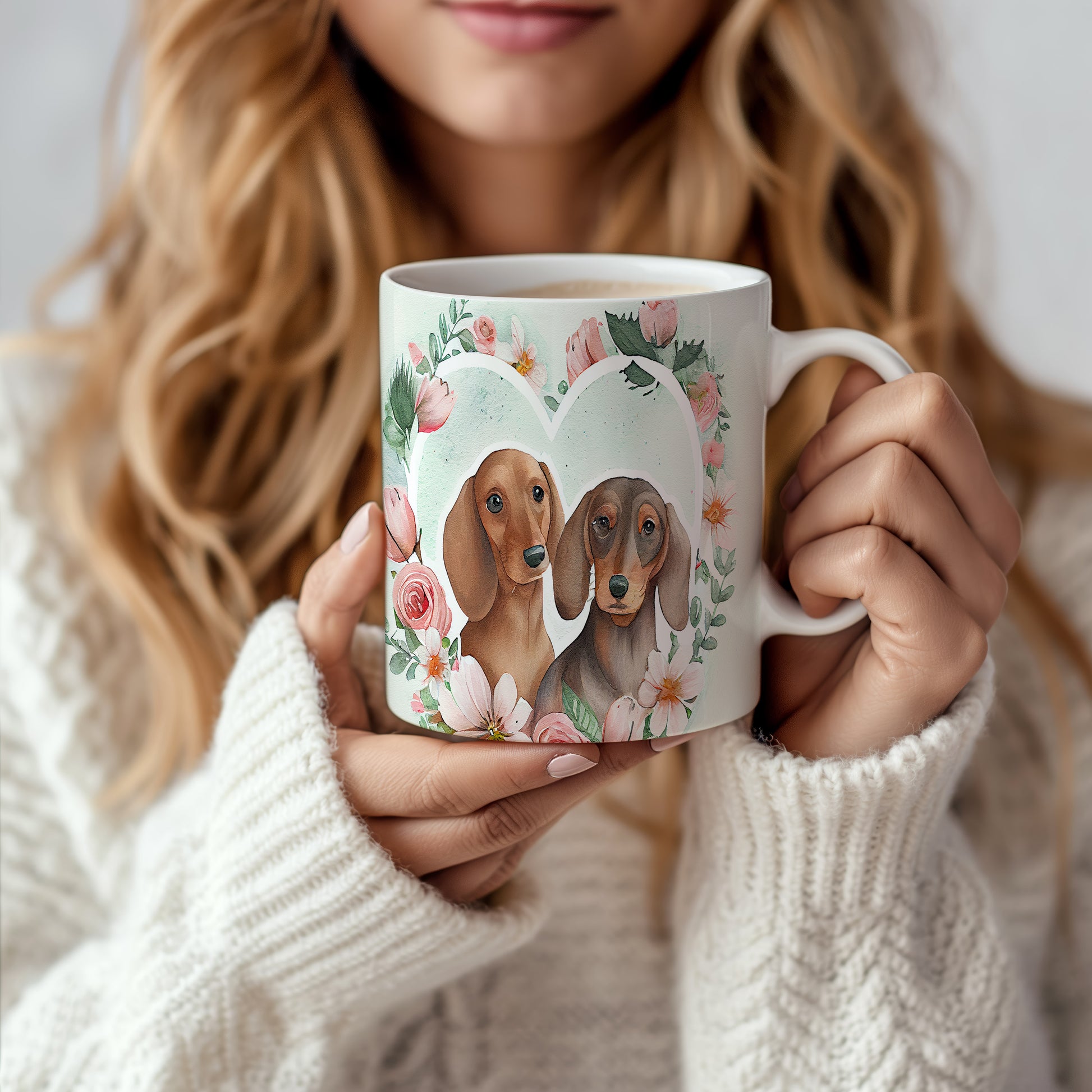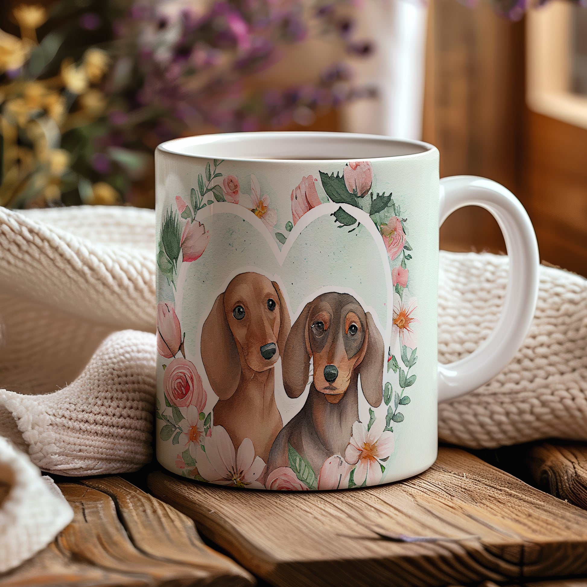Hrnek se dvěma jezevčíky a květinami je skvělým kouskem pro milovníky psů a přírody. Tento hrnek je ideální jako dárek pro přátele nebo rodinu, kteří si rádi vychutnají svůj oblíbený nápoj. Materiál: keramika. Objem: 330 ml. Vhodné do myčky i mikrovlnky. Díky svému designu přináší radost a útulnost do každého dne.