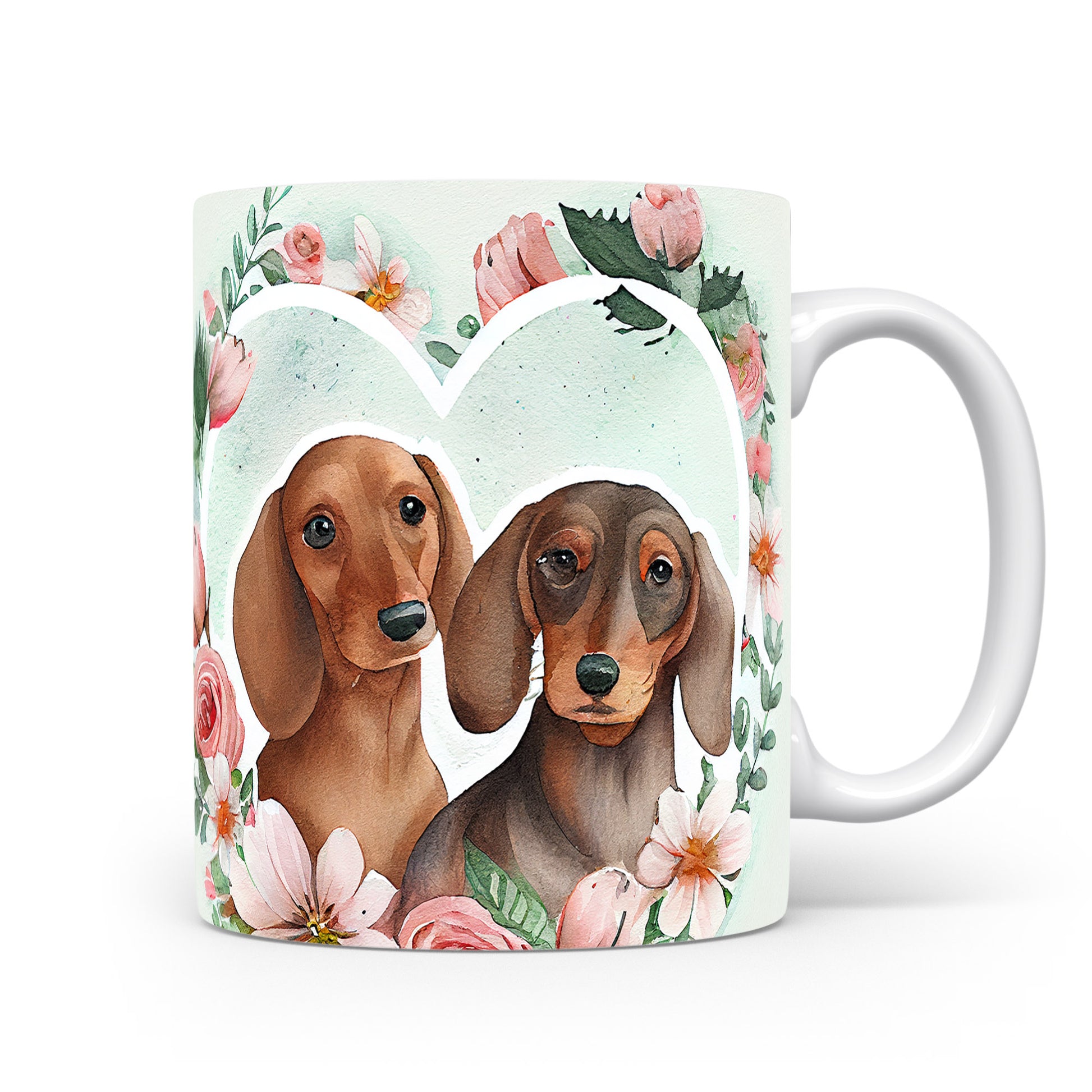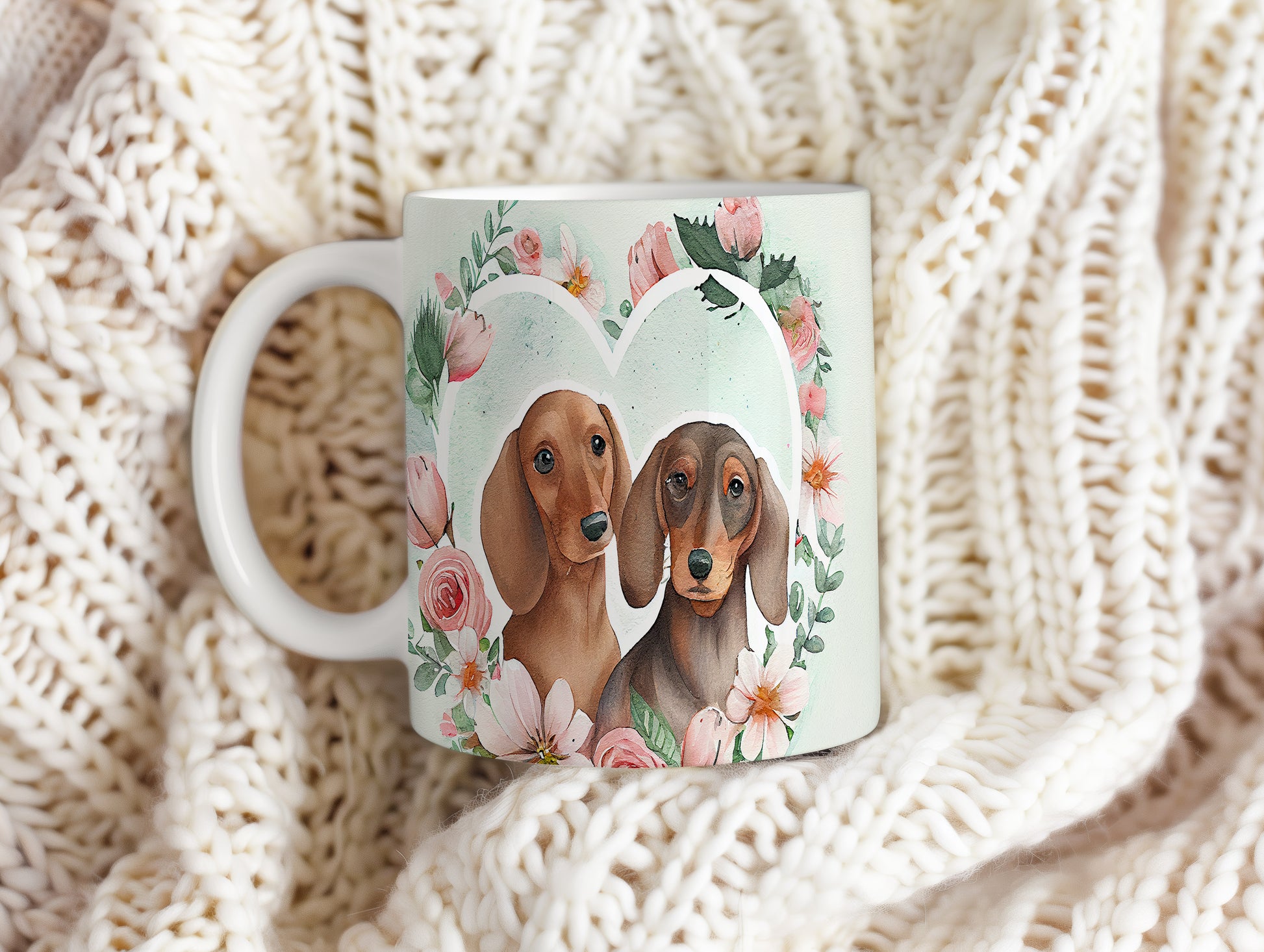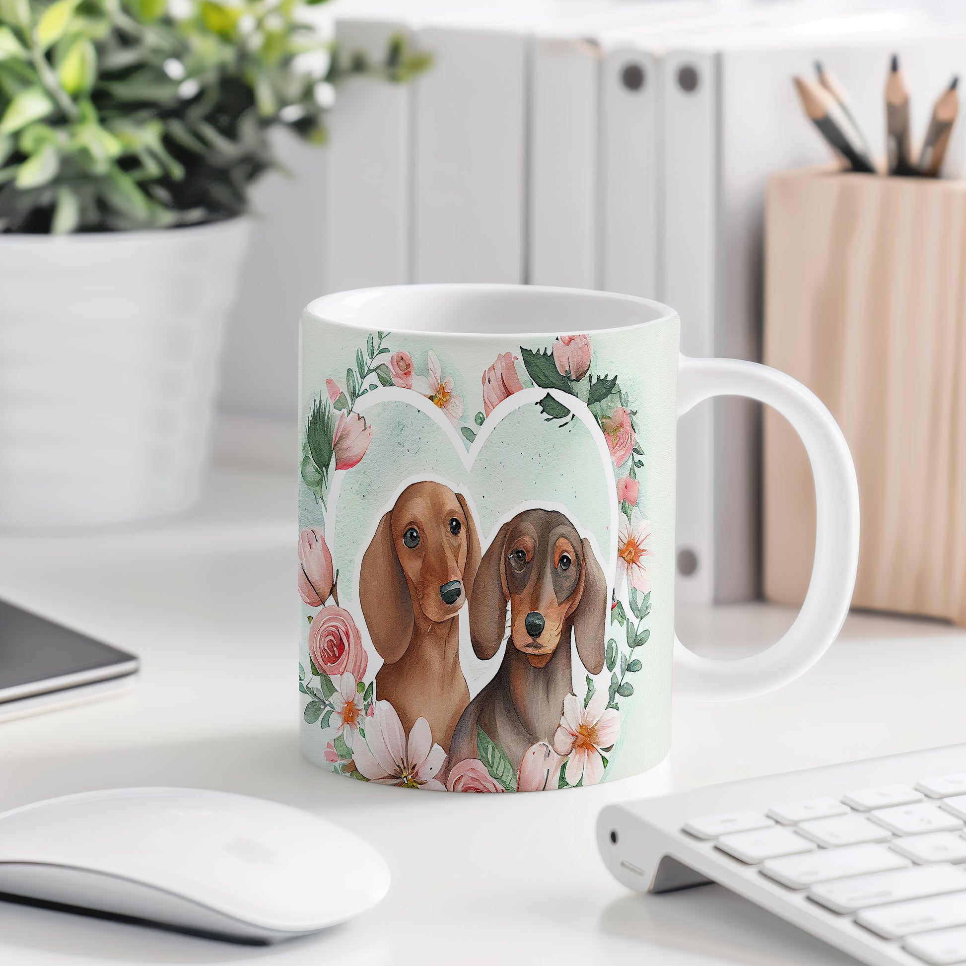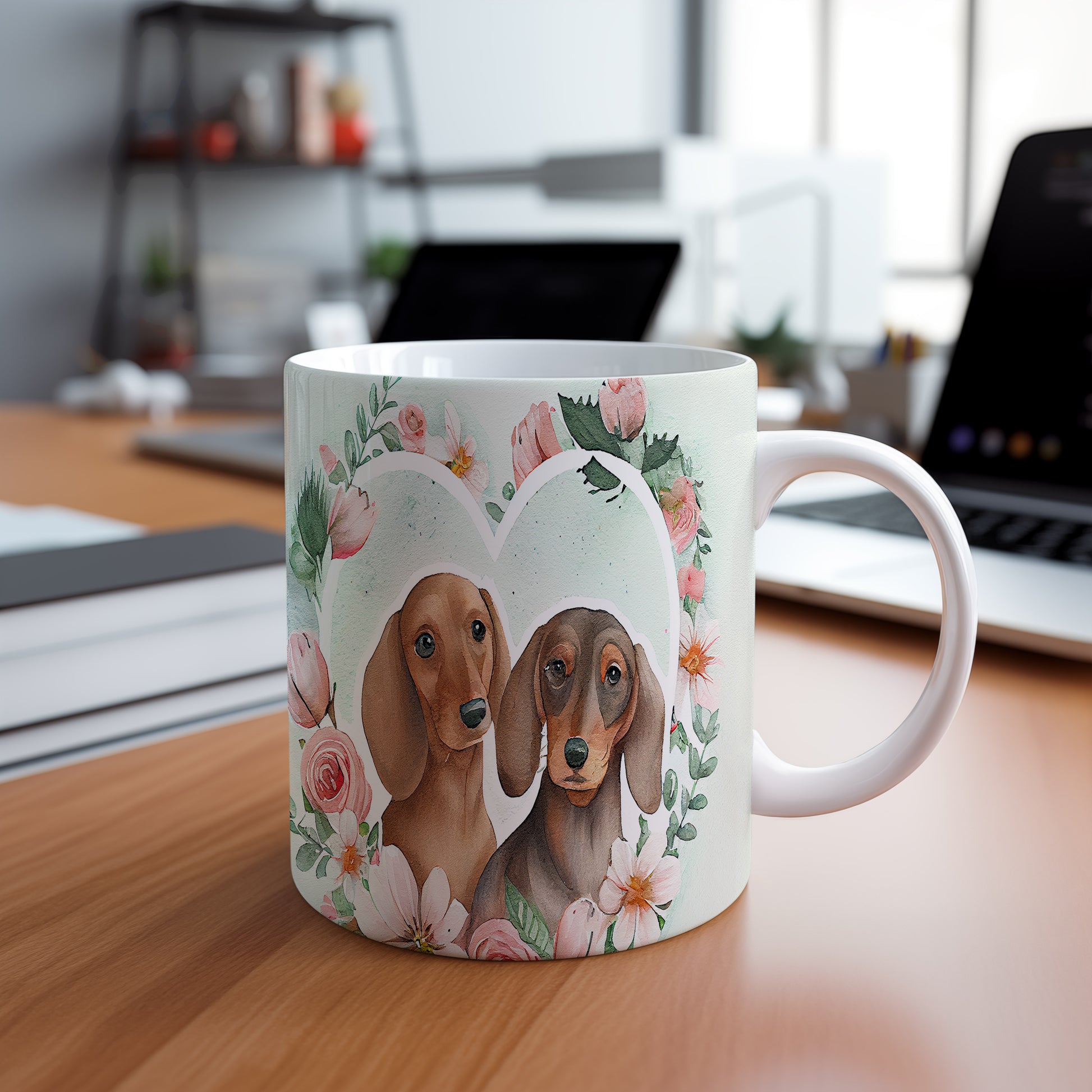 Hrnek se dvěma jezevčíky a květinami je skvělým kouskem pro milovníky psů a přírody. Tento hrnek je ideální jako dárek pro přátele nebo rodinu, kteří si rádi vychutnají svůj oblíbený nápoj. Materiál: keramika. Objem: 330 ml. Vhodné do myčky i mikrovlnky. Díky svému designu přináší radost a útulnost do každého dne.