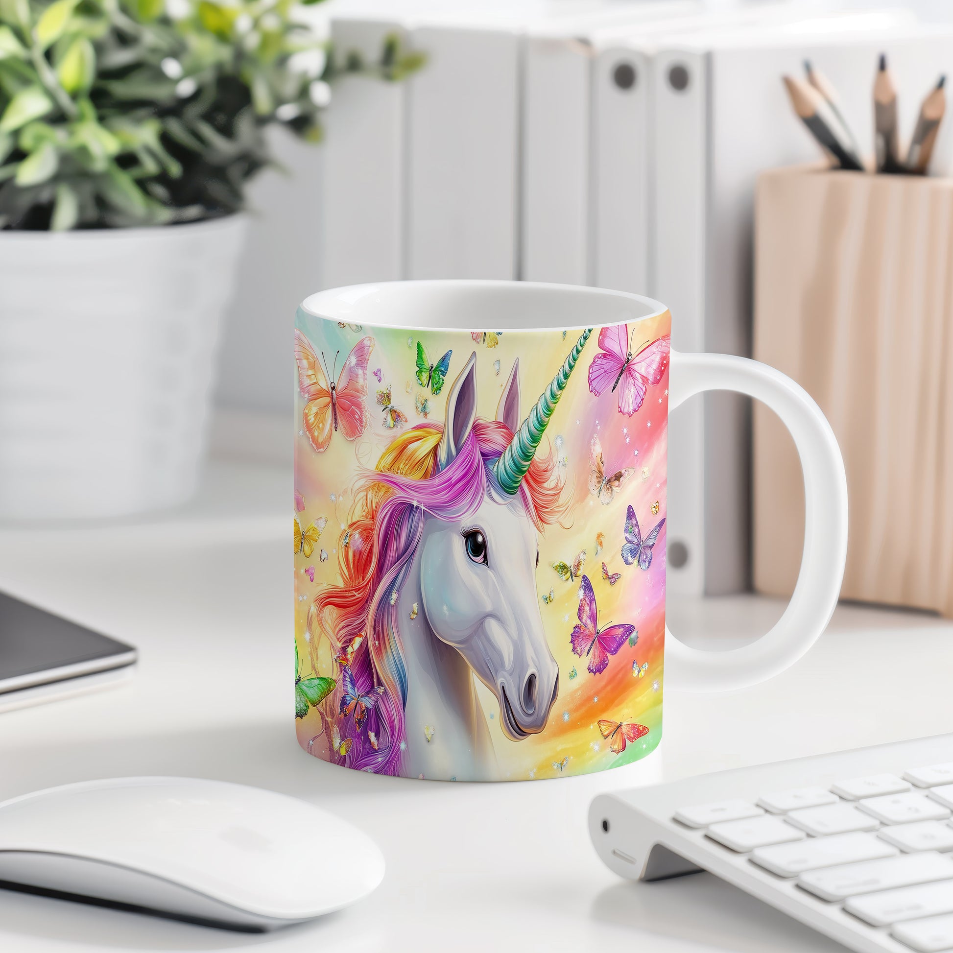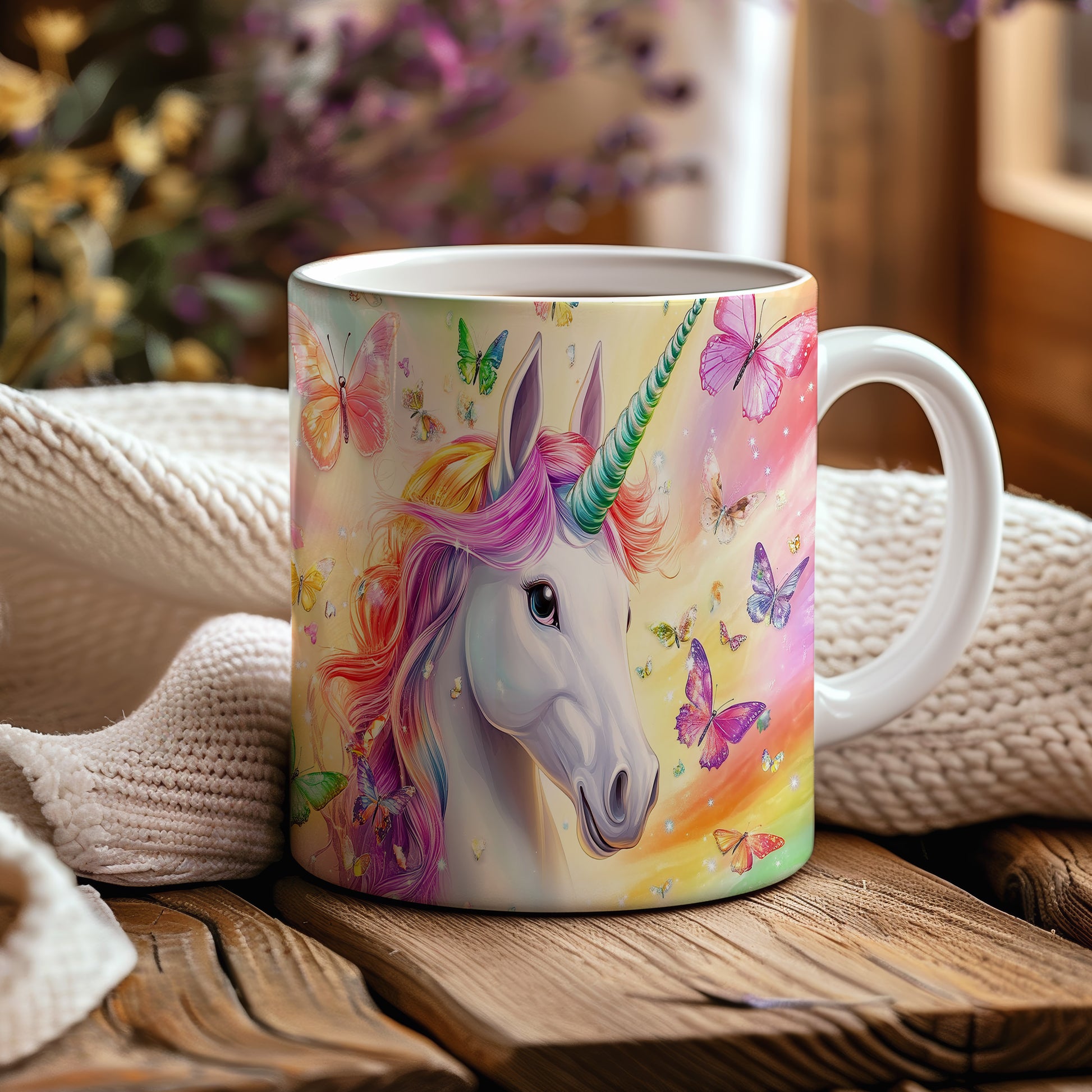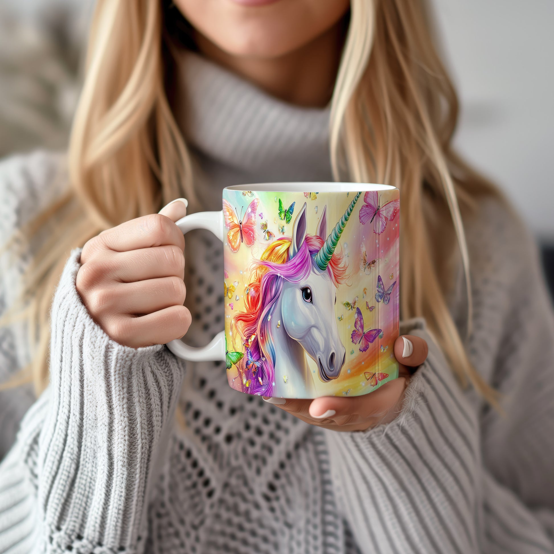 Tento kouzelný hrnek s jednorožcem a barevnými motýli potěší všechny milovníky fantazie a pohádkových příběhů. Je ideálním dárkem pro děti i dospělé, kteří si chtějí zpříjemnit každodenní pití. Materiál: keramika. Objem: 330 ml. Vhodné do myčky i mikrovlnky. Díky svému designu přináší radost a pozitivní energii do každého dne.