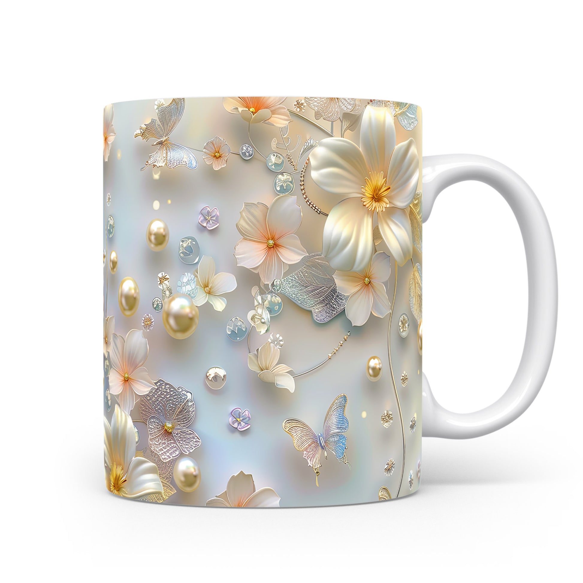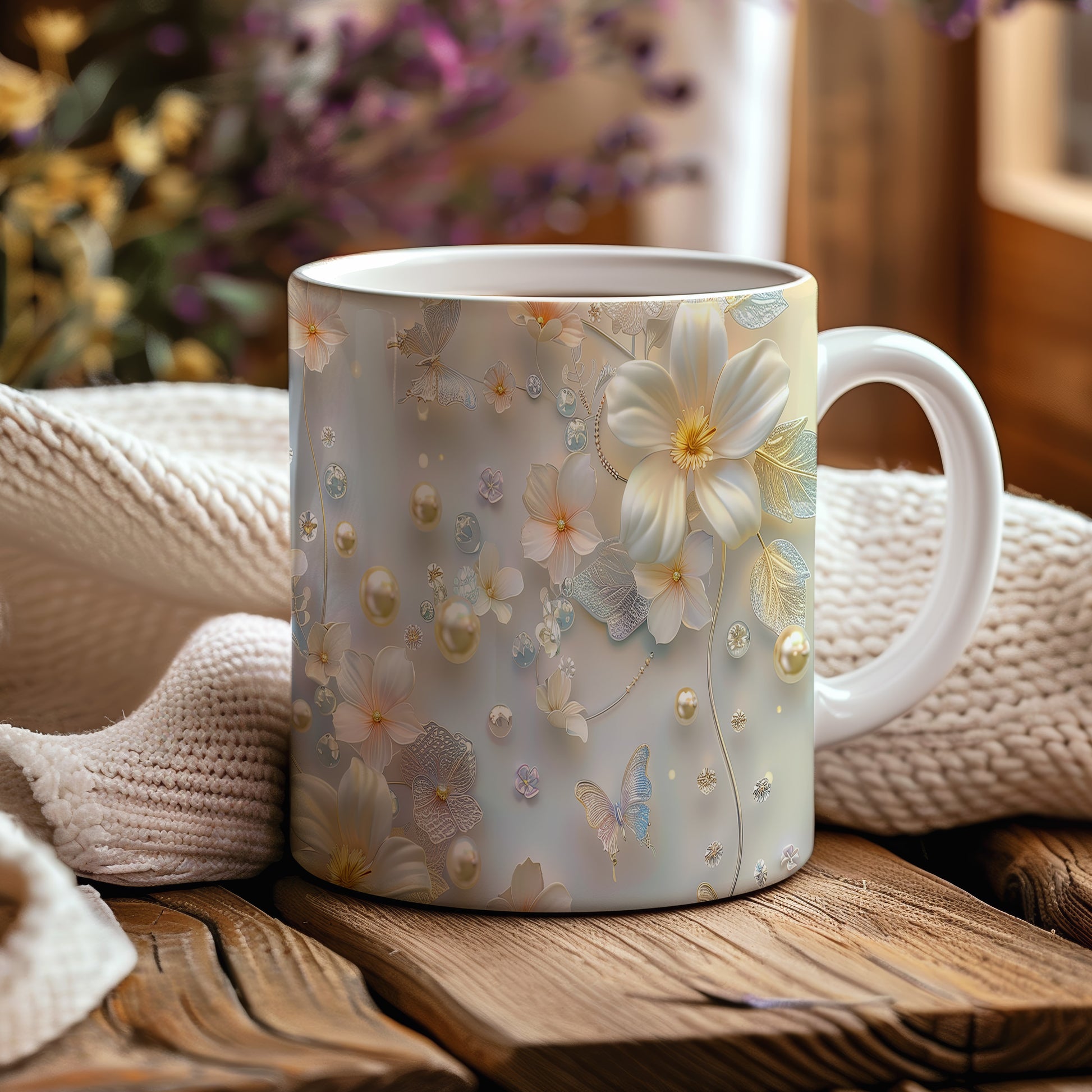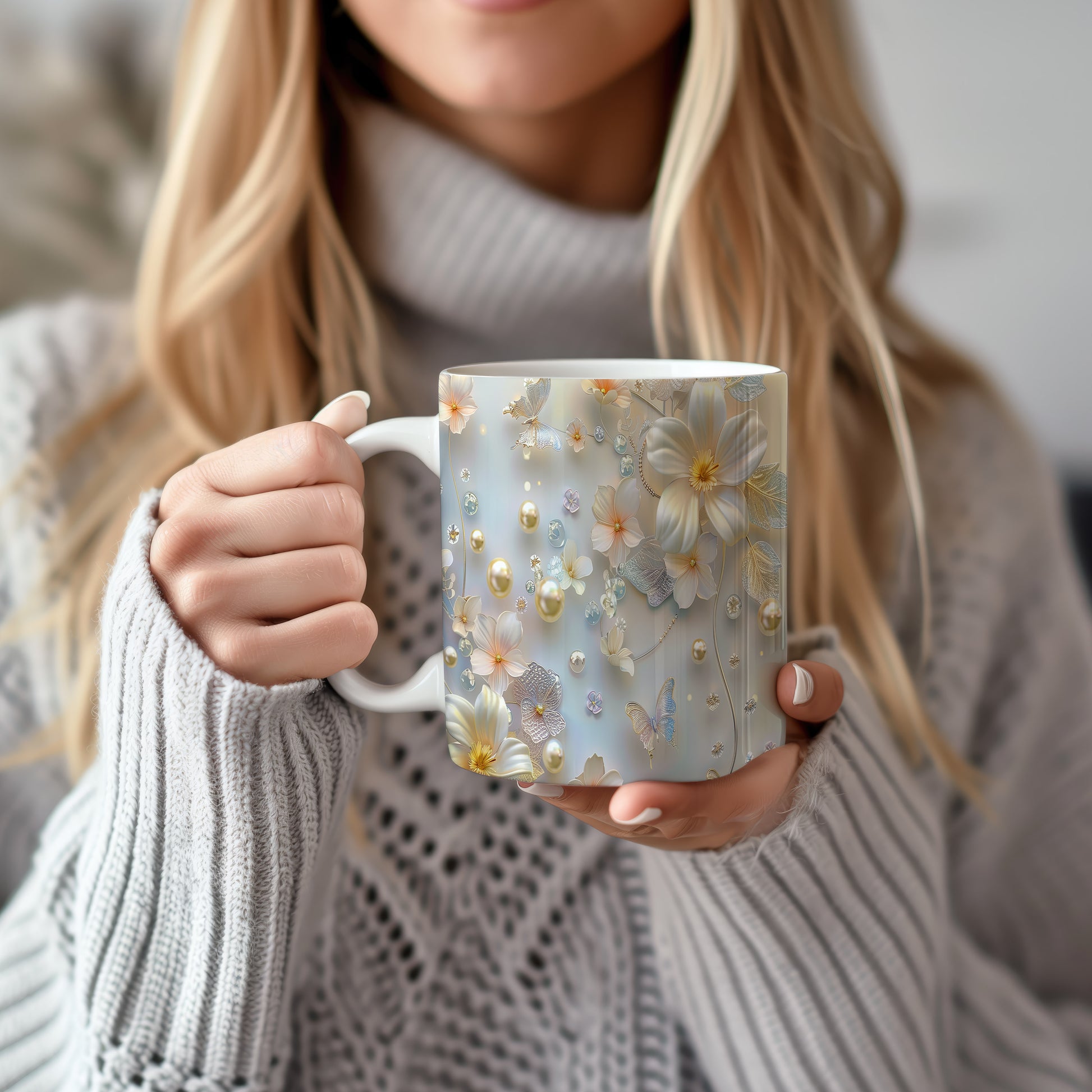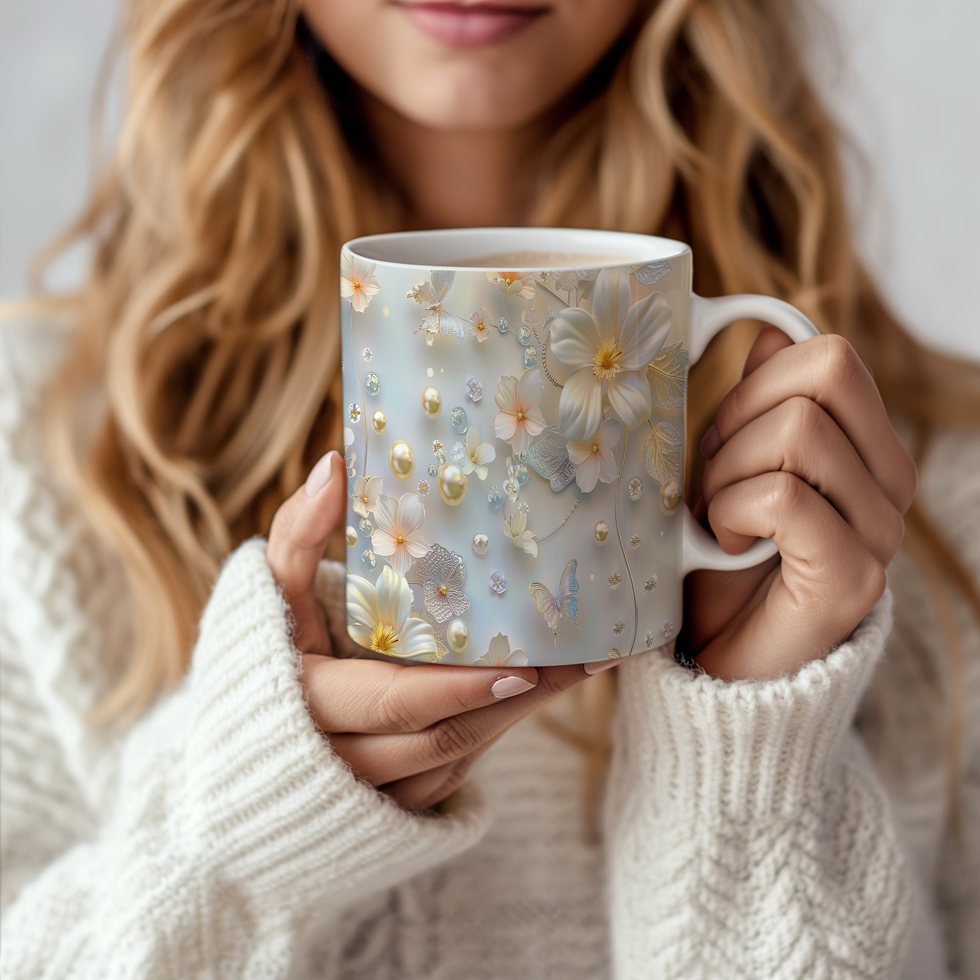 Hrnek se jemným květinovým motivem a perleťovými detaily