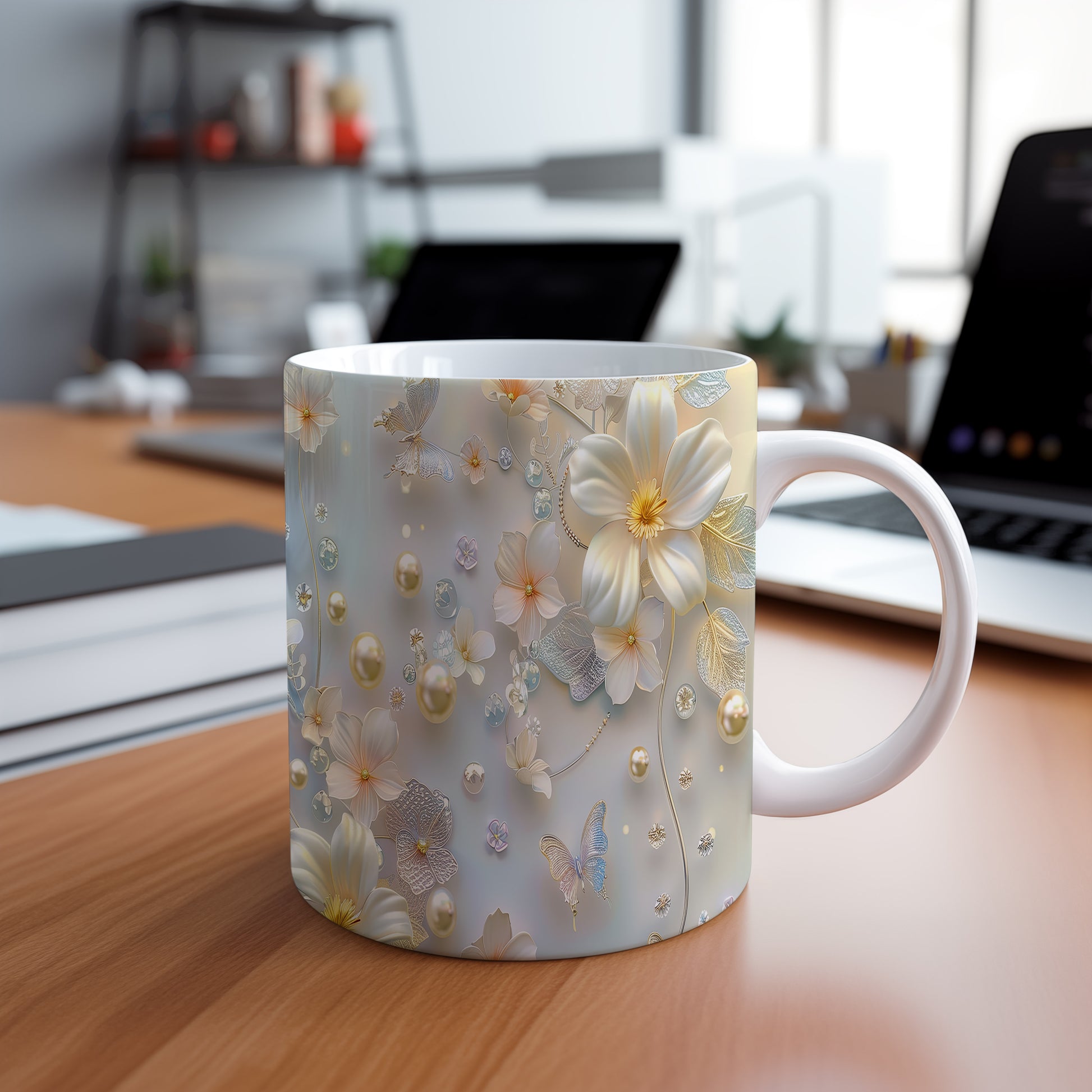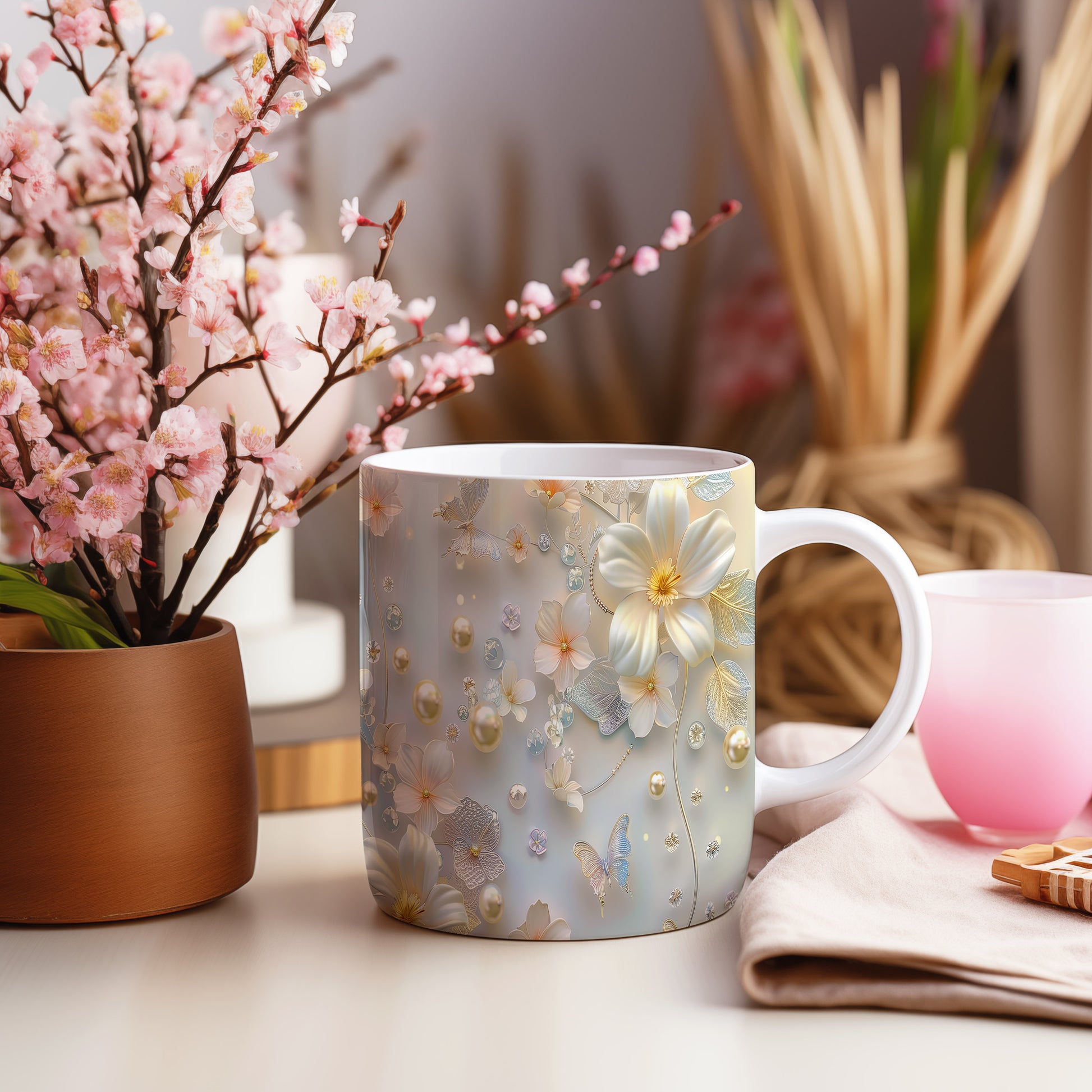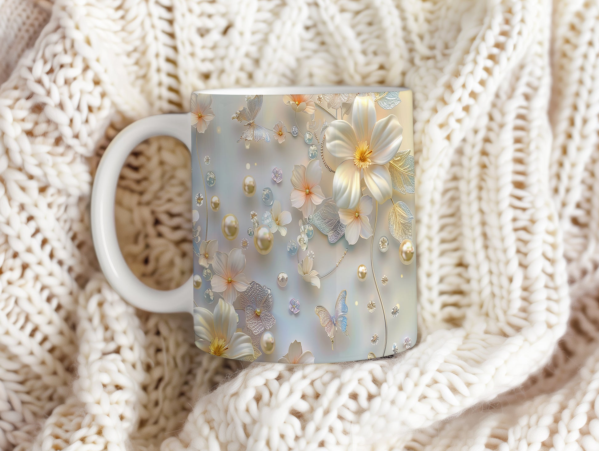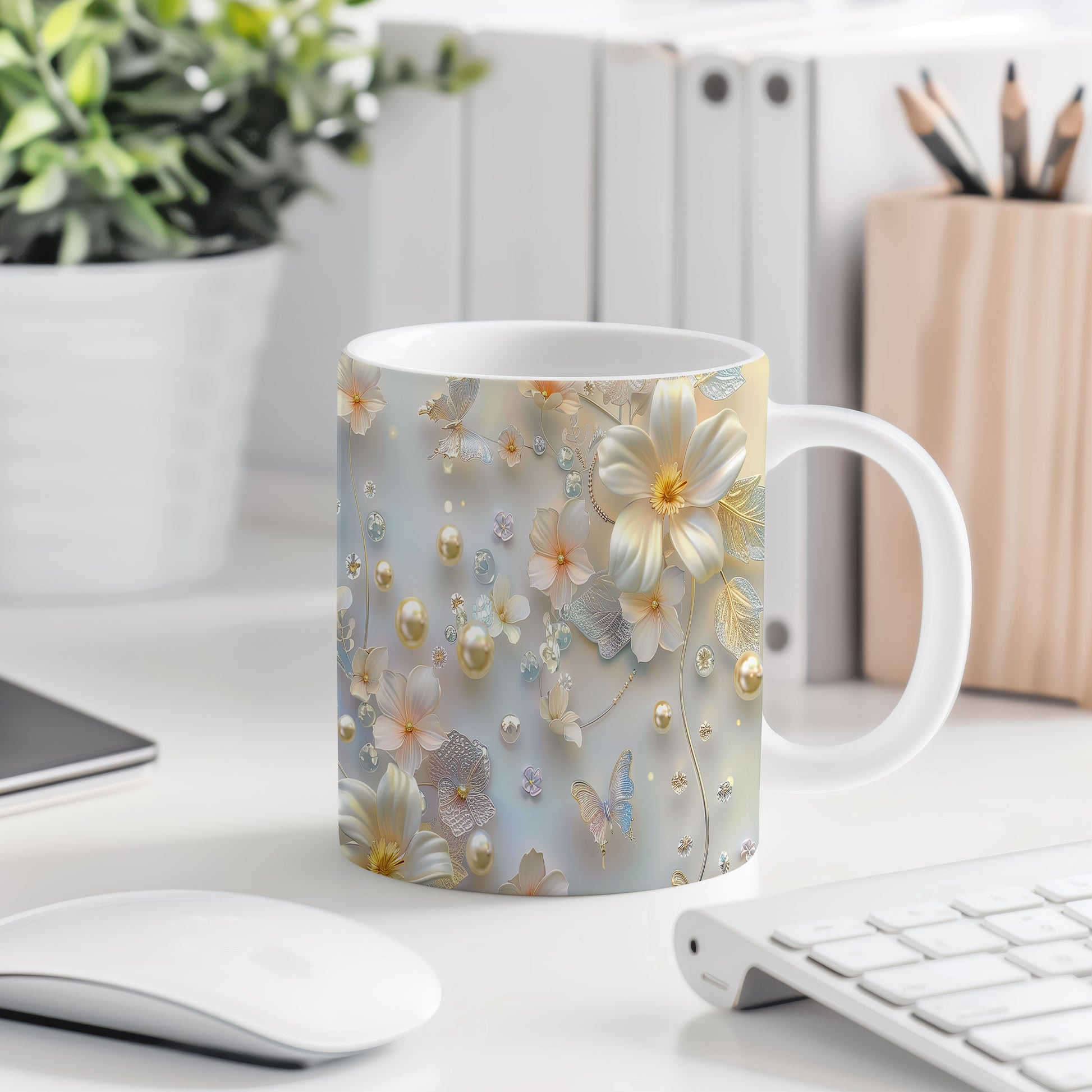 Hrnek se jemným květinovým motivem a perleťovými detaily