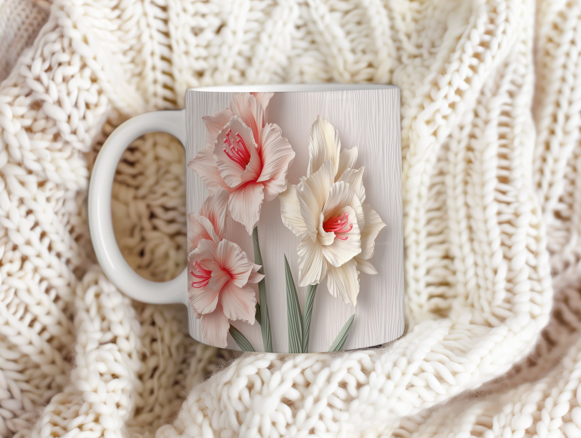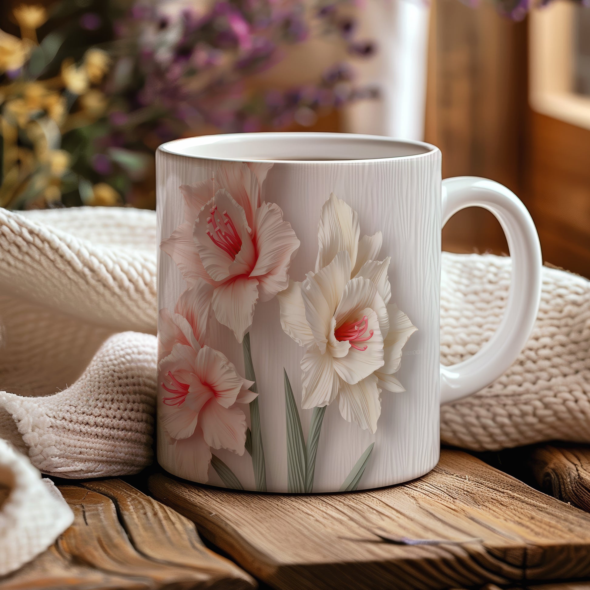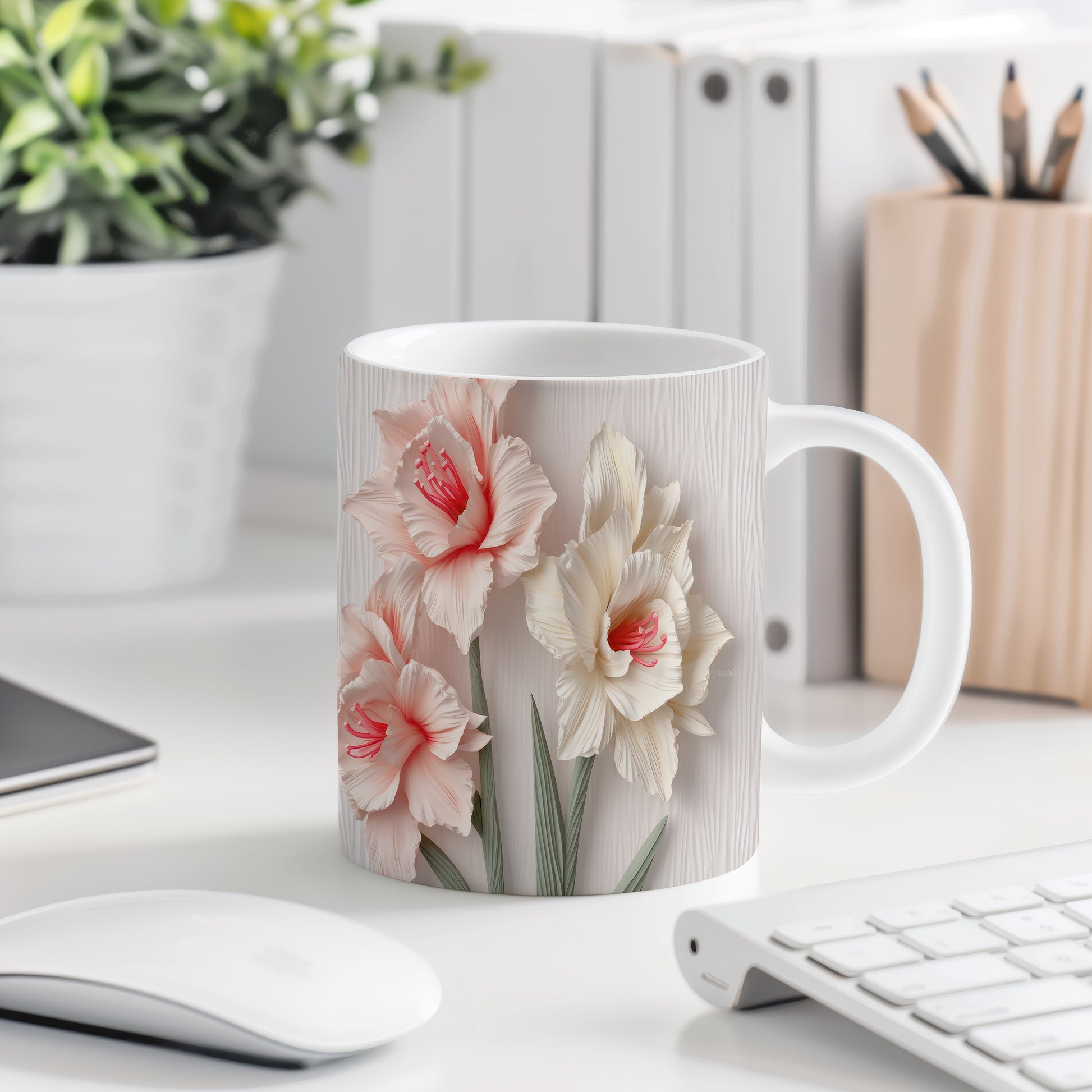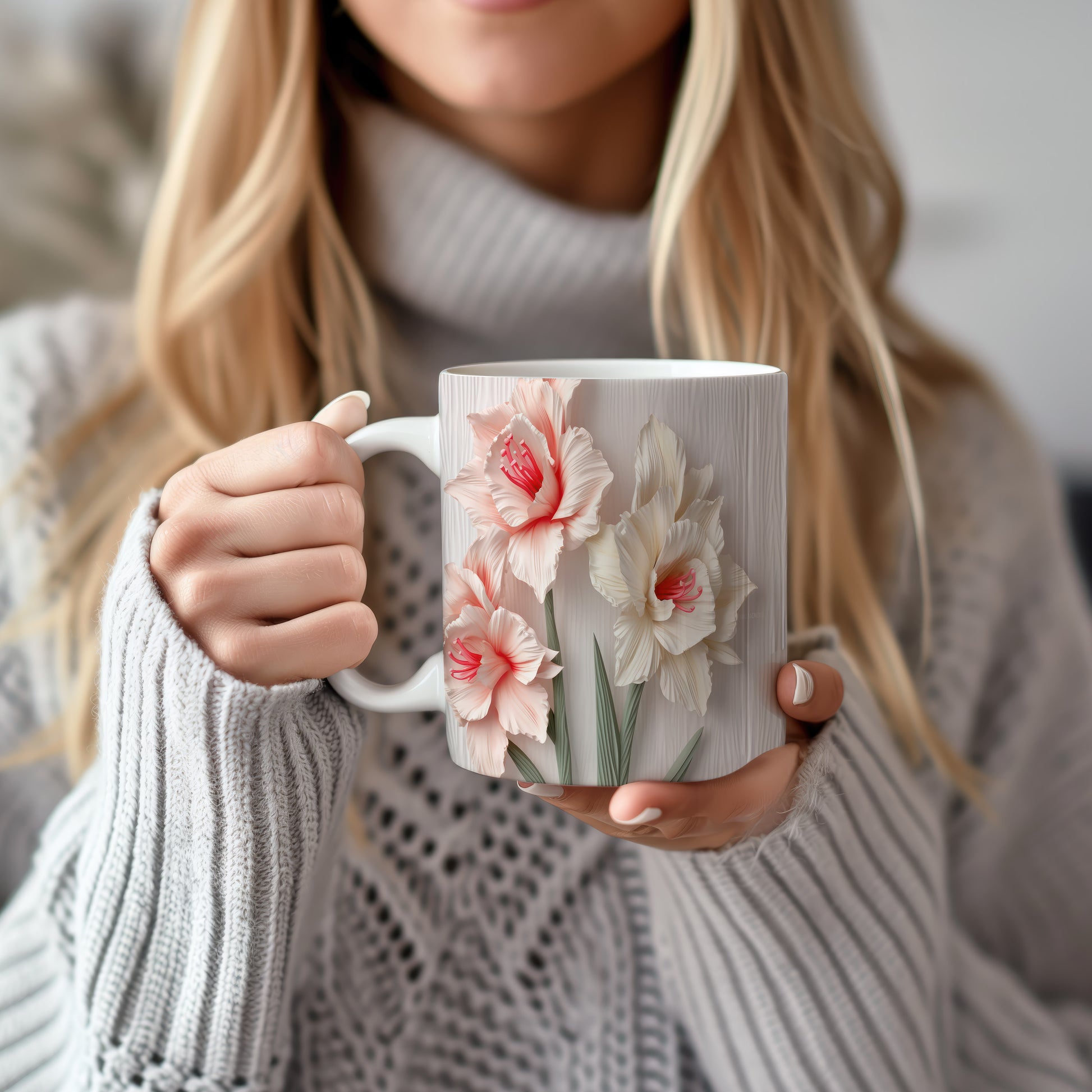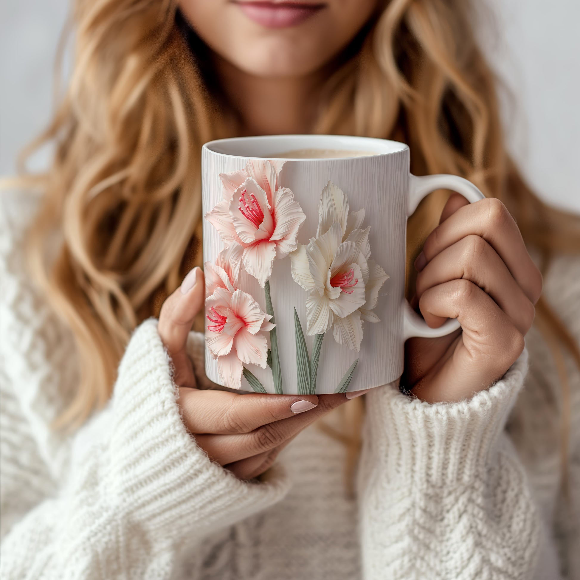 Hrnek se jemnými květinami v růžových tónech a roztomilým stylem