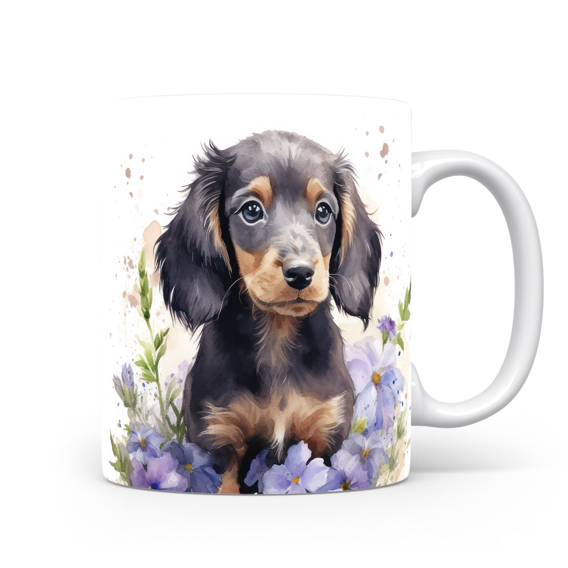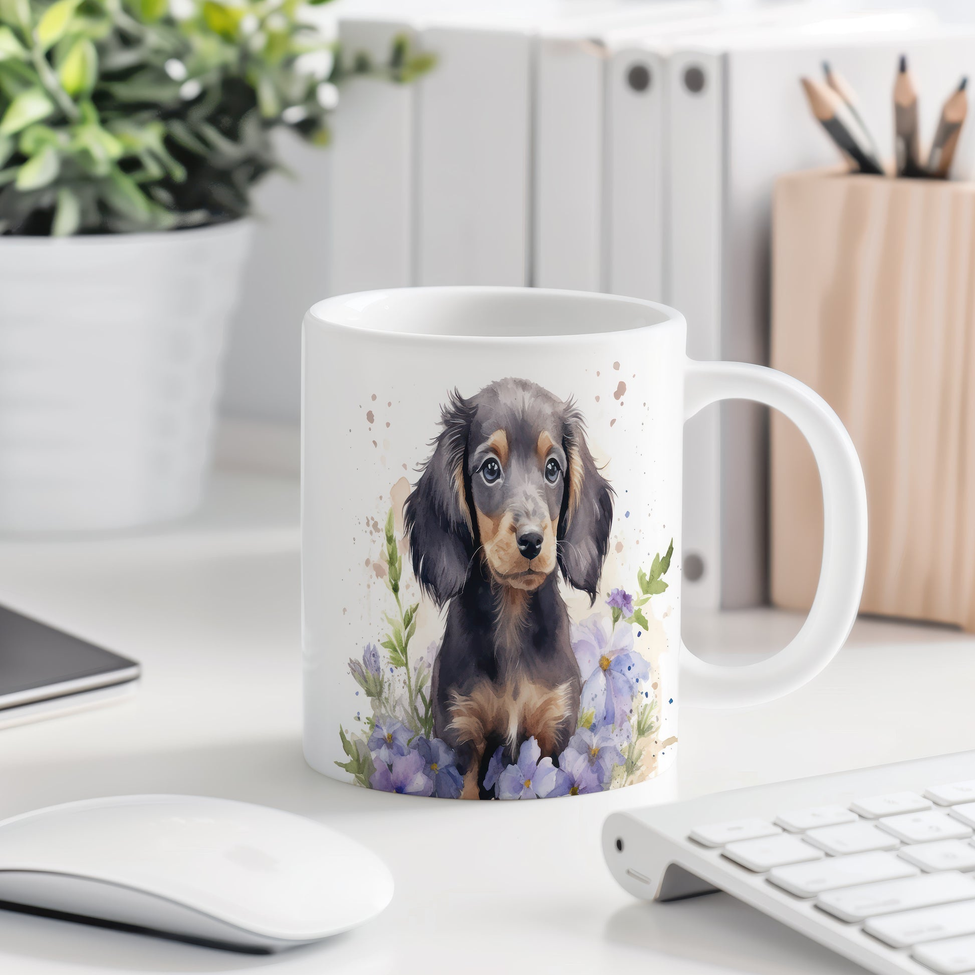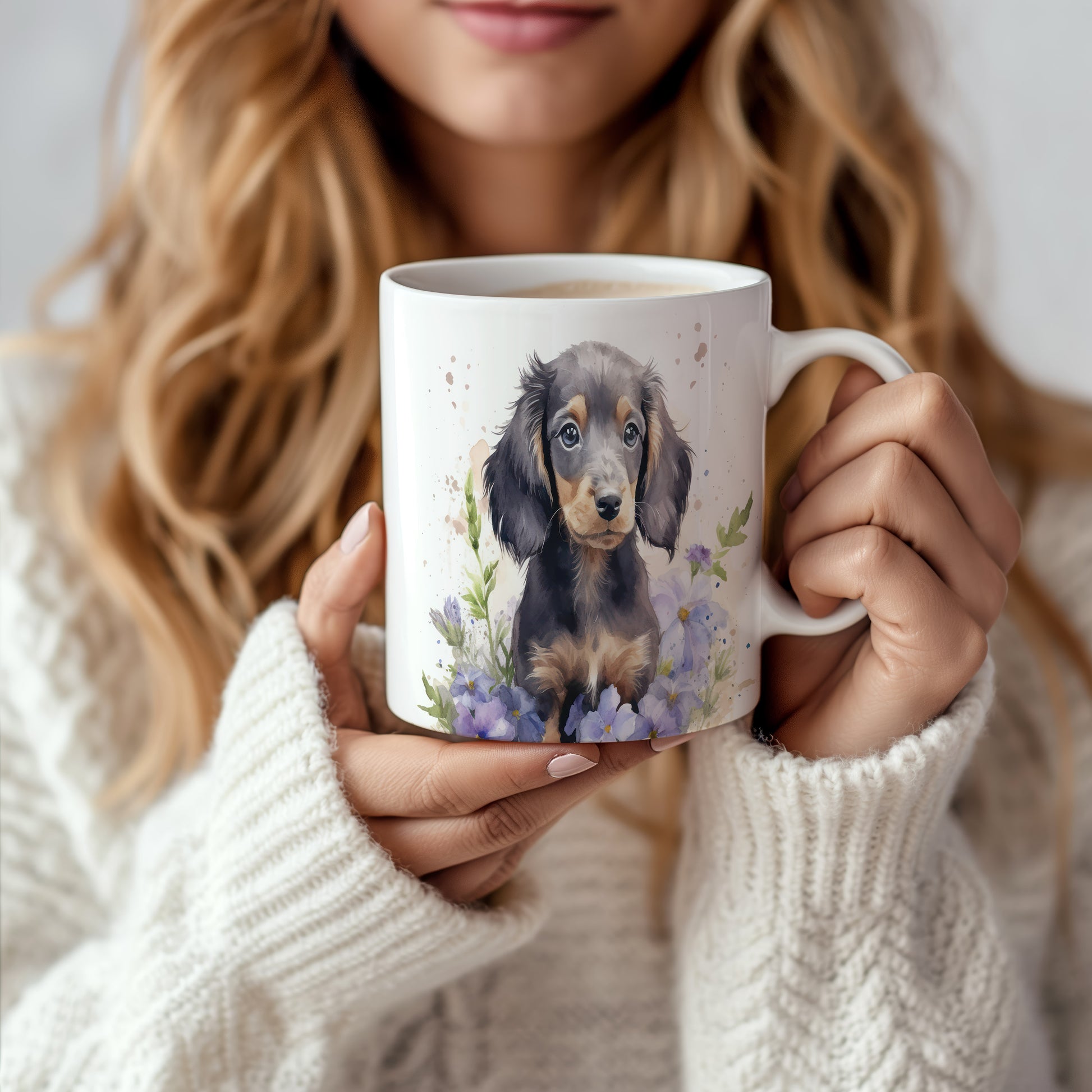 Hrnek se jezevčíkem a květinami v akvarelovém stylu