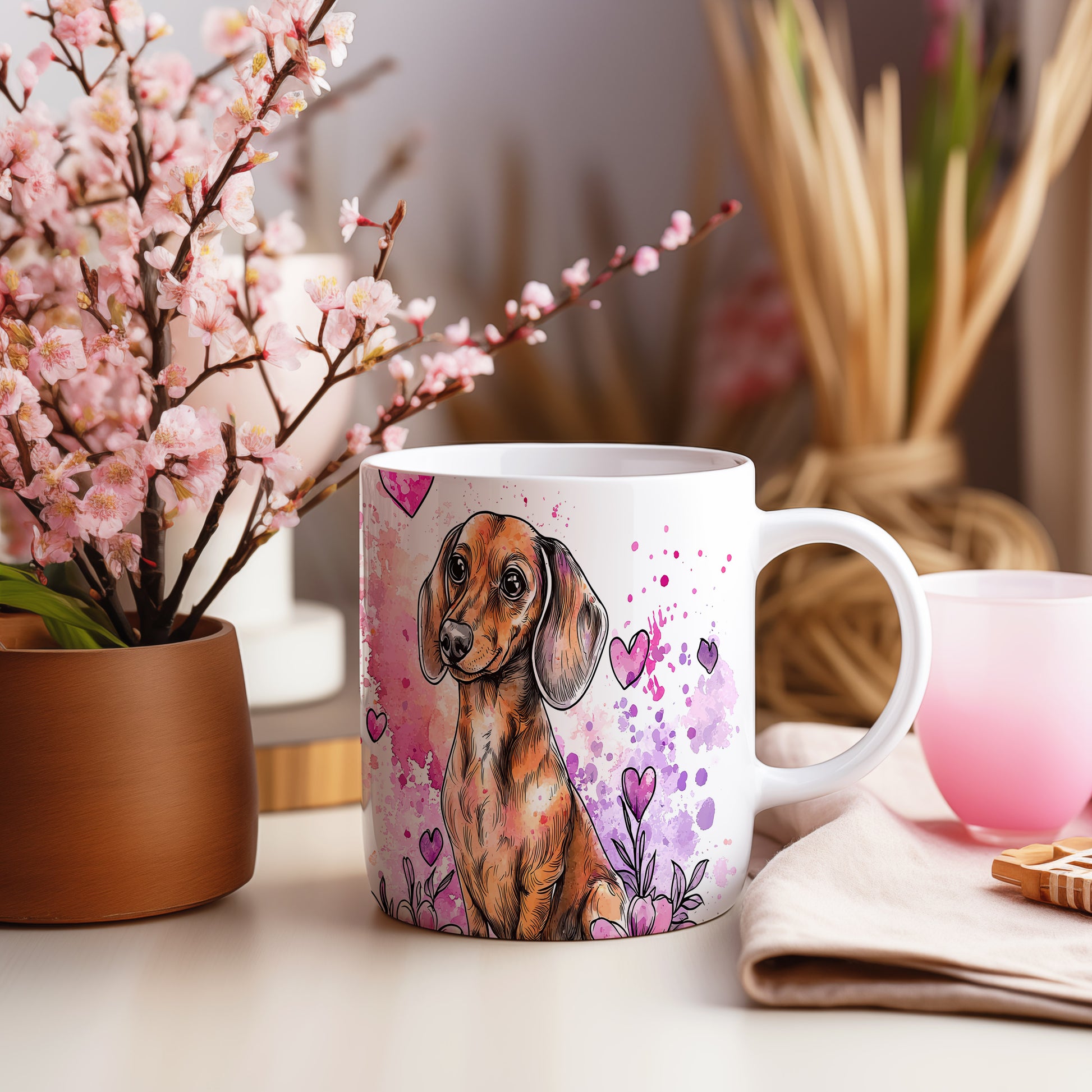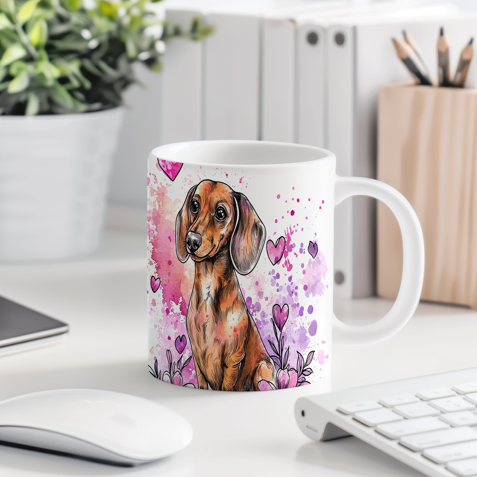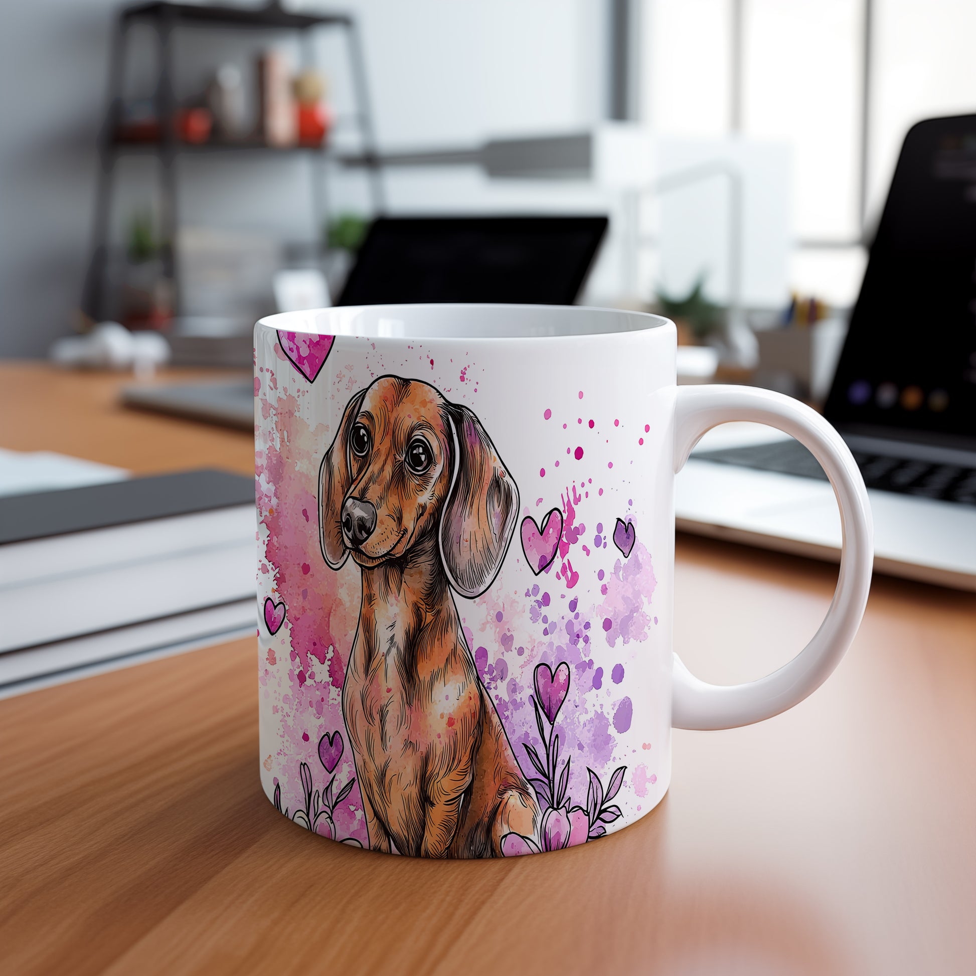 Hrnek se jezevčíkem na barevném pozadí