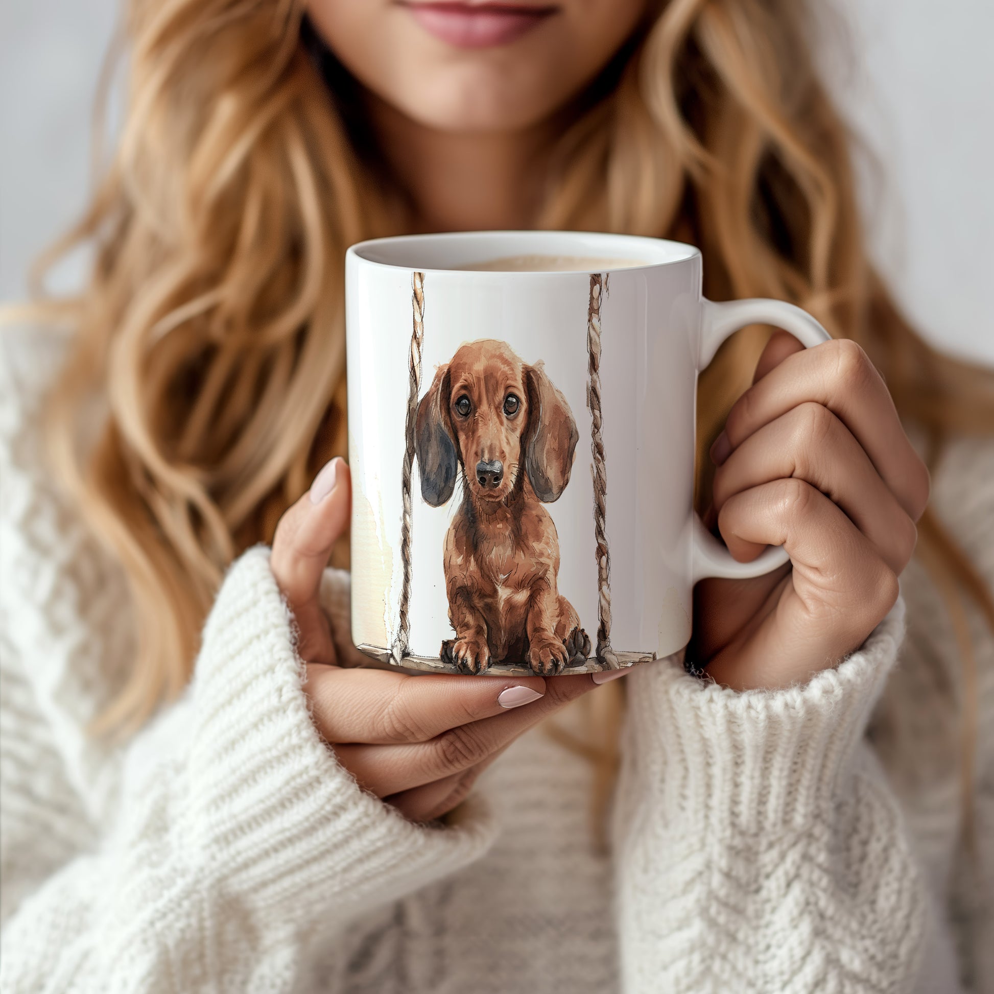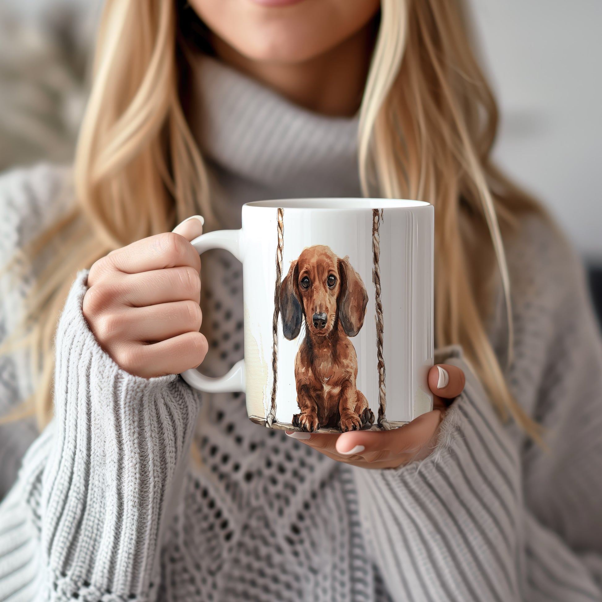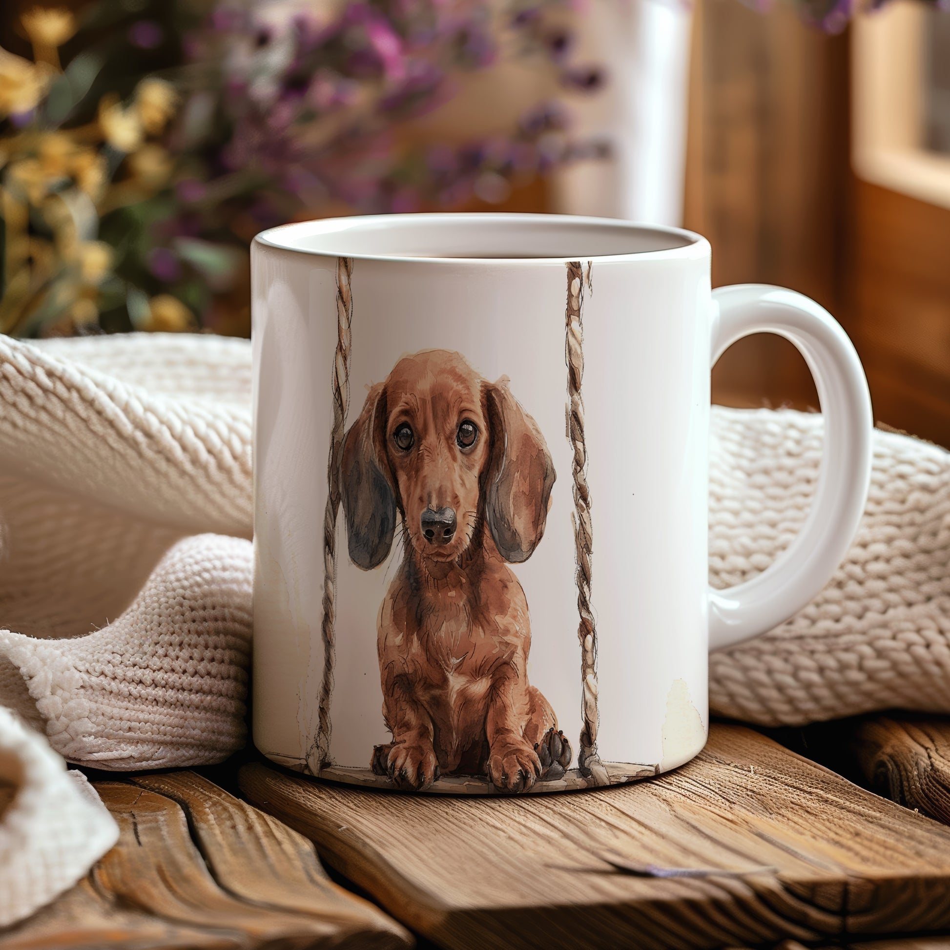 Hrnek se jezevčíkem na houpačce v hnědých tónech
