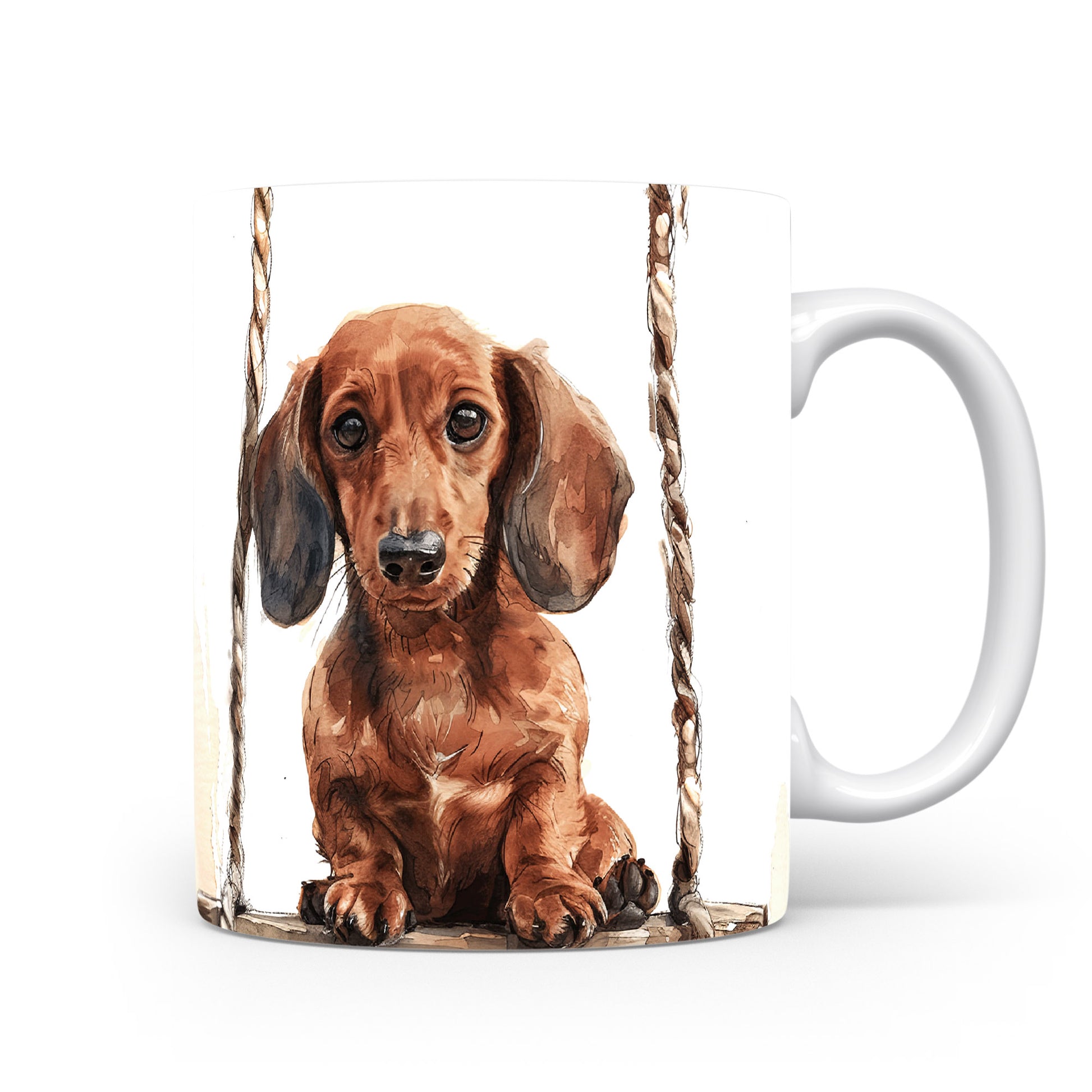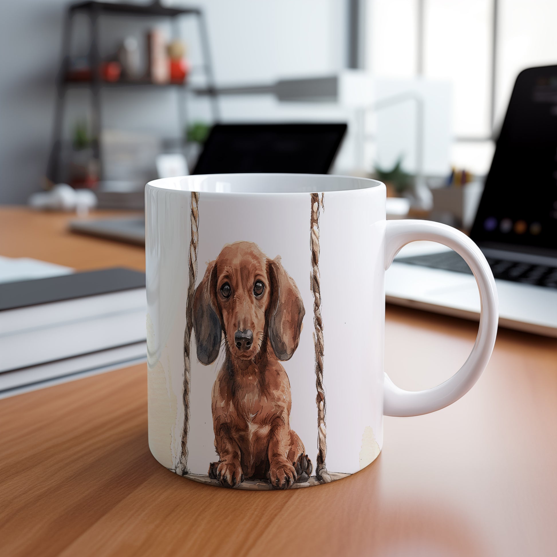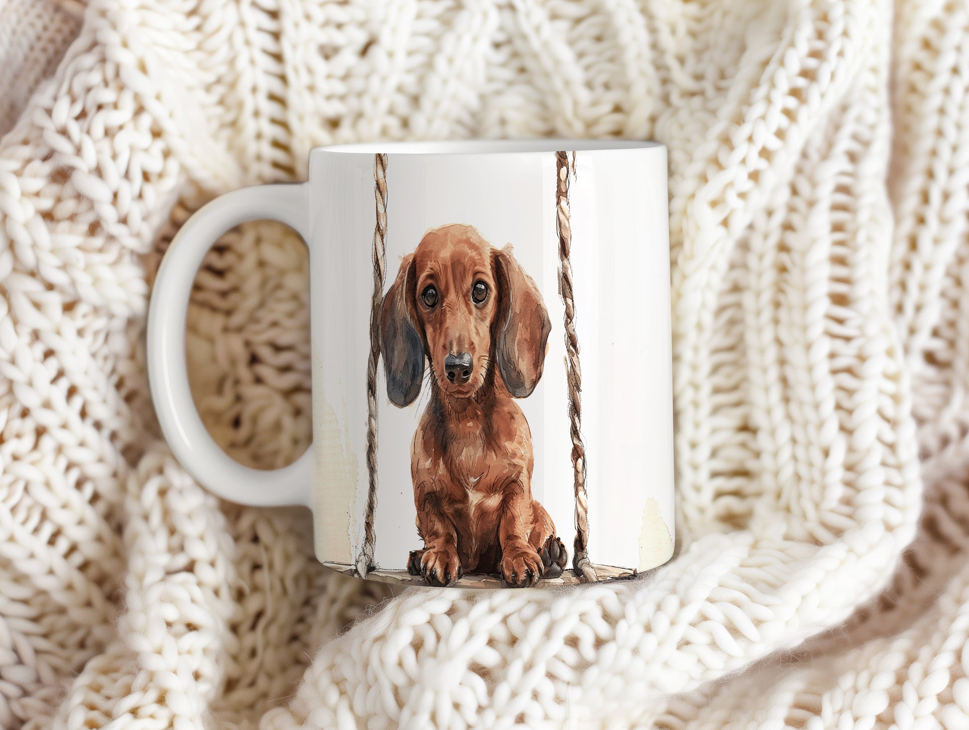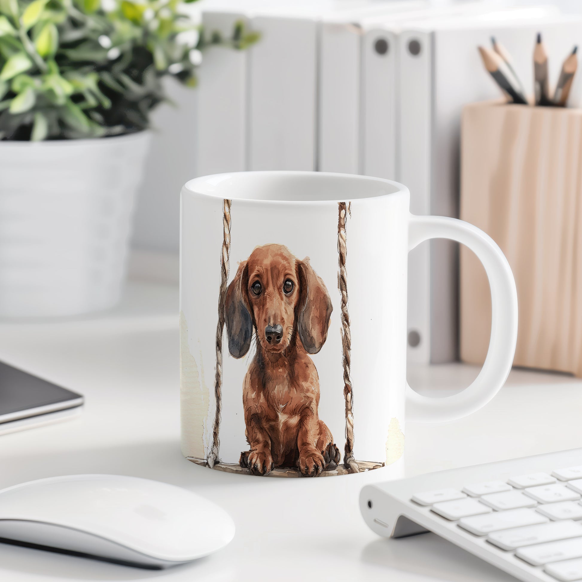 Hrnek se jezevčíkem na houpačce v hnědých tónech