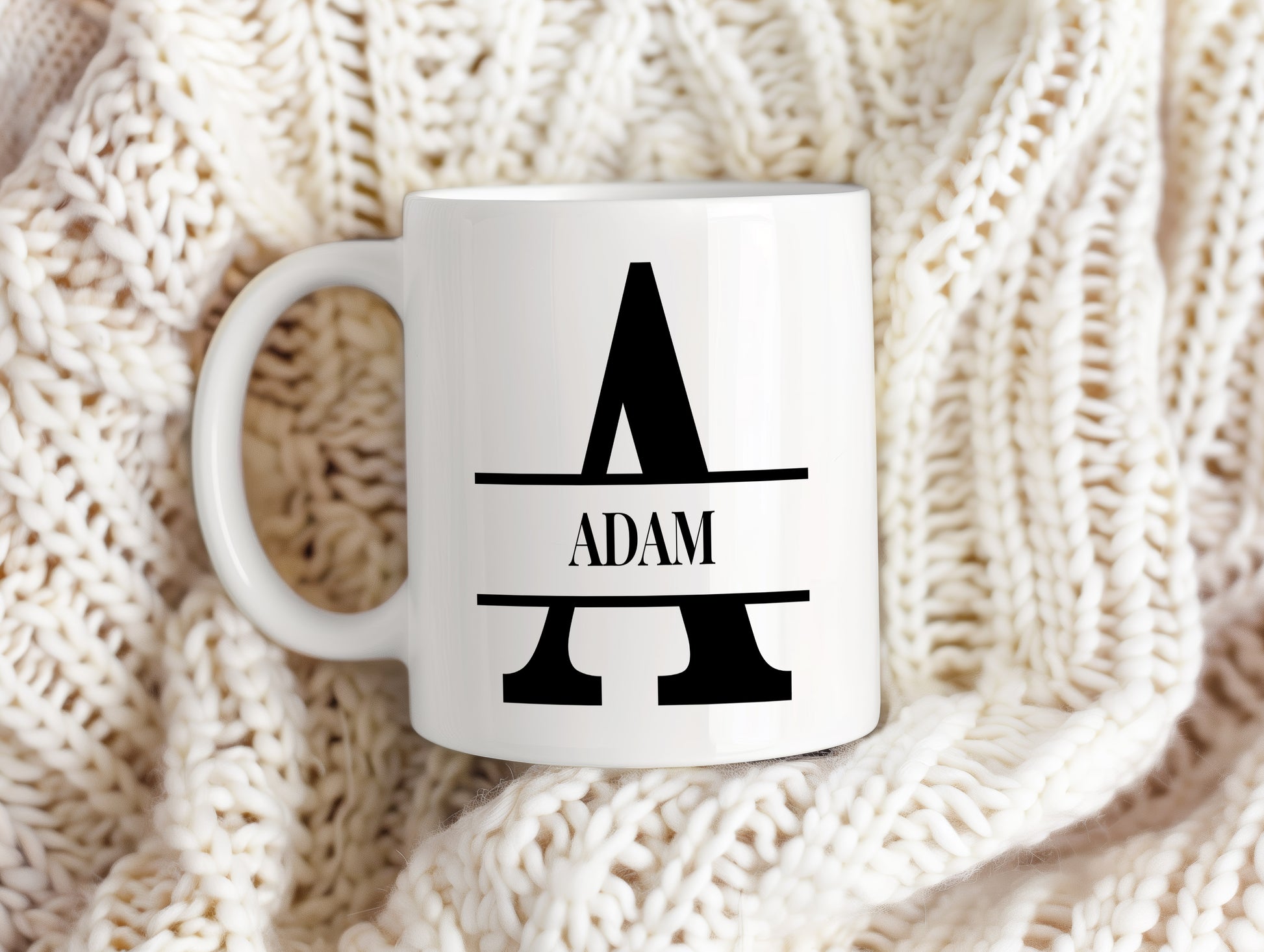 Stylový černobílý hrnek s iniciálou a jménem Adam v jednoduchém moderním designu. Elegantní osobní dárek pro muže.
