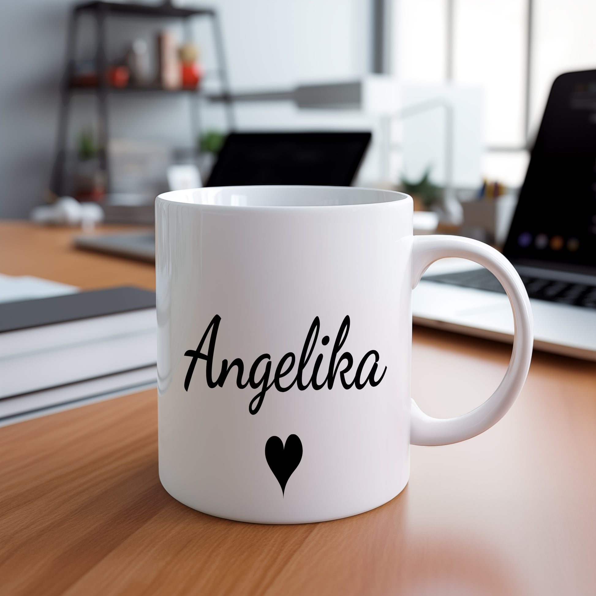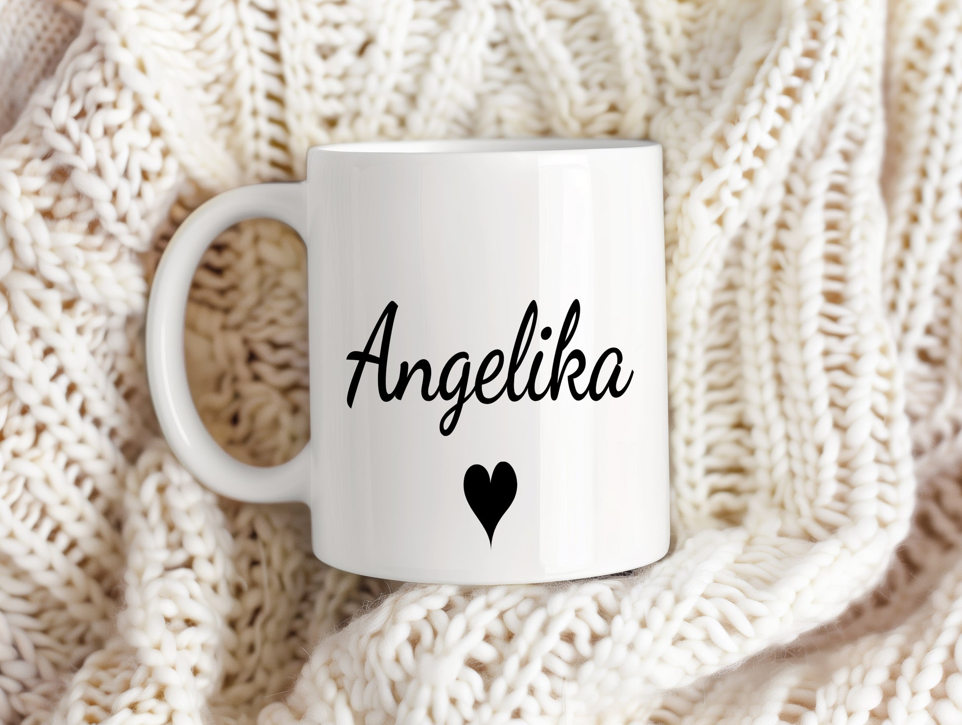 Romantický hrnek se jménem Angelika doplněný decentním symbolem ♥. Krásný dárek k Valentýnu i jen tak pro radost.