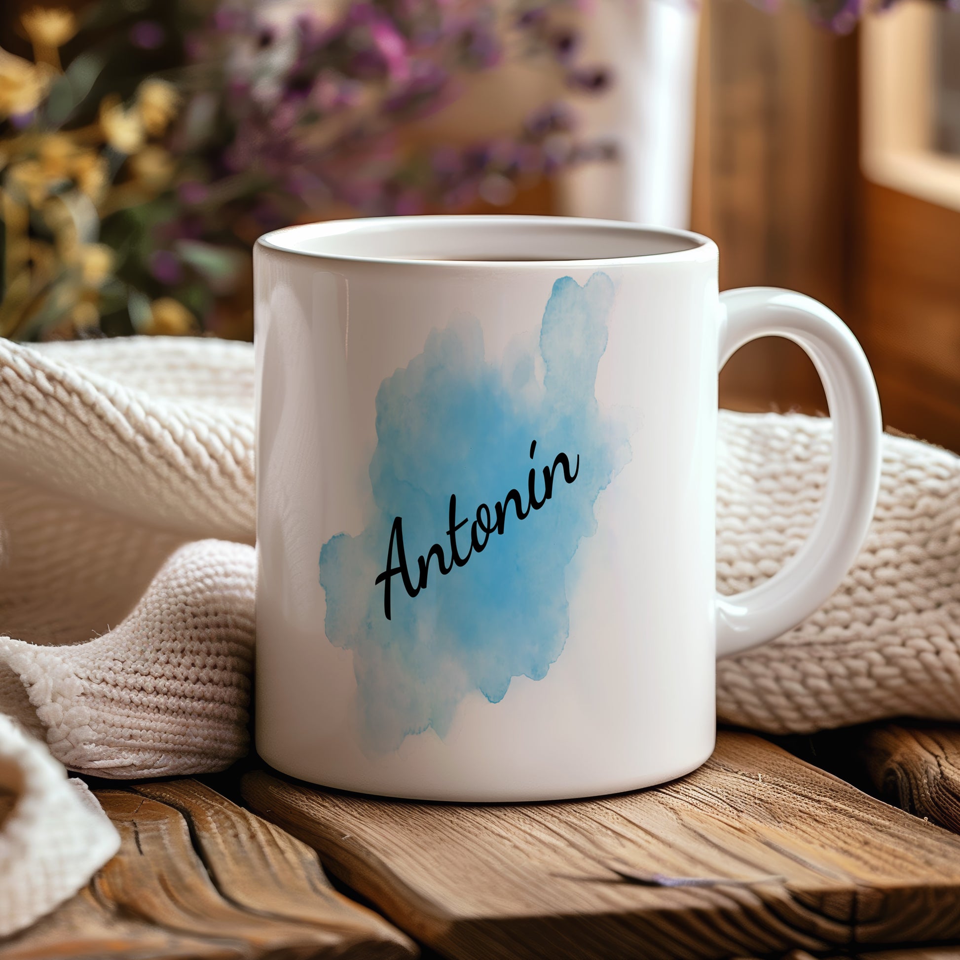 Originální hrnek se jménem Antonín s modrým akvarelovým podkladem. Svěží design pro každý den.