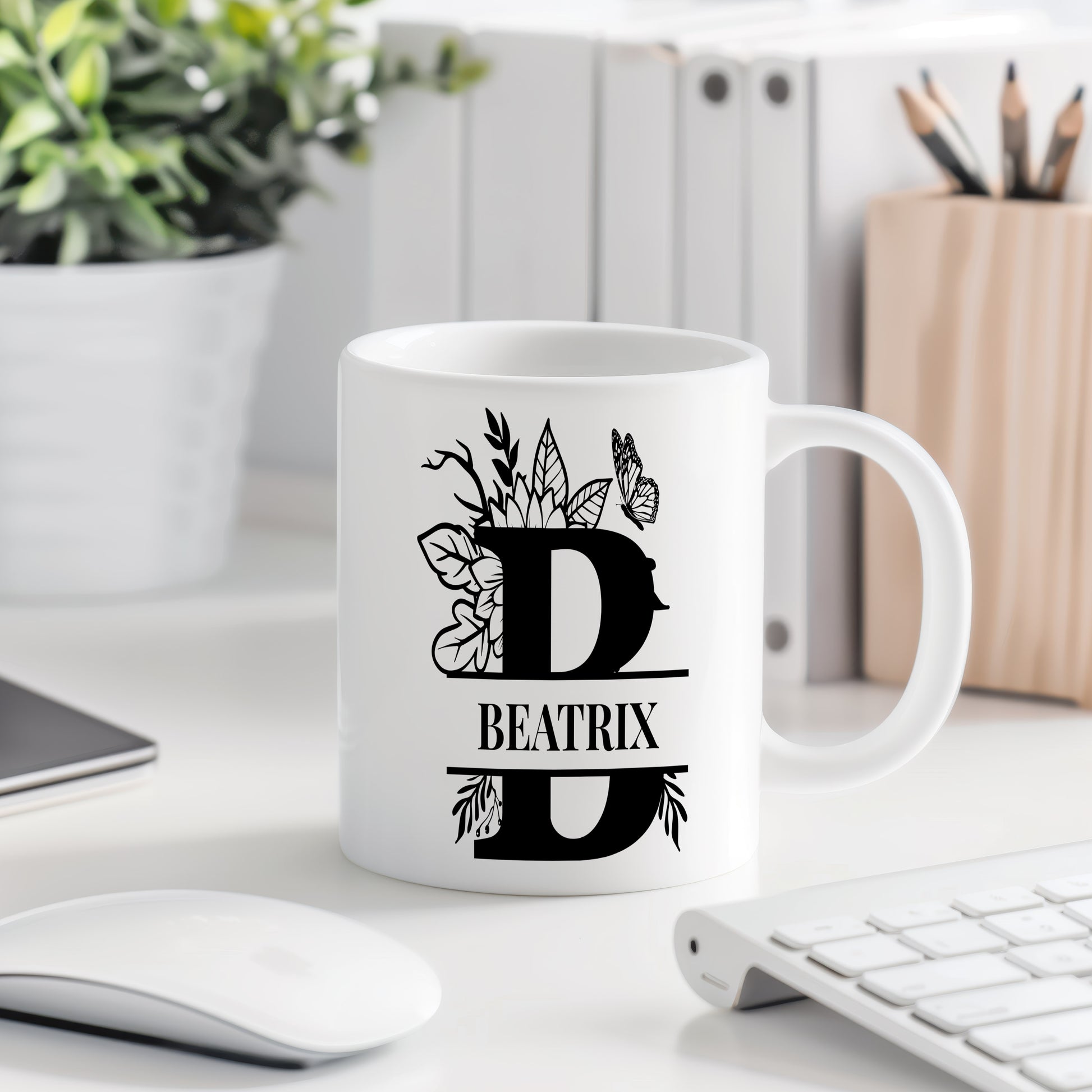 Elegantní hrnek se jménem Beatrix s monogramem zdobeným jemnými květinami. Skvělý osobní dárek pro ženy.