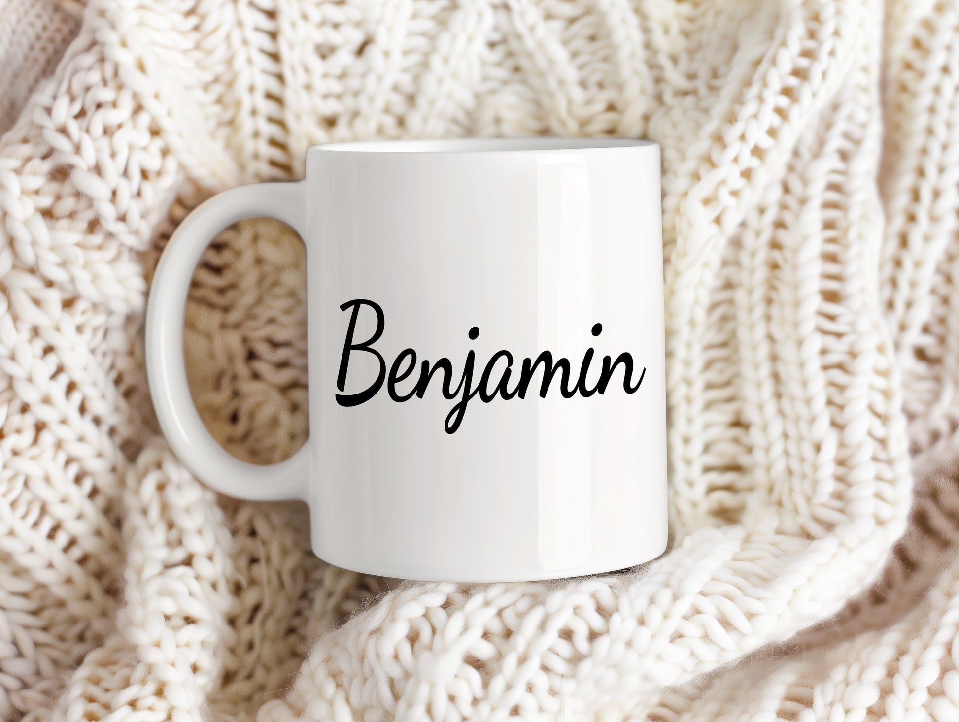 Jednoduchý bílý hrnek se jménem Benjamin v čistém moderním fontu. Praktický dárek do kanceláře i domů.